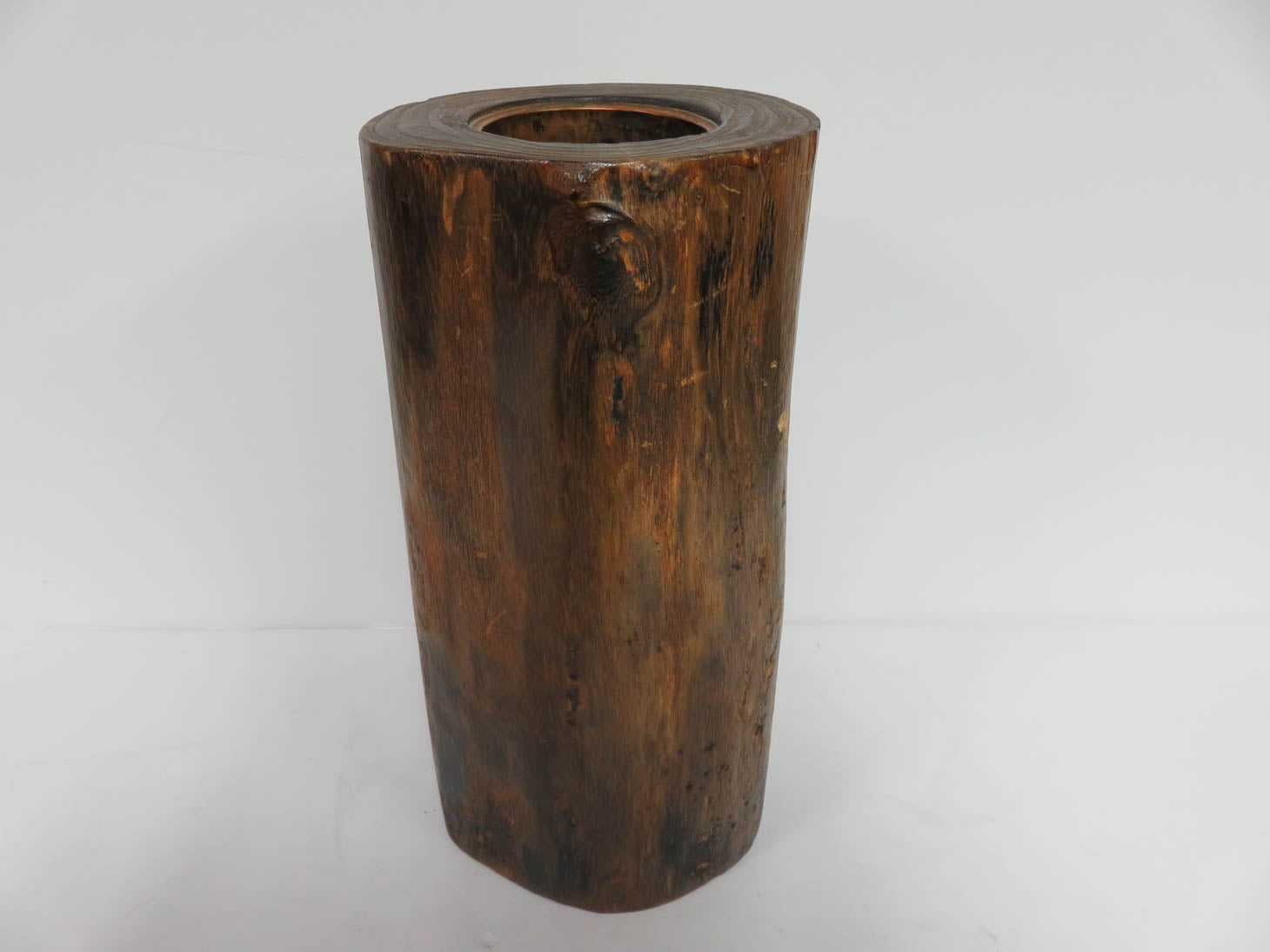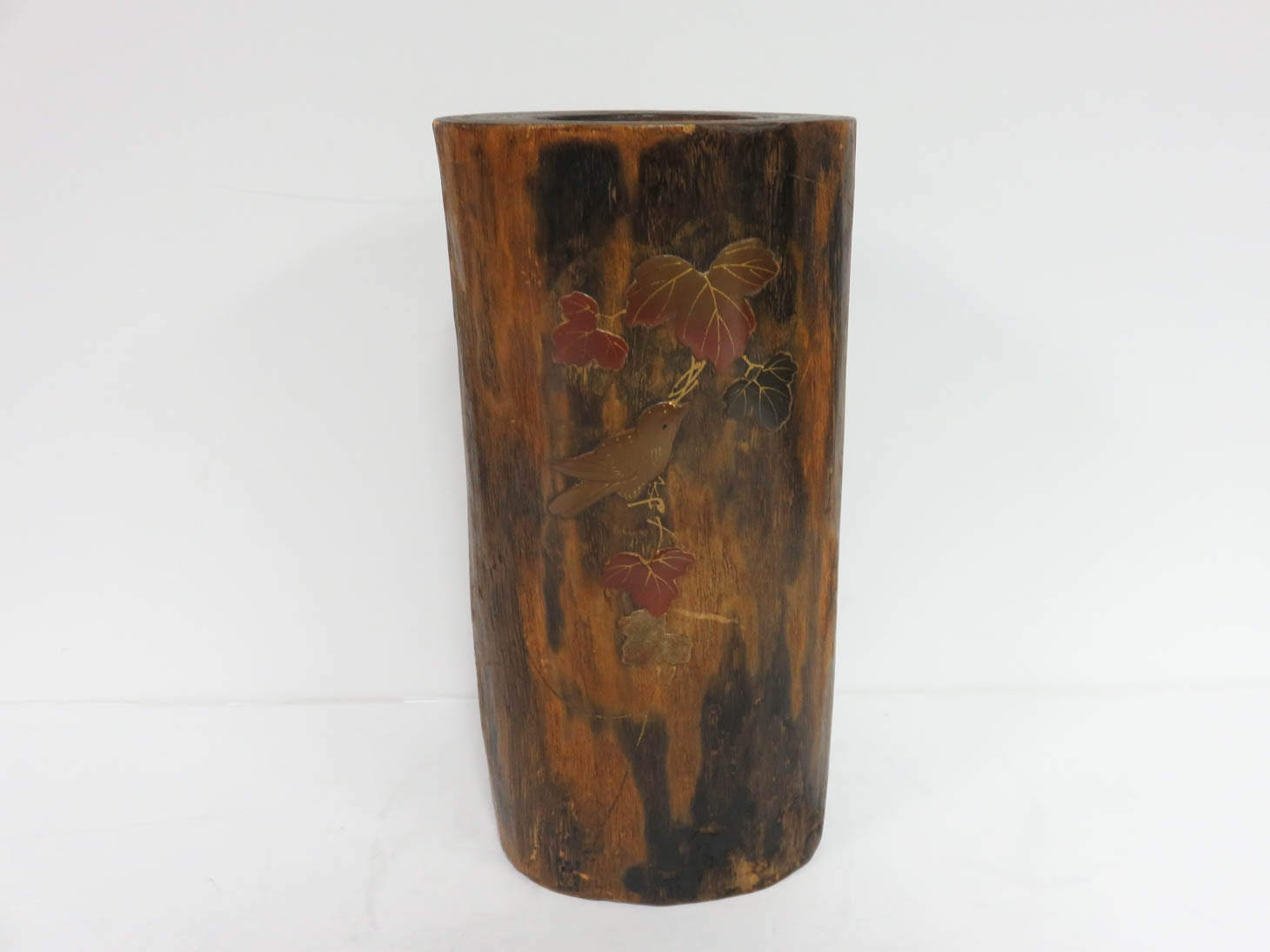Item Number: 18665-75 Kiri wood, hand carved tree trunk vase with enamel bird and leaf, irregular shape, copper liner 5.5" x 5" x 11.5"