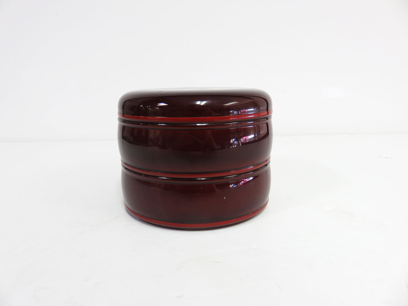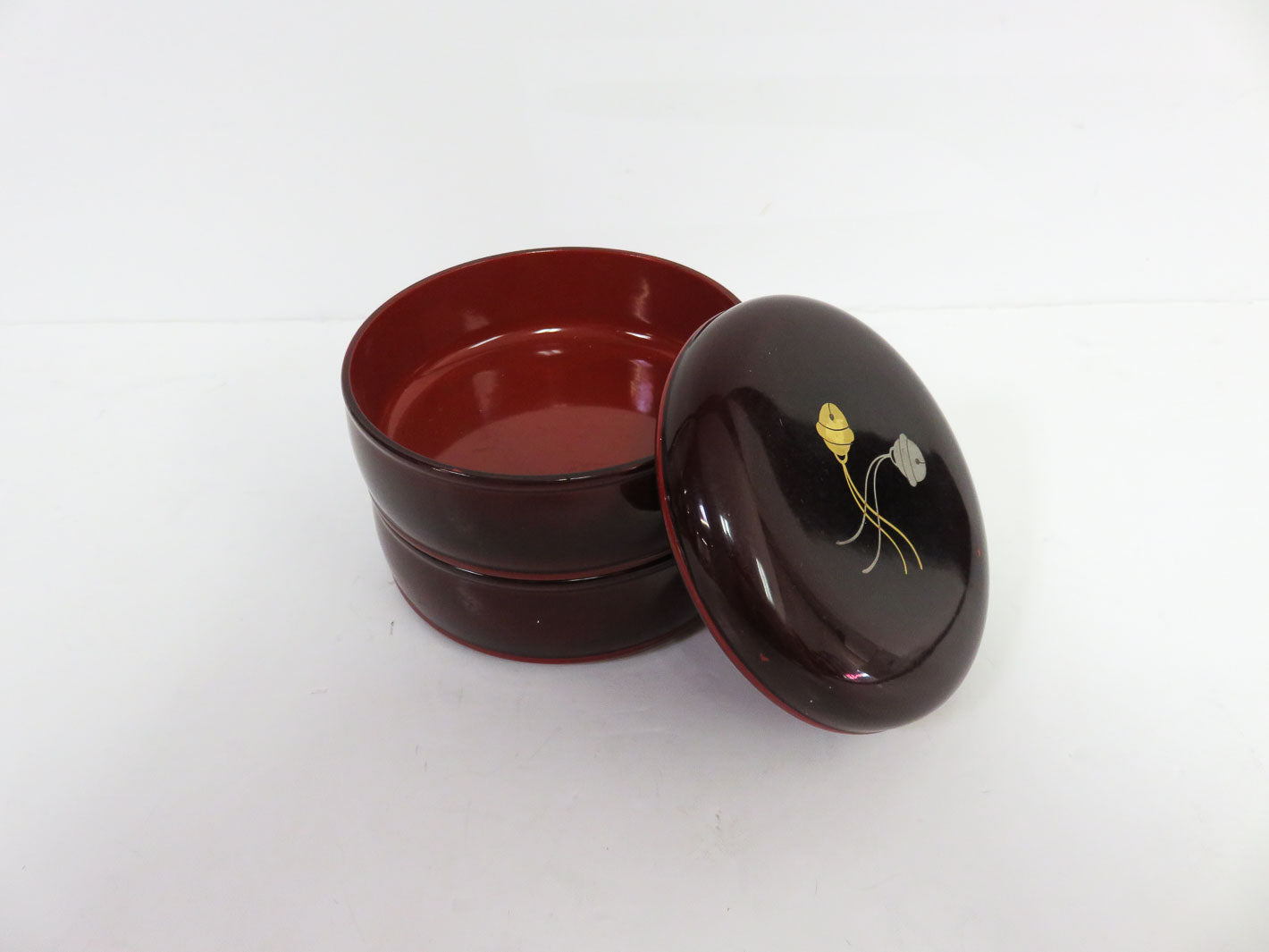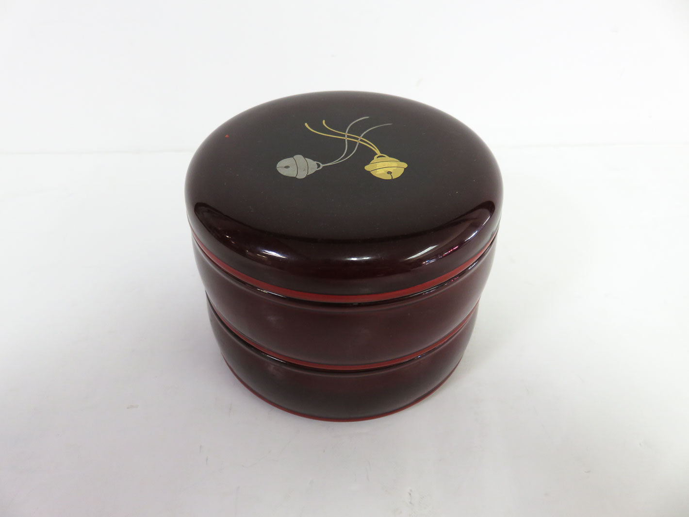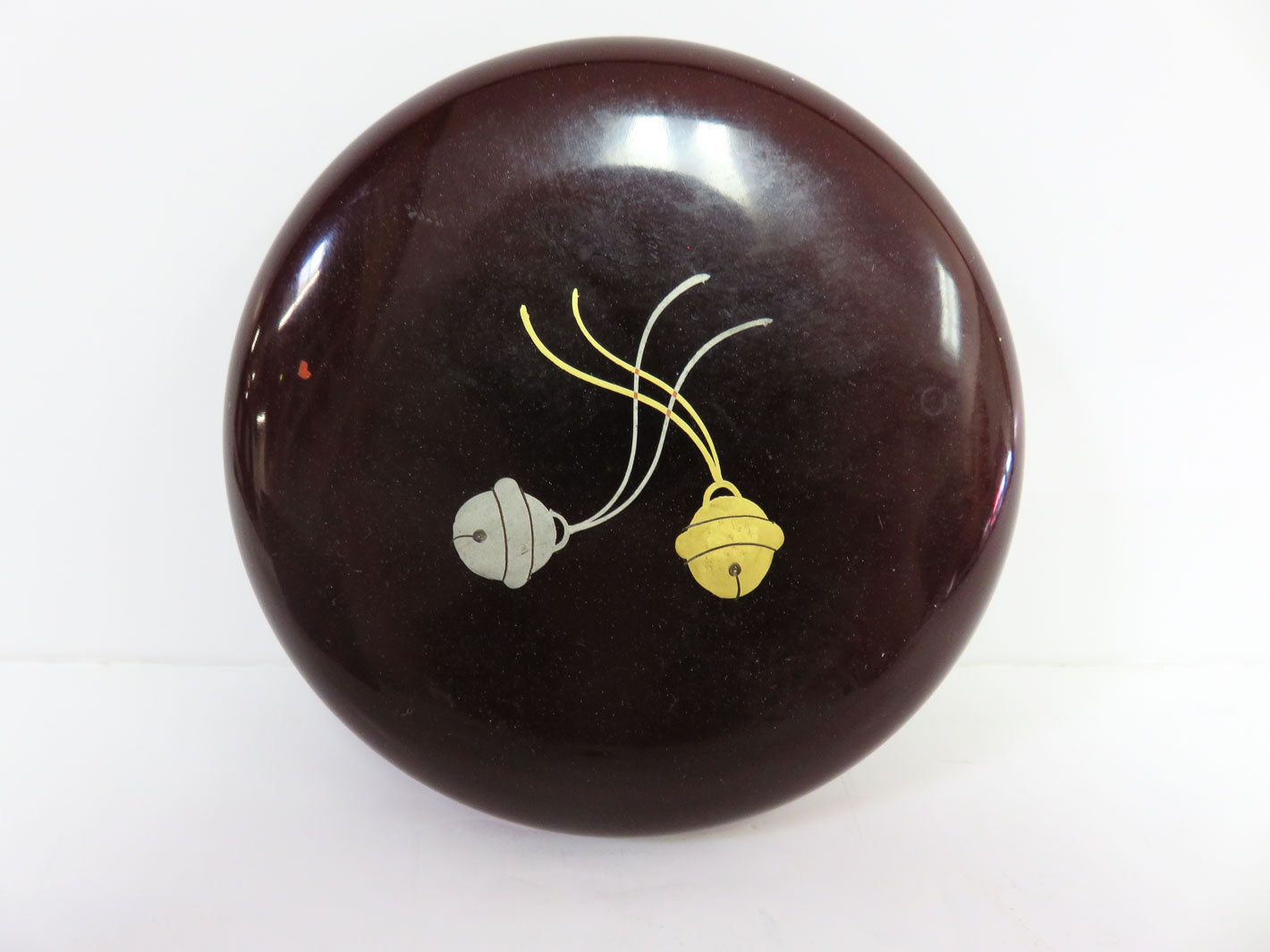 Item Number: 8217-15 Two stacking boxes with bell design on lid, vintage Japan, 3pc, small chip on lid 4.5" x 3.5" H