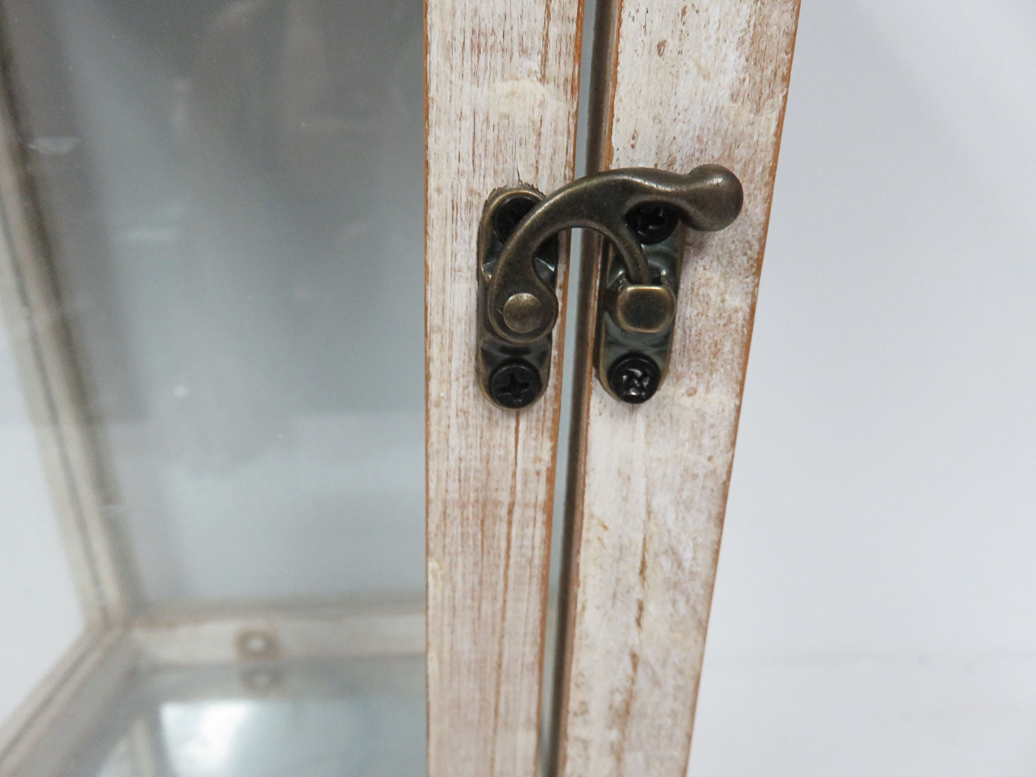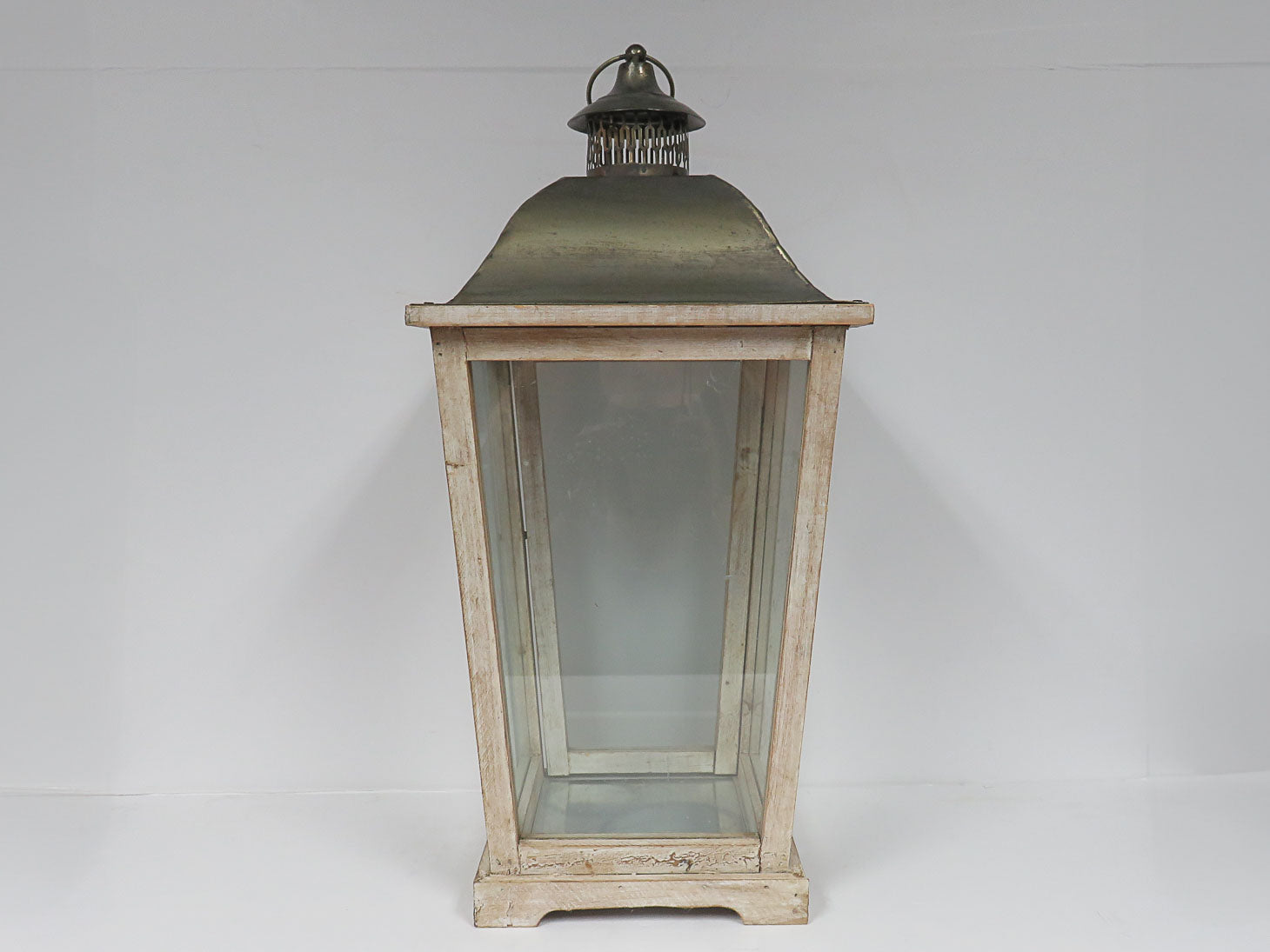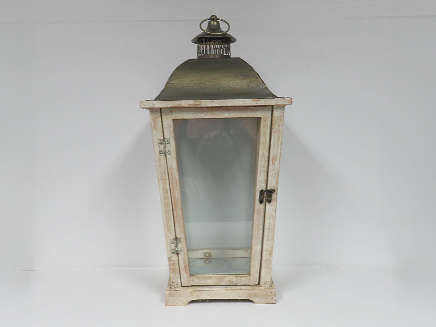 Item Number: 7468-48 Wood lantern with glass panel and distressed gold finishes on top. Metal door closure. 10.5" x 10.5" x 23"