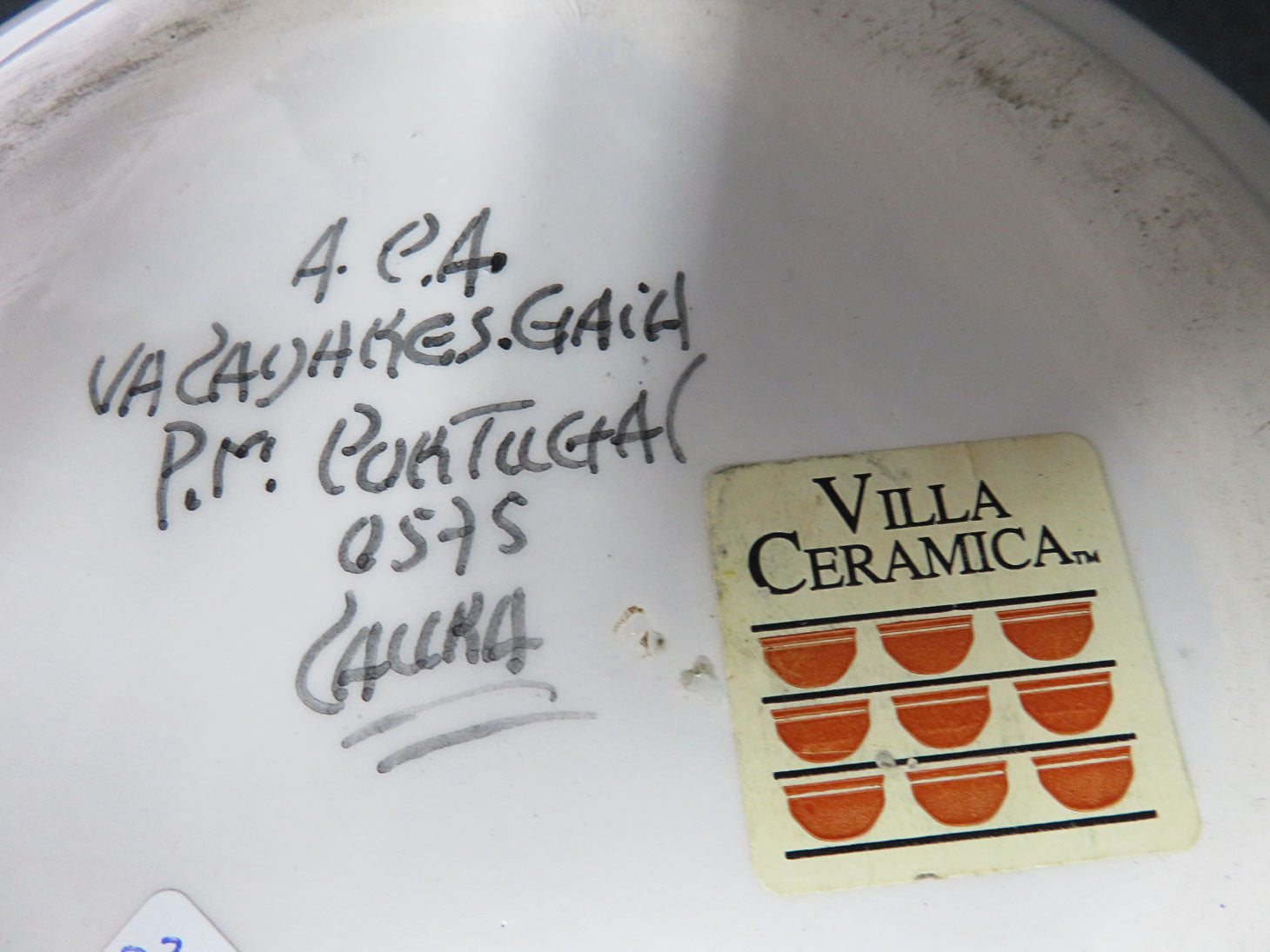 Lattice cut out design, hand painted pink flowers with blue accent, scalloped rim