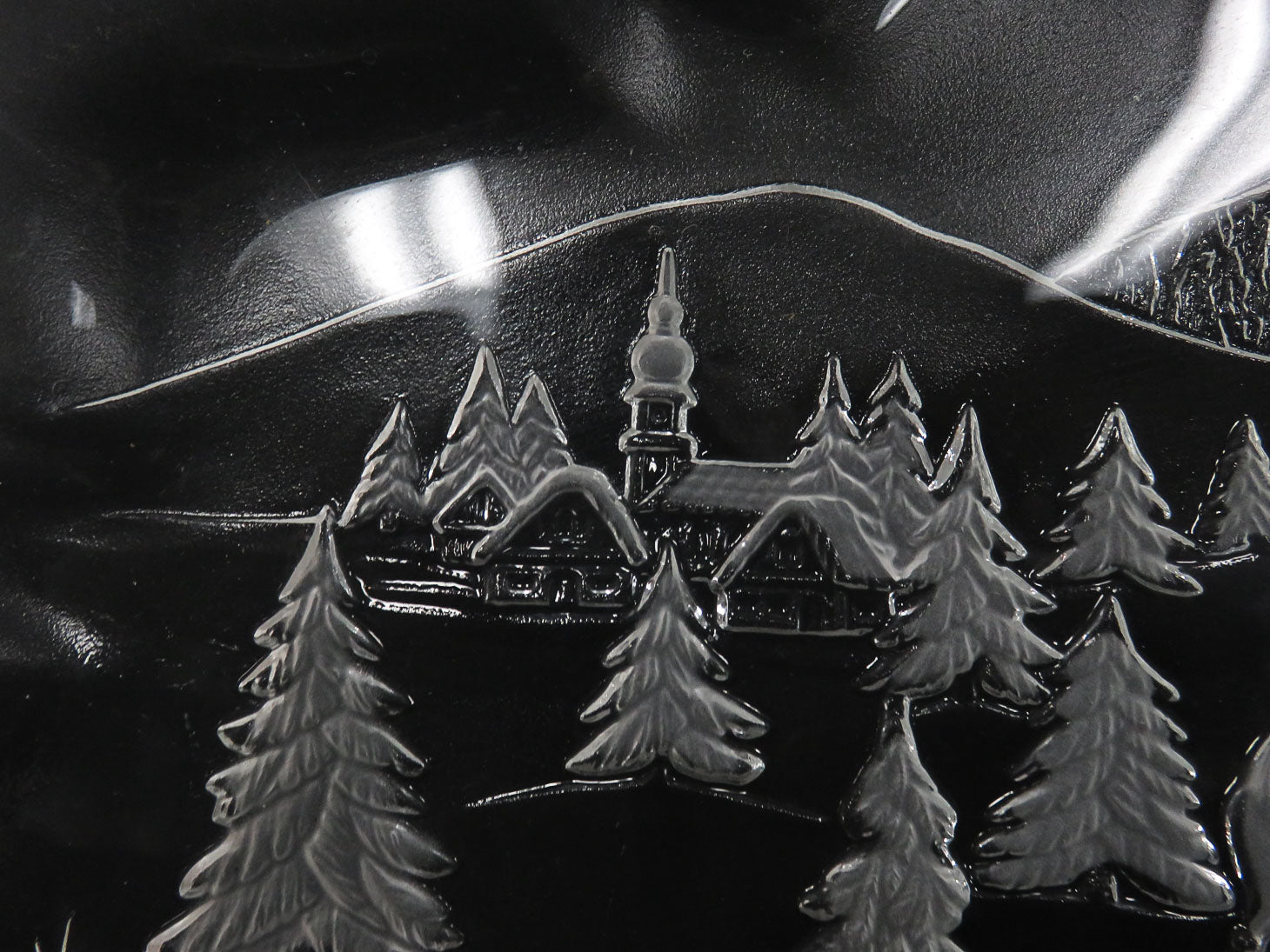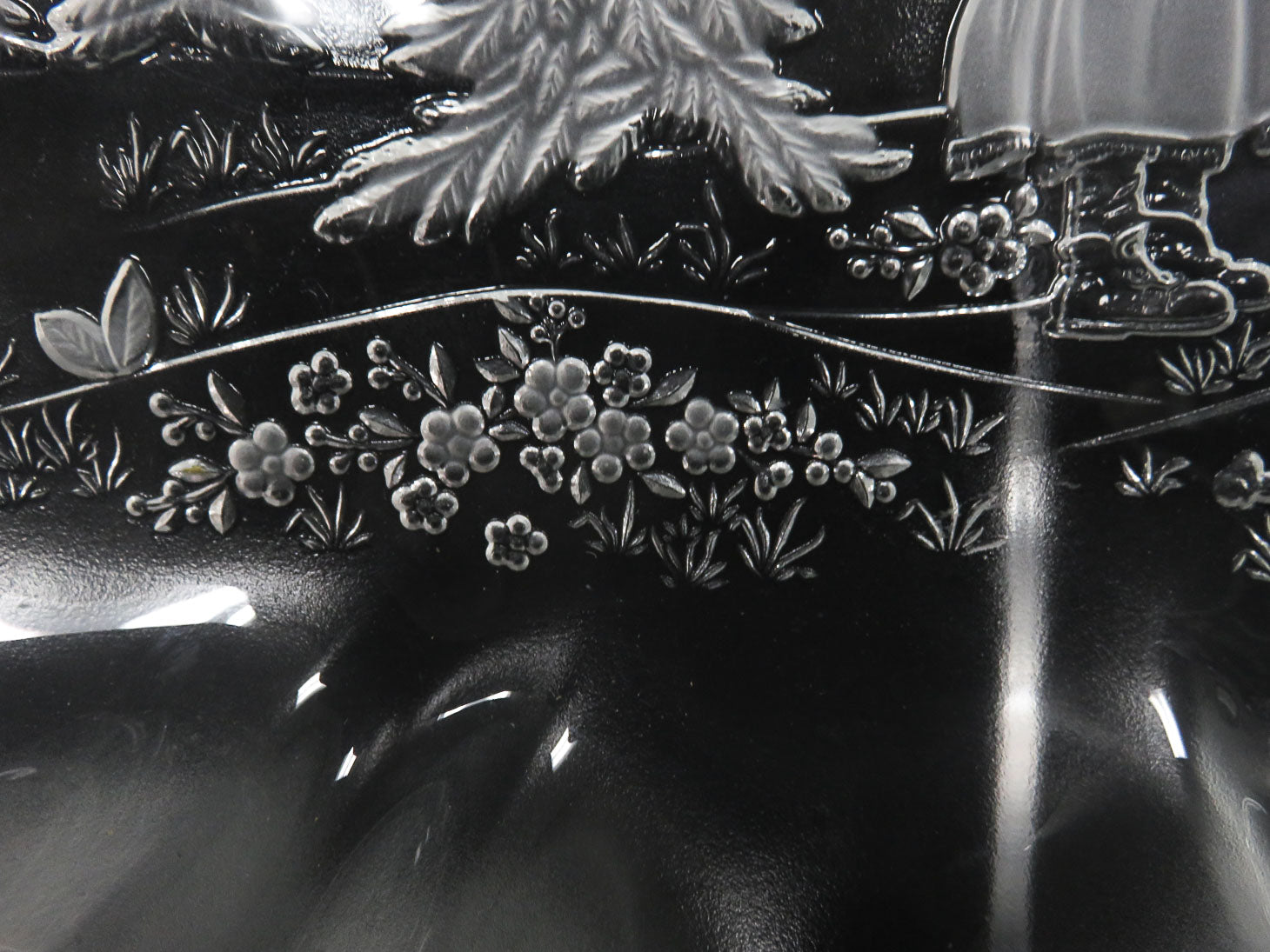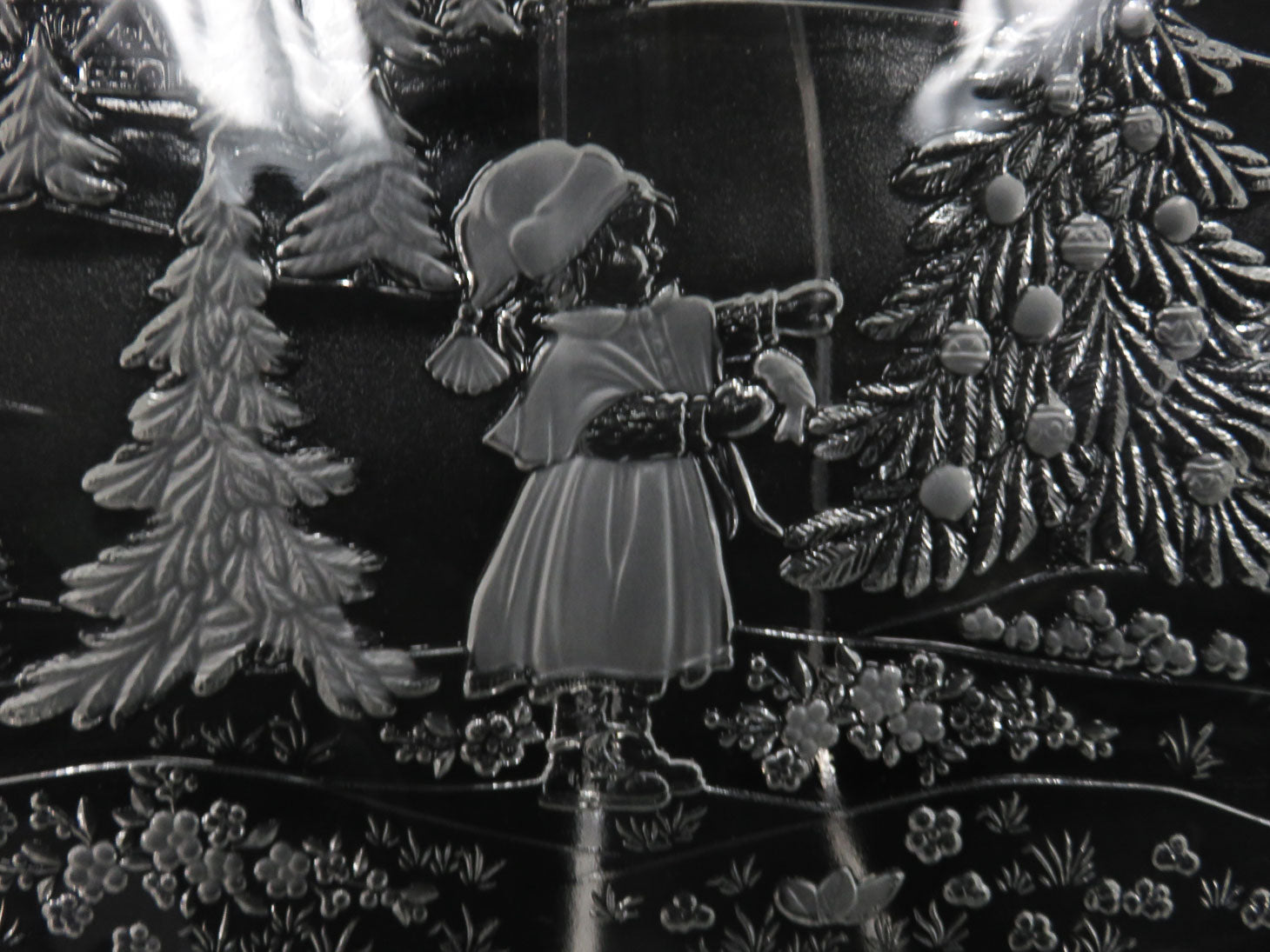 Oval, with etched, raised scene of child decorating Christmas Tree, ruffled edge 17.25" x 12.25"