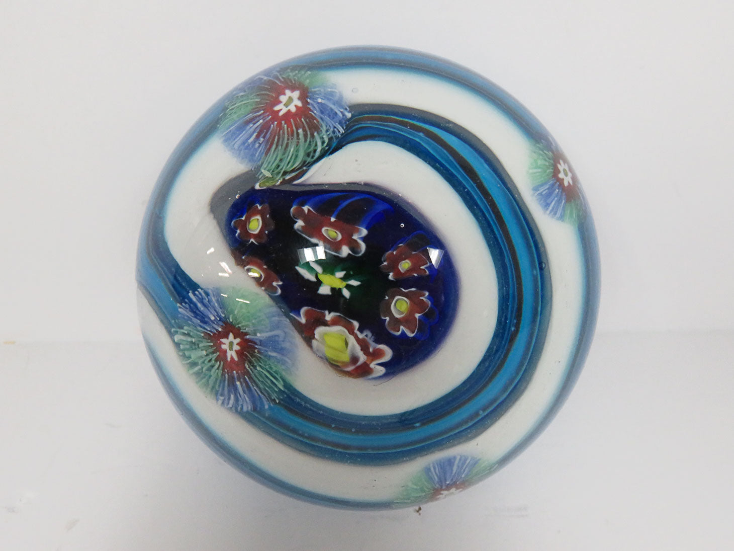 clear with blue and white swirl and millefiori