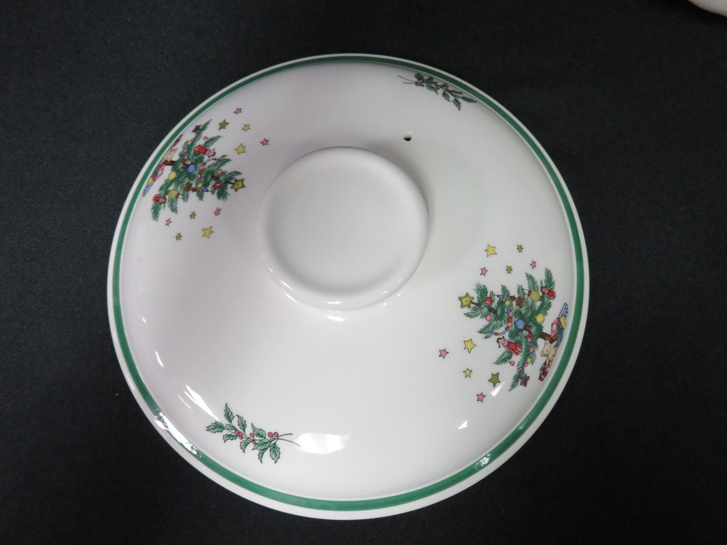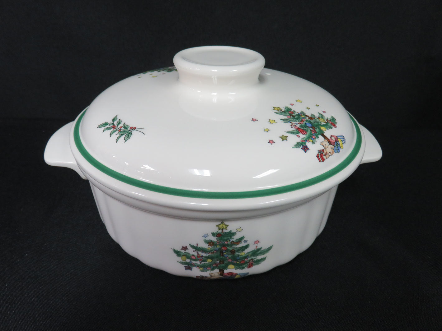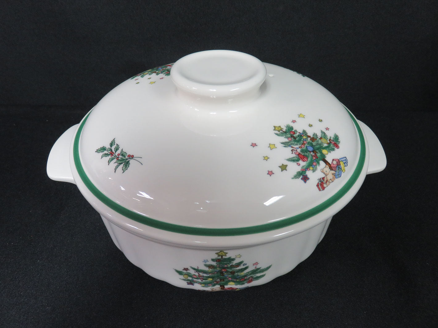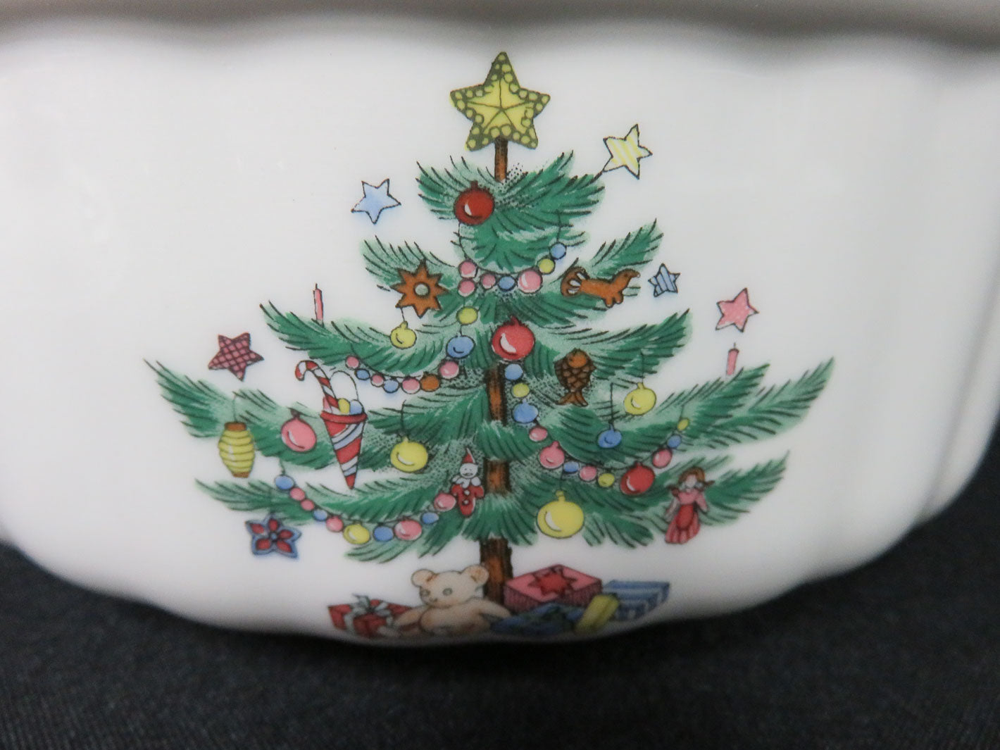 "Happy Holidays" tree with presents and teddy bear, ribbed dish, with handles, 2 pc