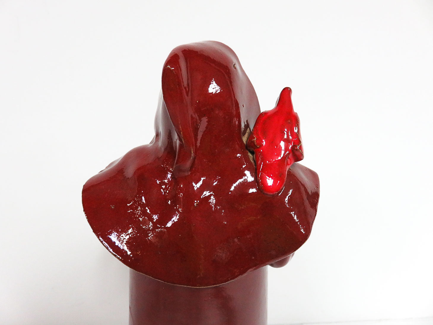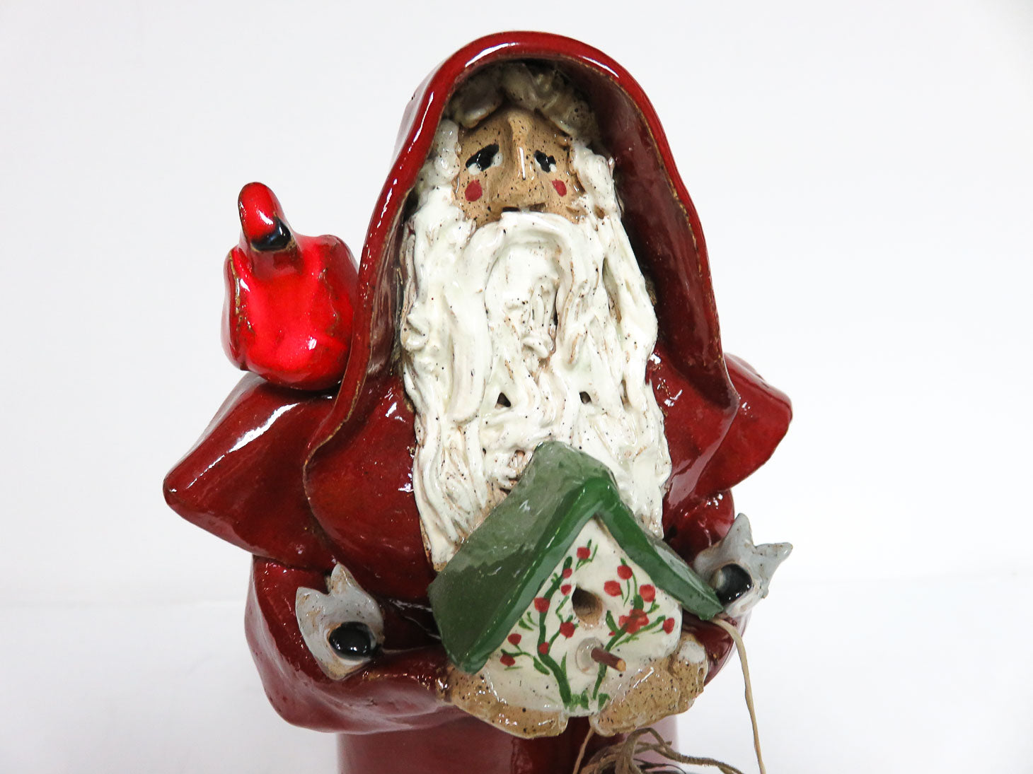 Artist crafted Santa in red robe with birds, bird house and basket. 1999 Sharpesville, Indiana.