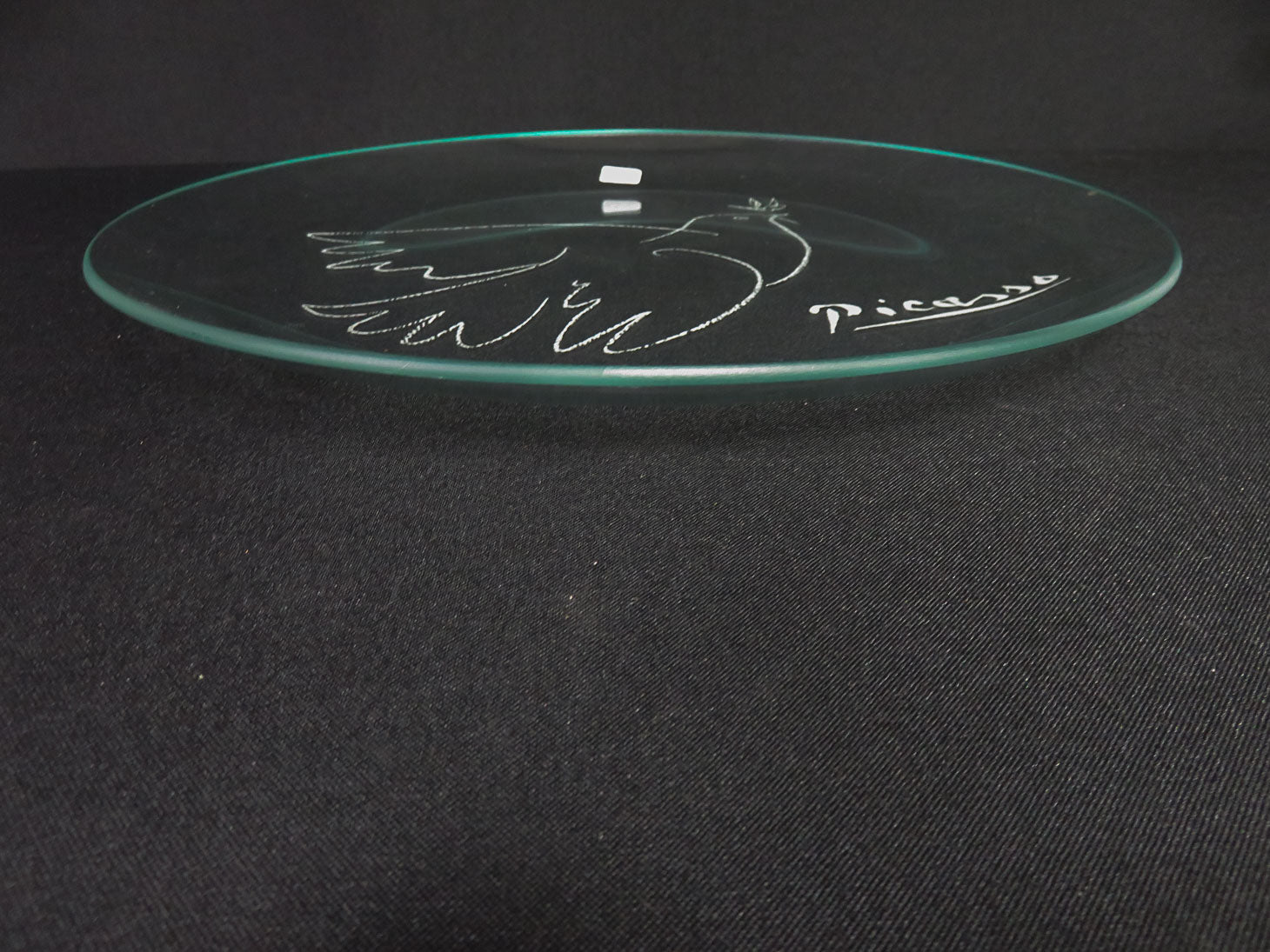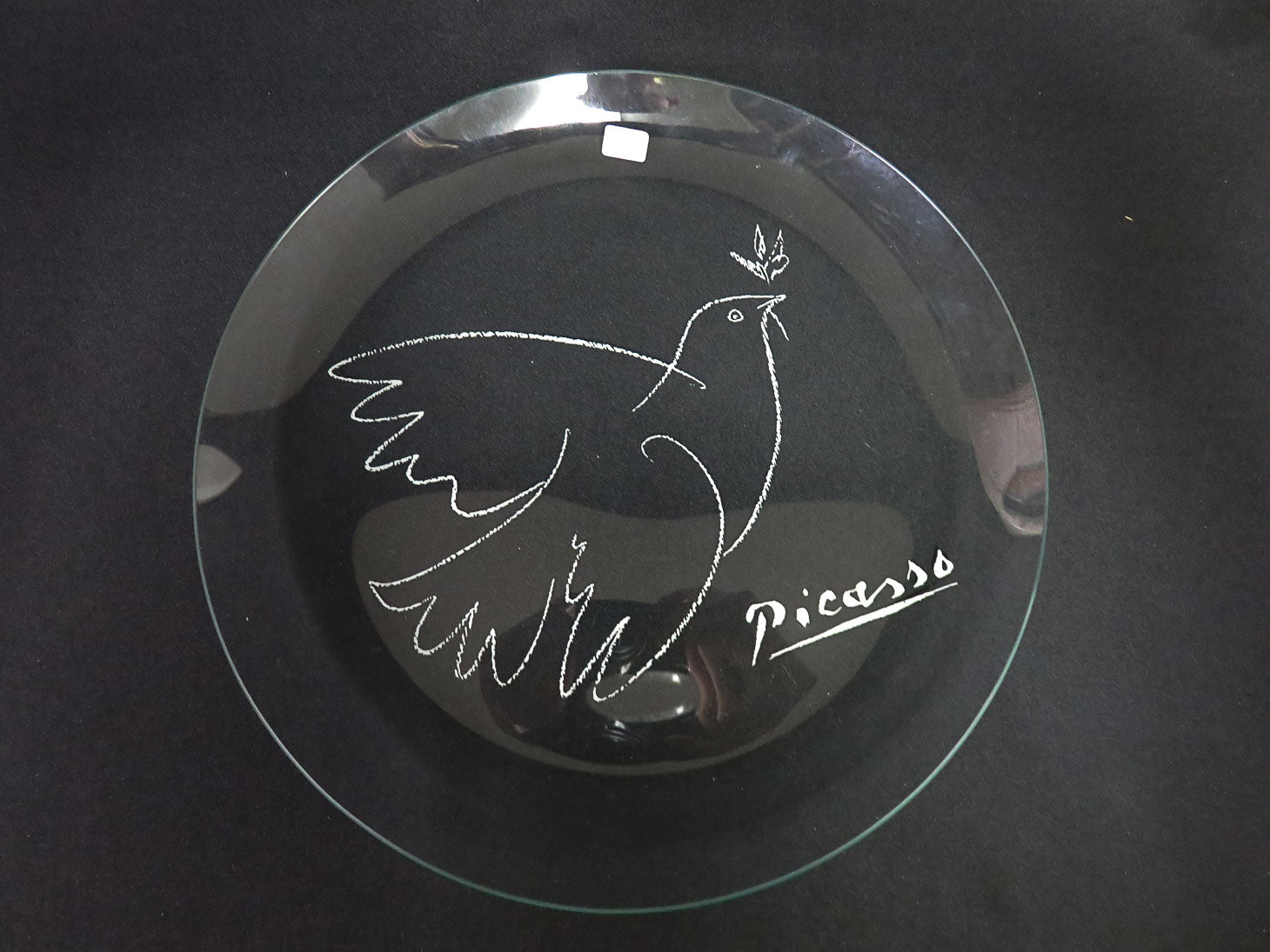 Etched "Dove of Peace" on round serving plate. Retired 1995.