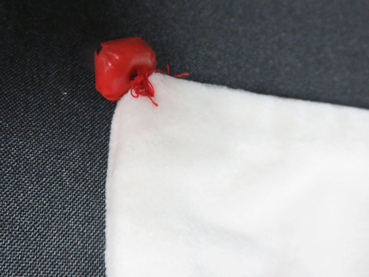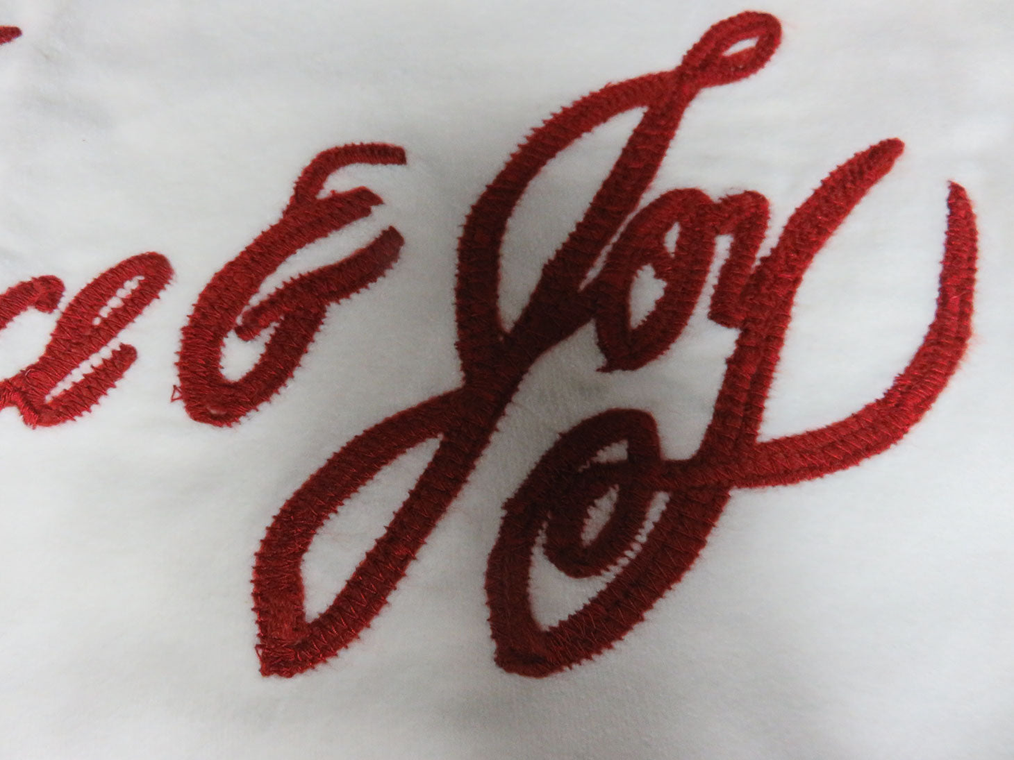 Cream with red cursive "Peace & Joy" and red jingle bells on corners, zippered, new in bag