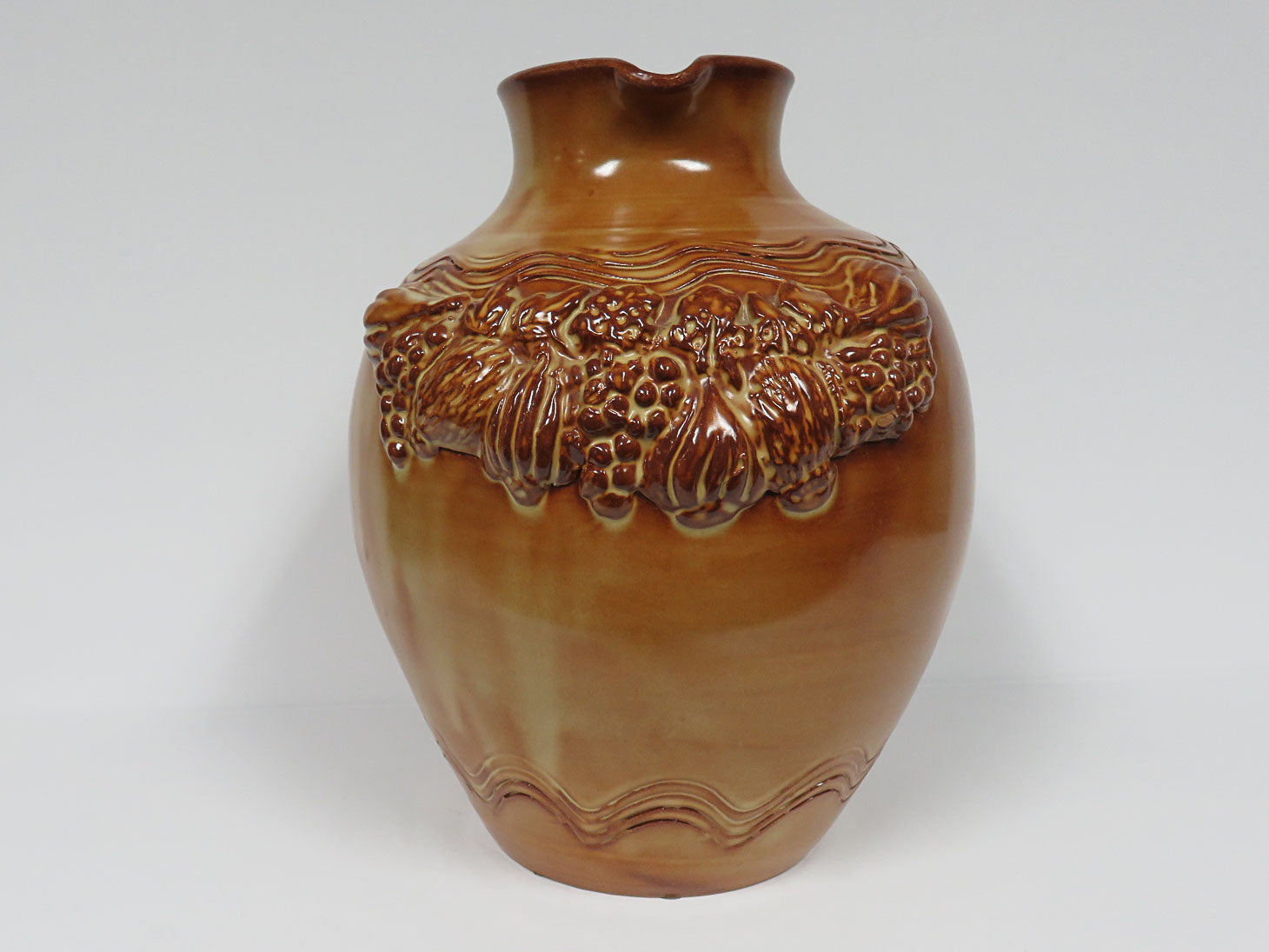 Item Number: 20935-556 Golden brown glaze with raised fruit design, wavy carved horizontal design. 10" H