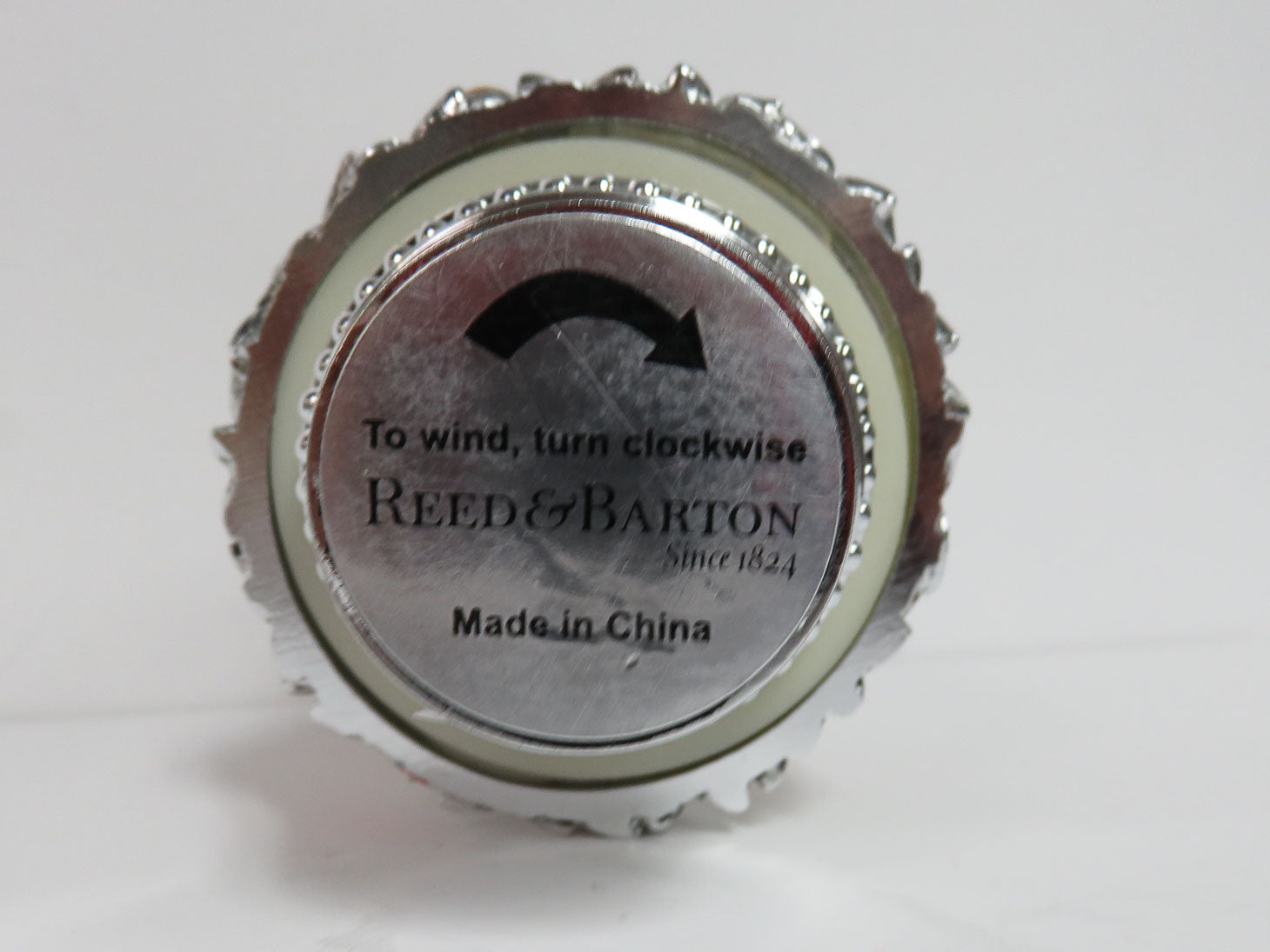 Musical revolving silver topiary tree with red garland and gold star and ornaments