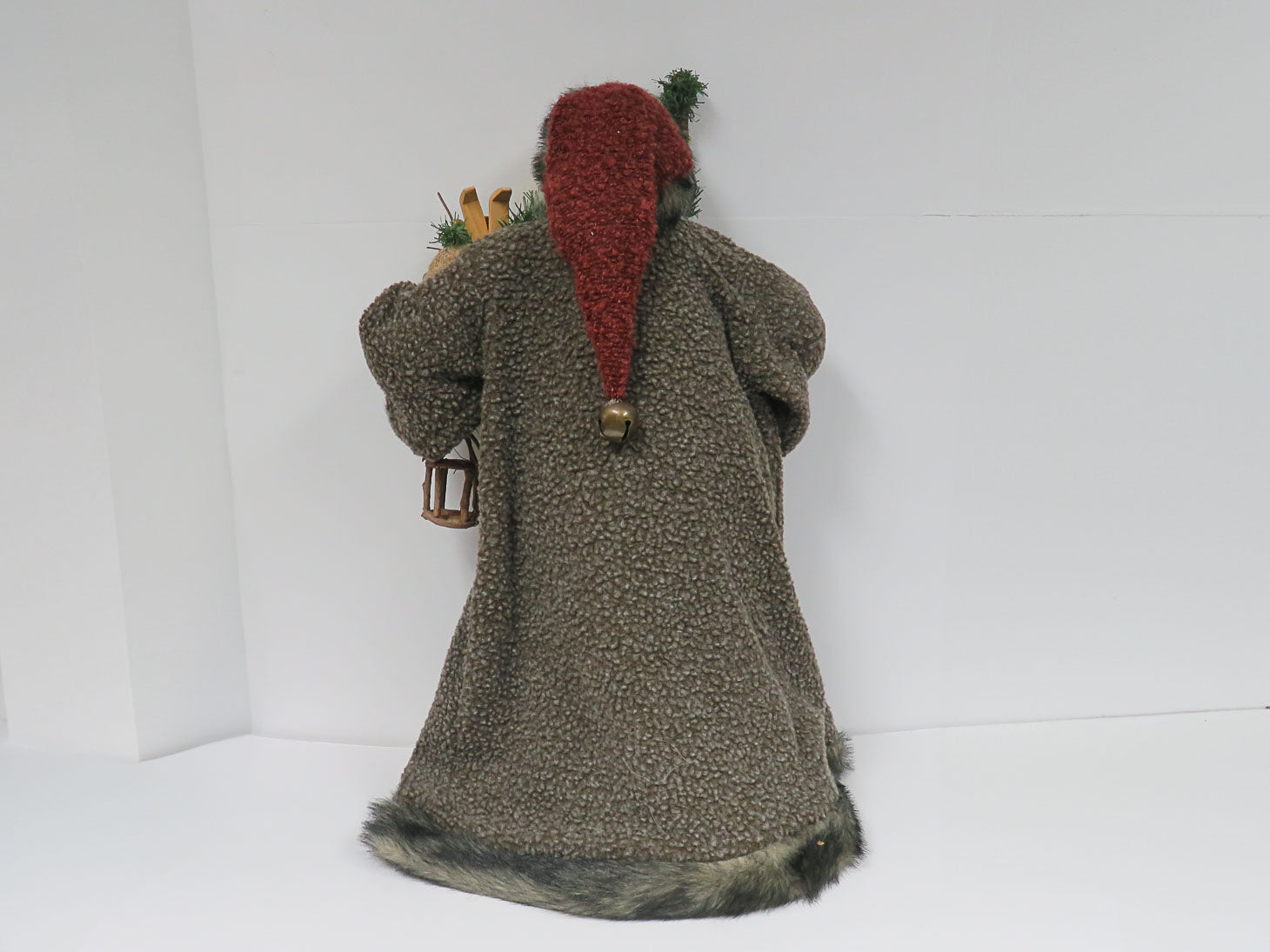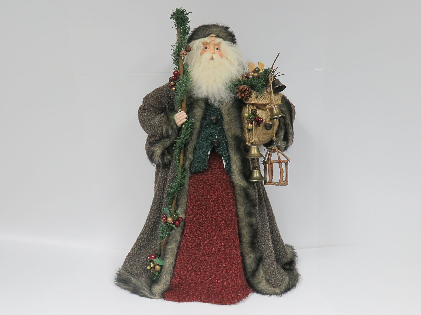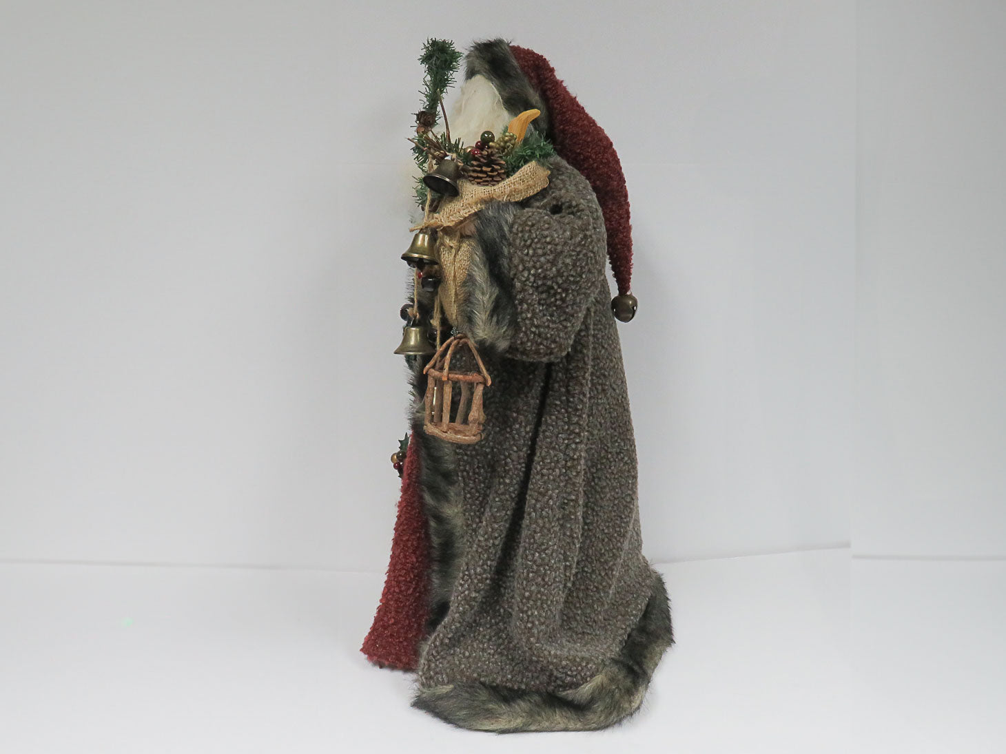 In fur lined winter coat, staff with greenery, burlap sck with bells and birdcage
