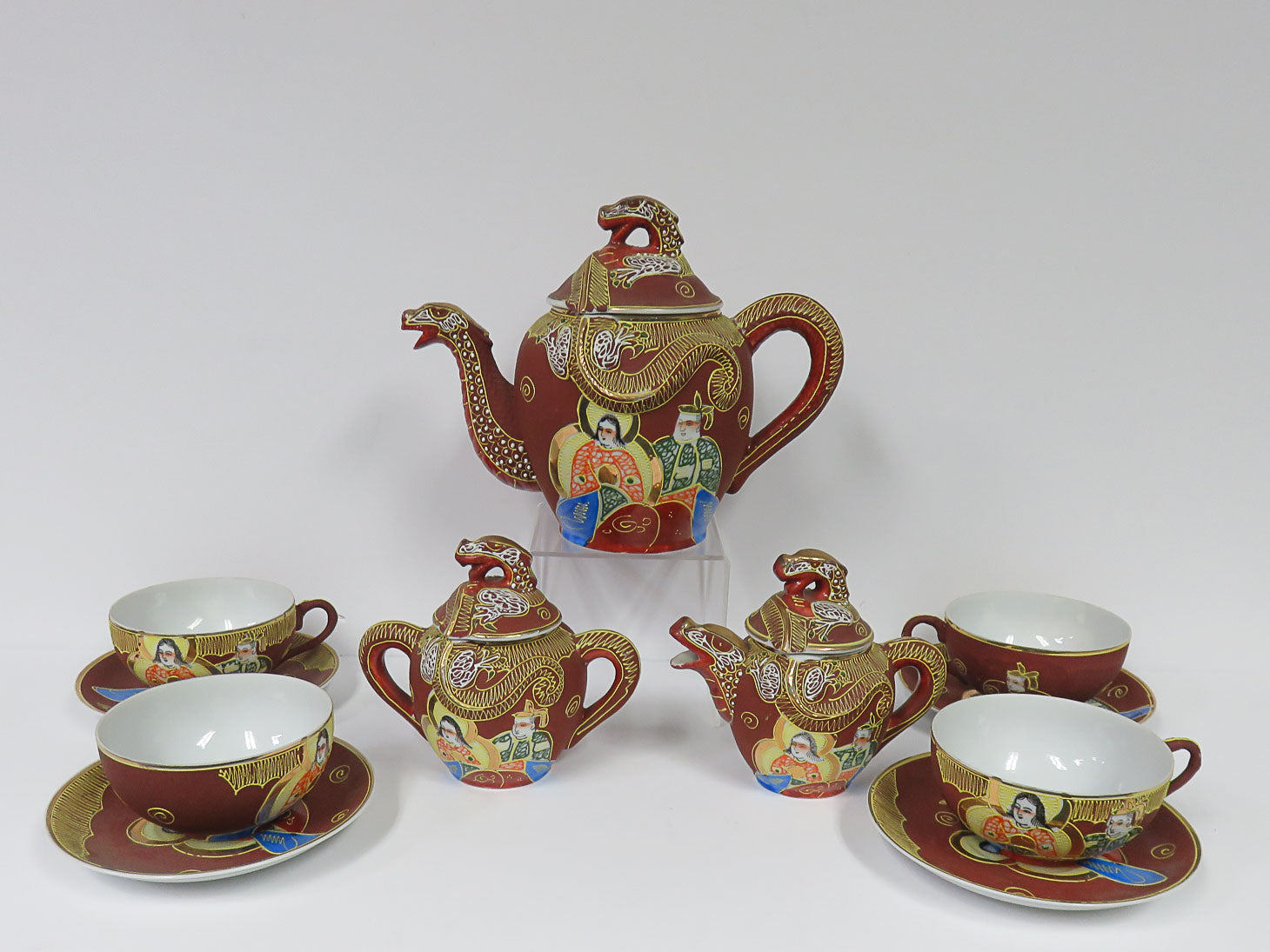 Item Number: 29063-11 Teapot with lid, lidded cream & sugar, 4 saucers and cups (14 pcs); rust color with gold trim lithophane Geisha 14pc