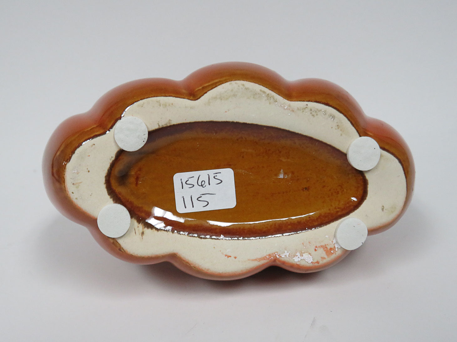 Pumpkin shape, orange and brown glaze. Oval shaped.