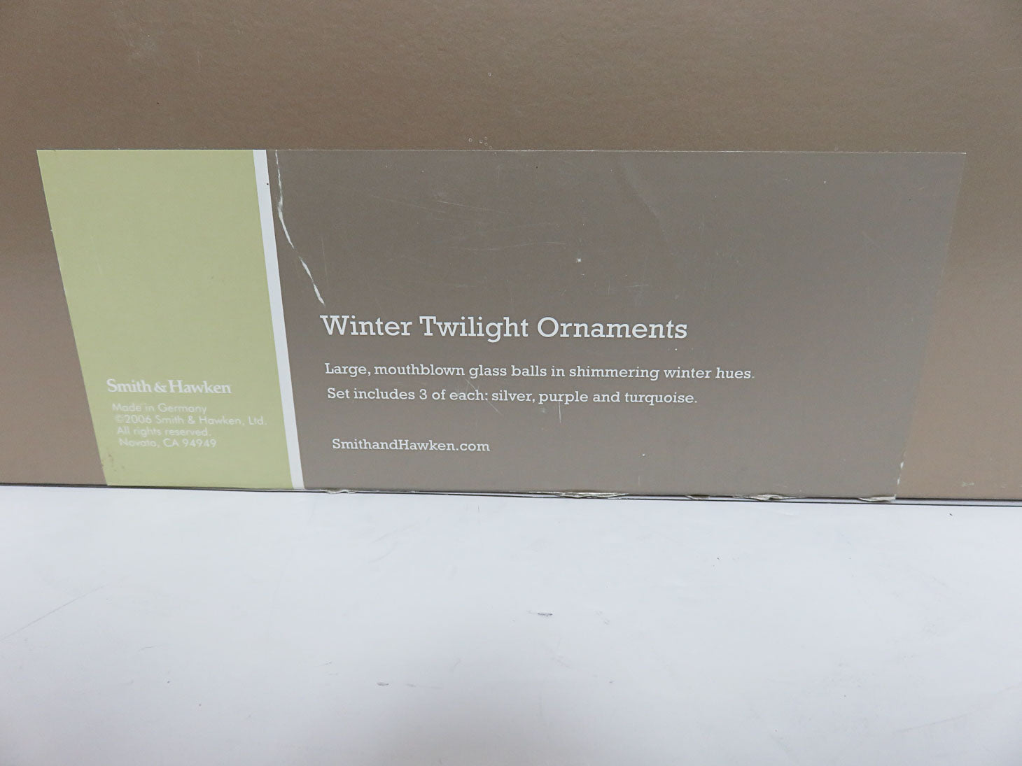 Set of 9 ornaments, 3 purple and 6 turquoise, in box