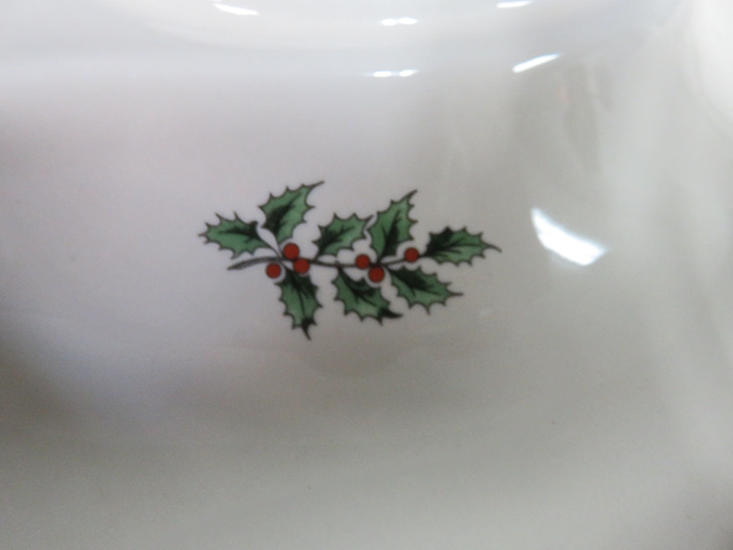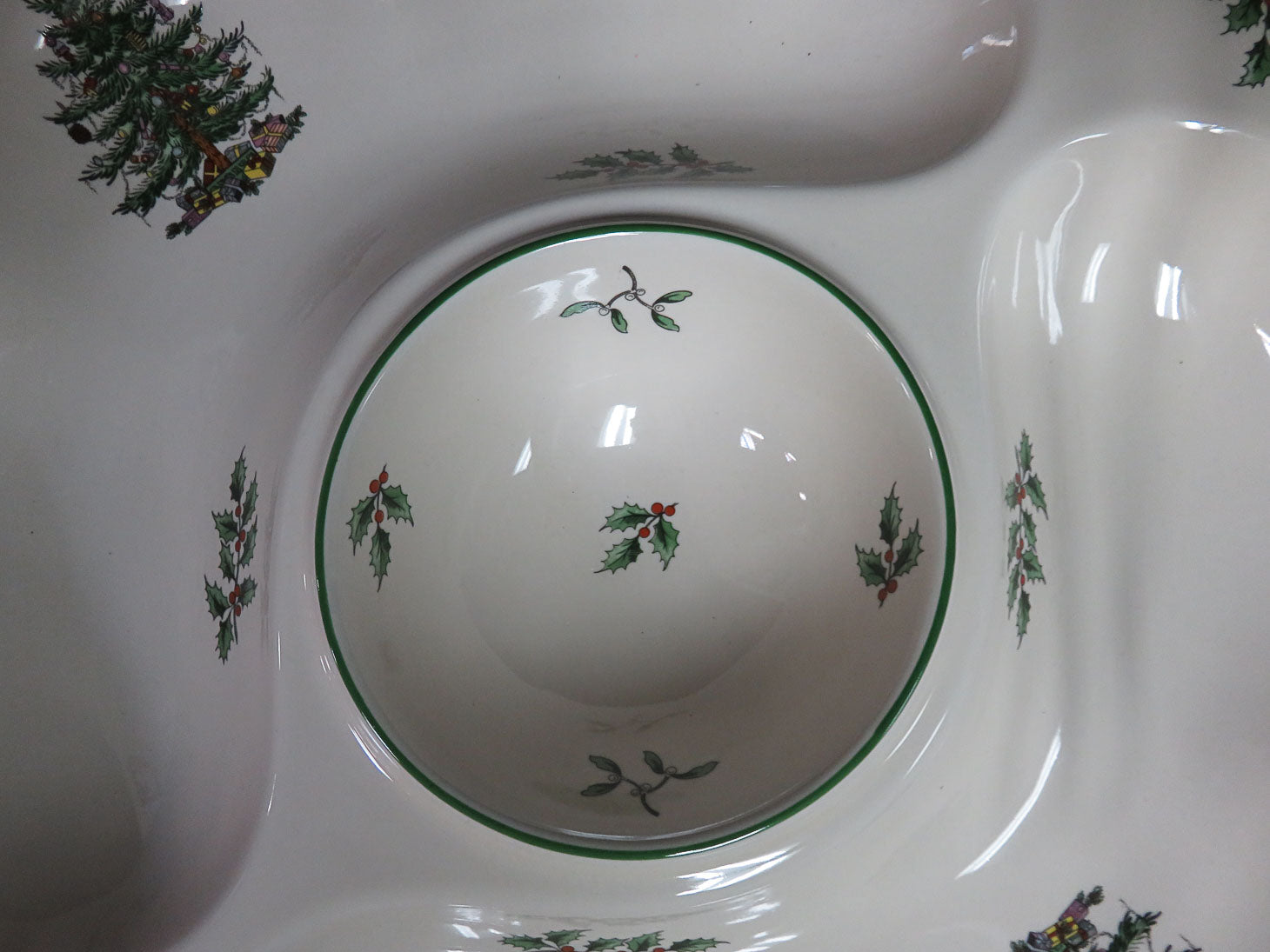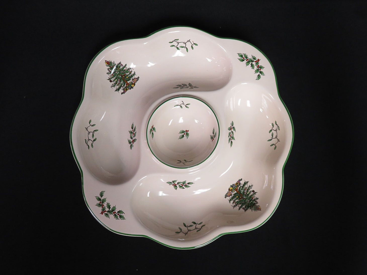 "Christmas Tree", three-section chip and dip, scalloped edge and holly berry design. 12.5" 12.5"x 1.75