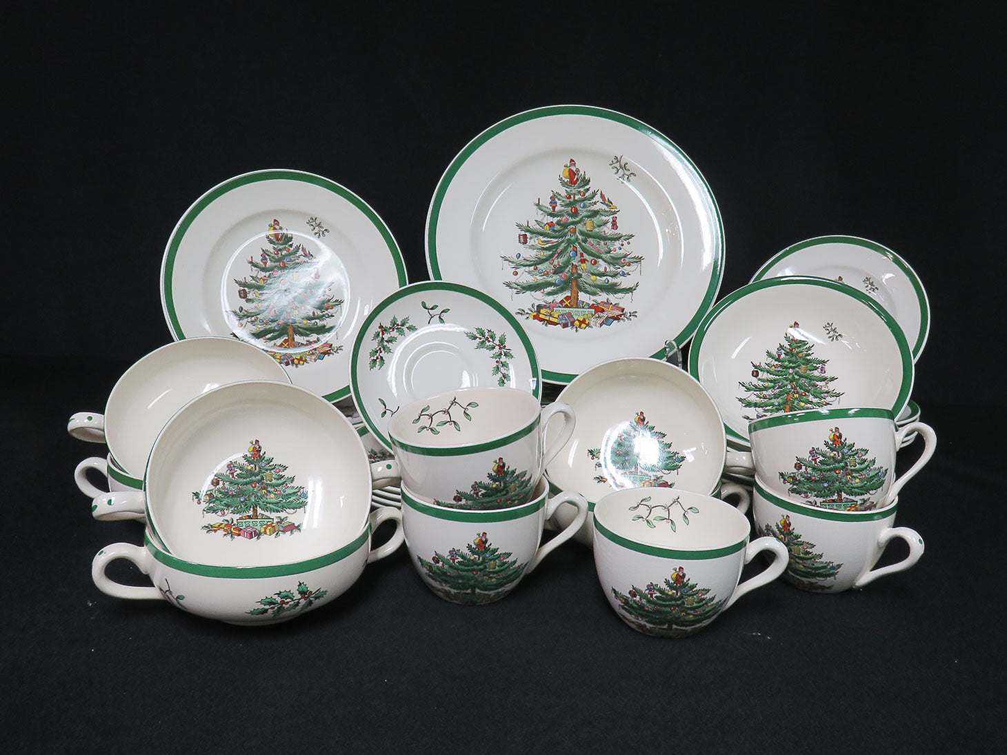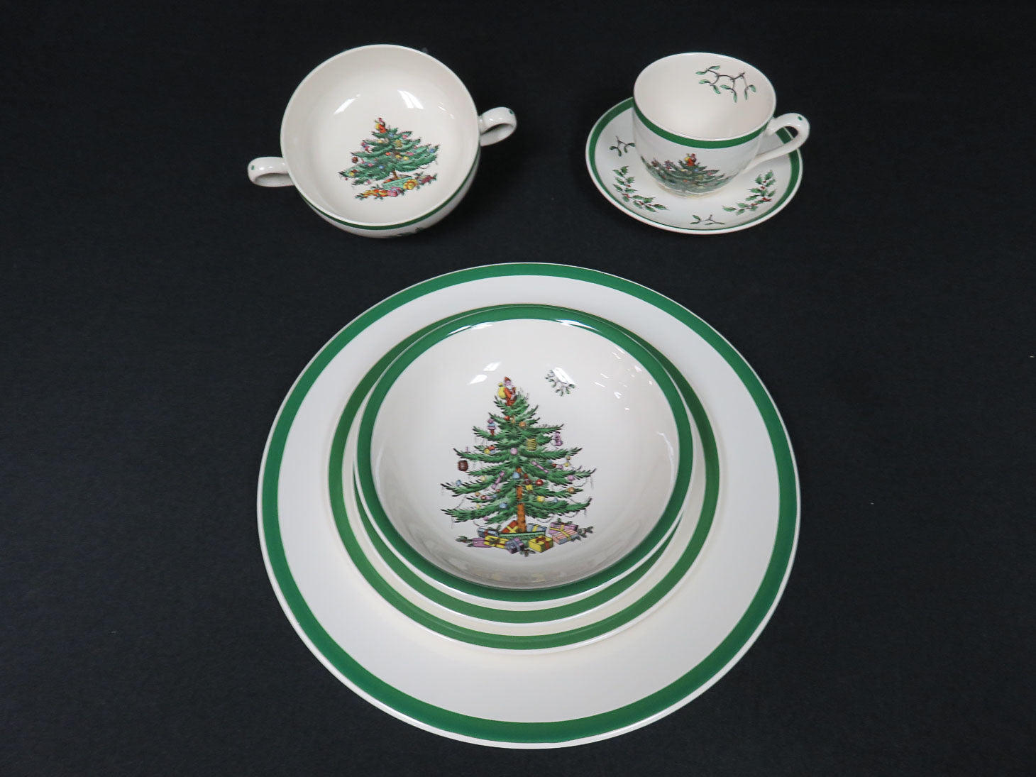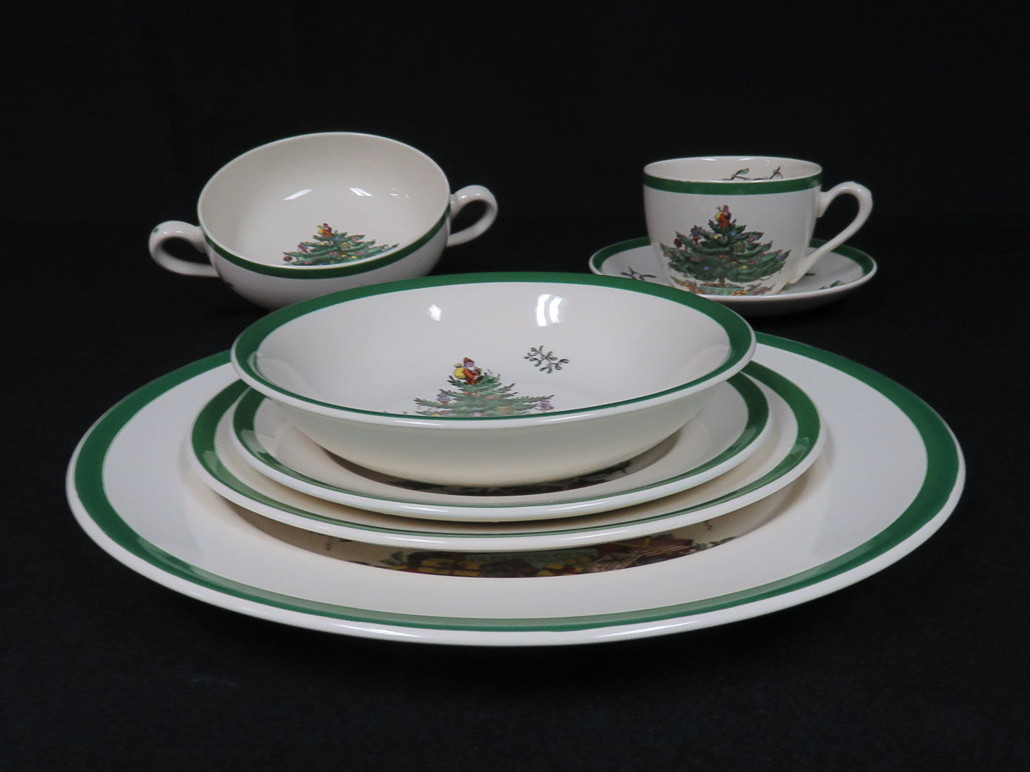 Seven-piece place setting for 6, Christmas tree in center, green rim. Only 5 cups.
