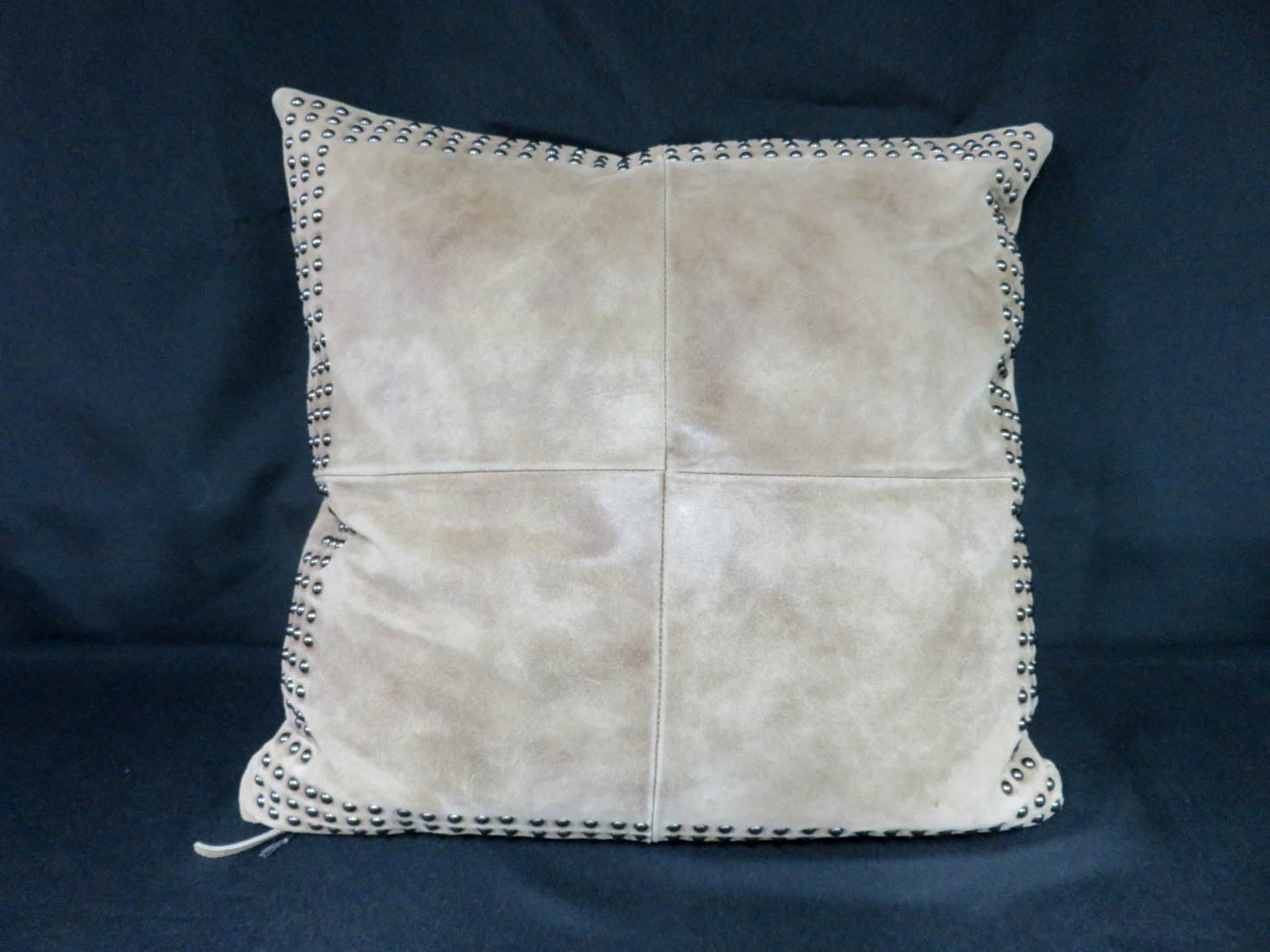 Square, taupe leather with hammerhead trim, zippered, poly fill