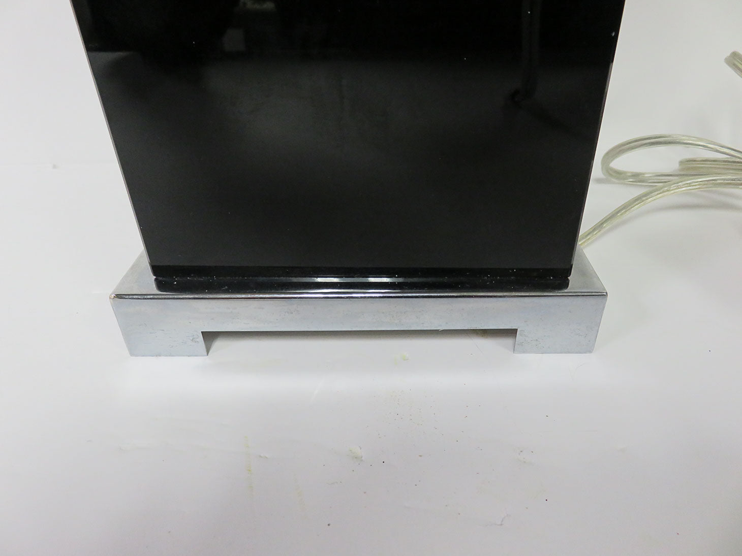 Glossy black table with silver metal base and cream shade, heavy