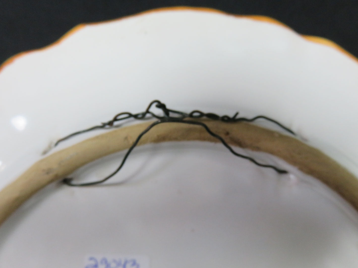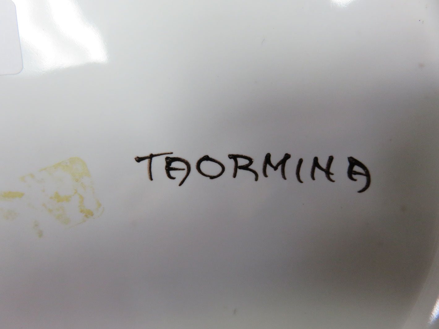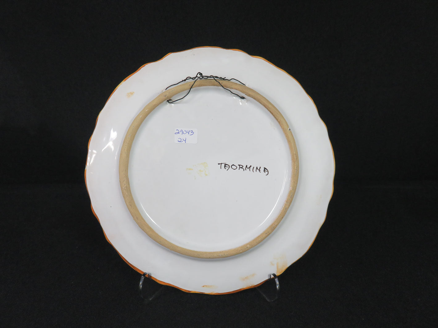 White, scalloped edge, rust, green and blue. Made in Sicily.