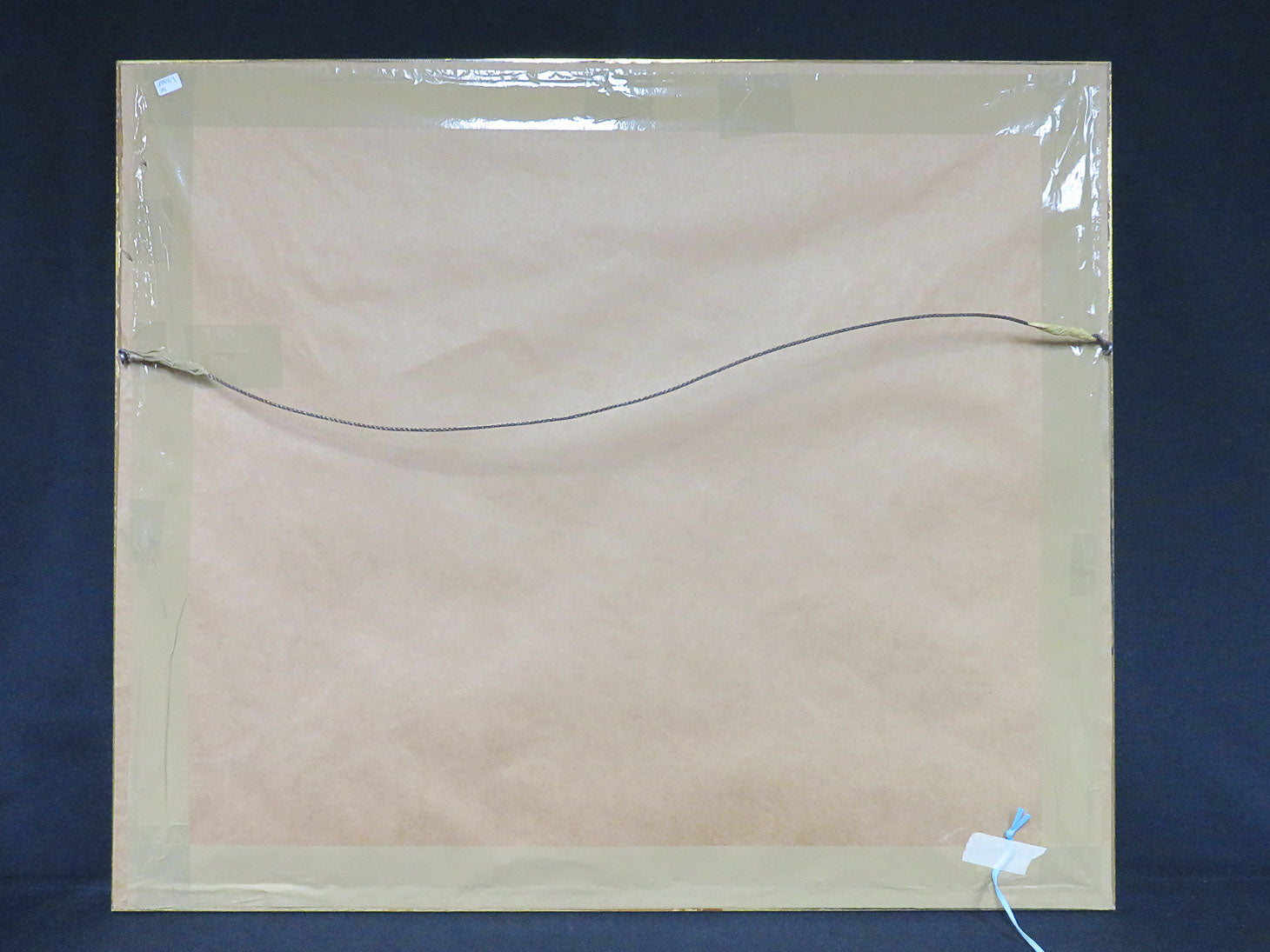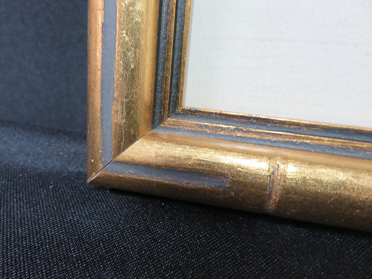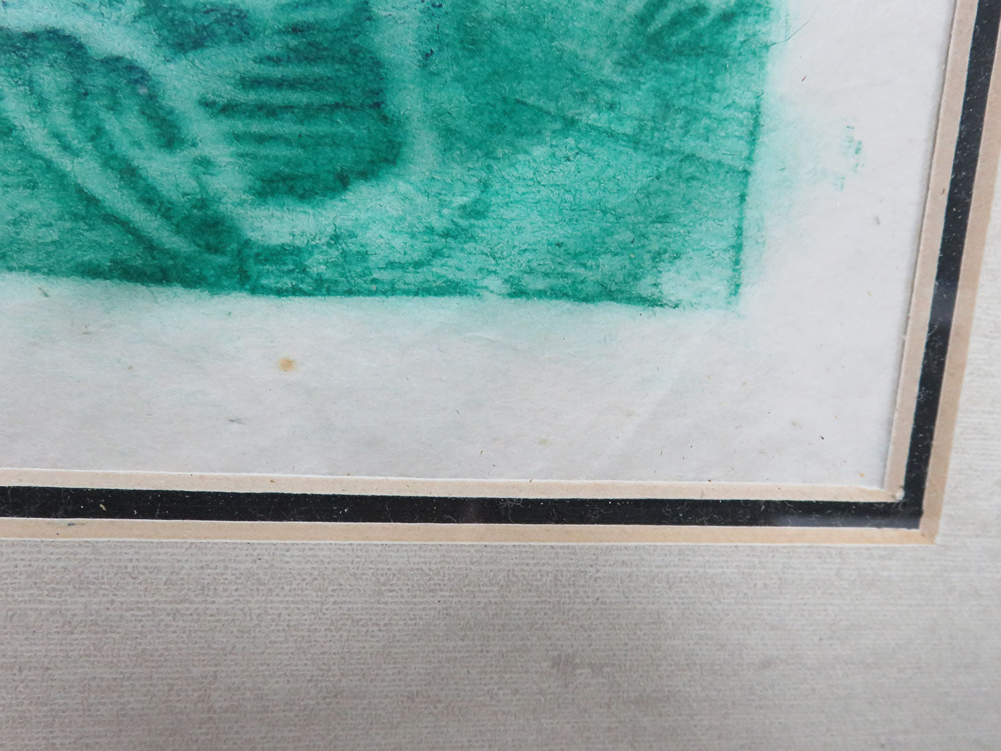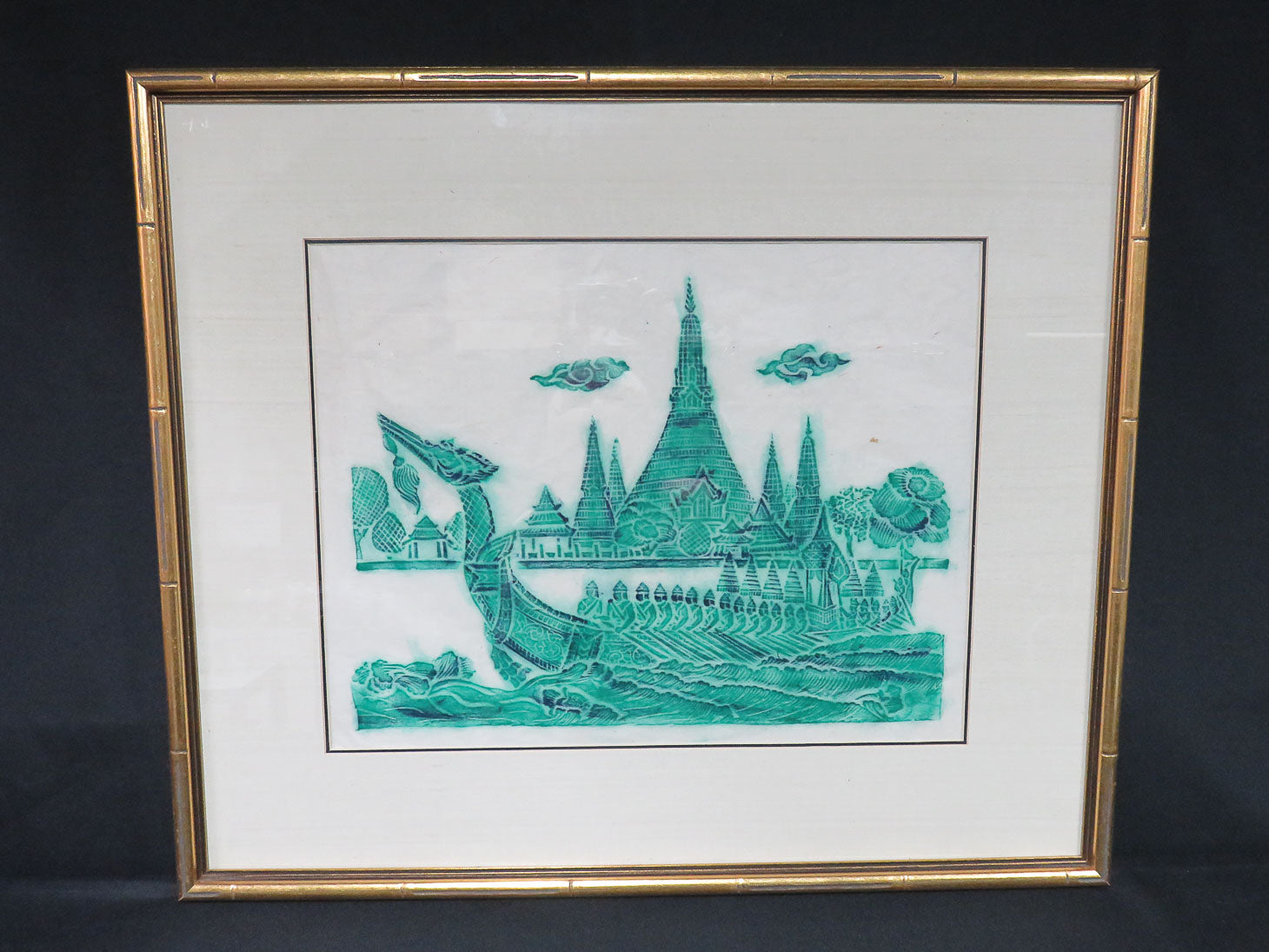 Dragon Boat and Temple rubbing, green in gold bamboo frame