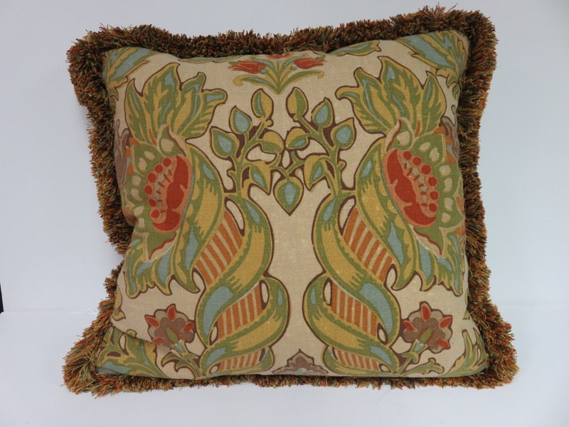 Fall colors, scroll pattern with fringe, feather insert, zippered. 20" x 20"