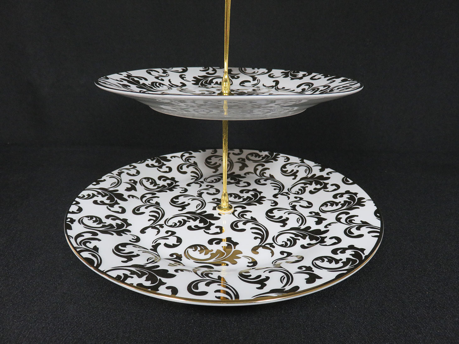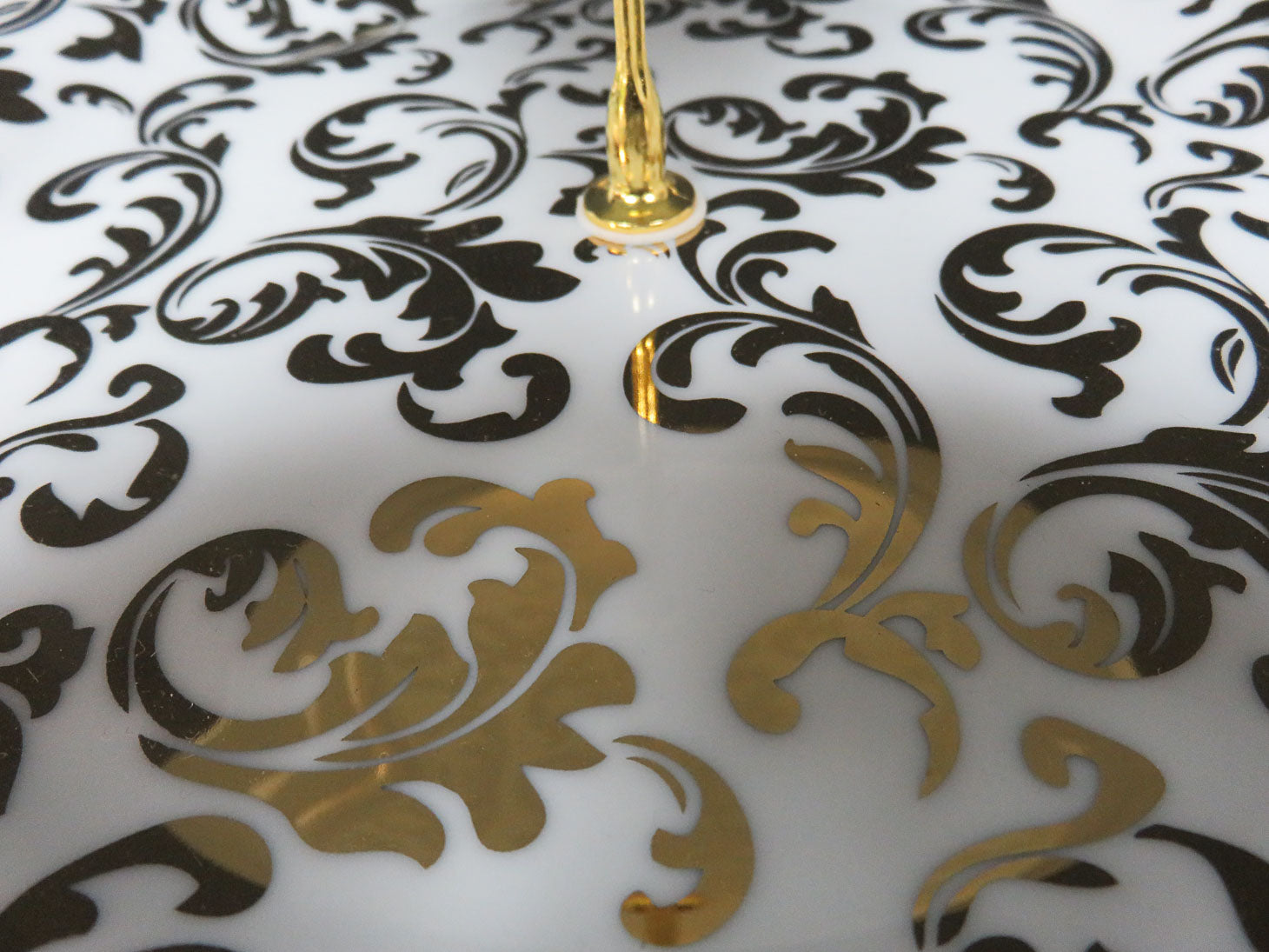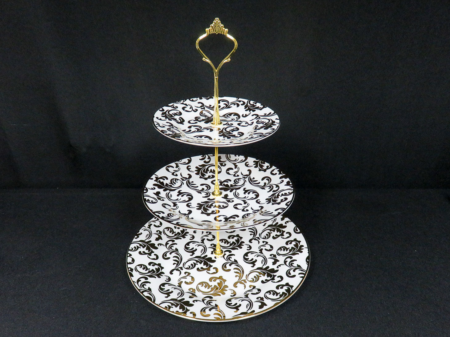 3 white plates with gold swirl design and gold toned metal structure