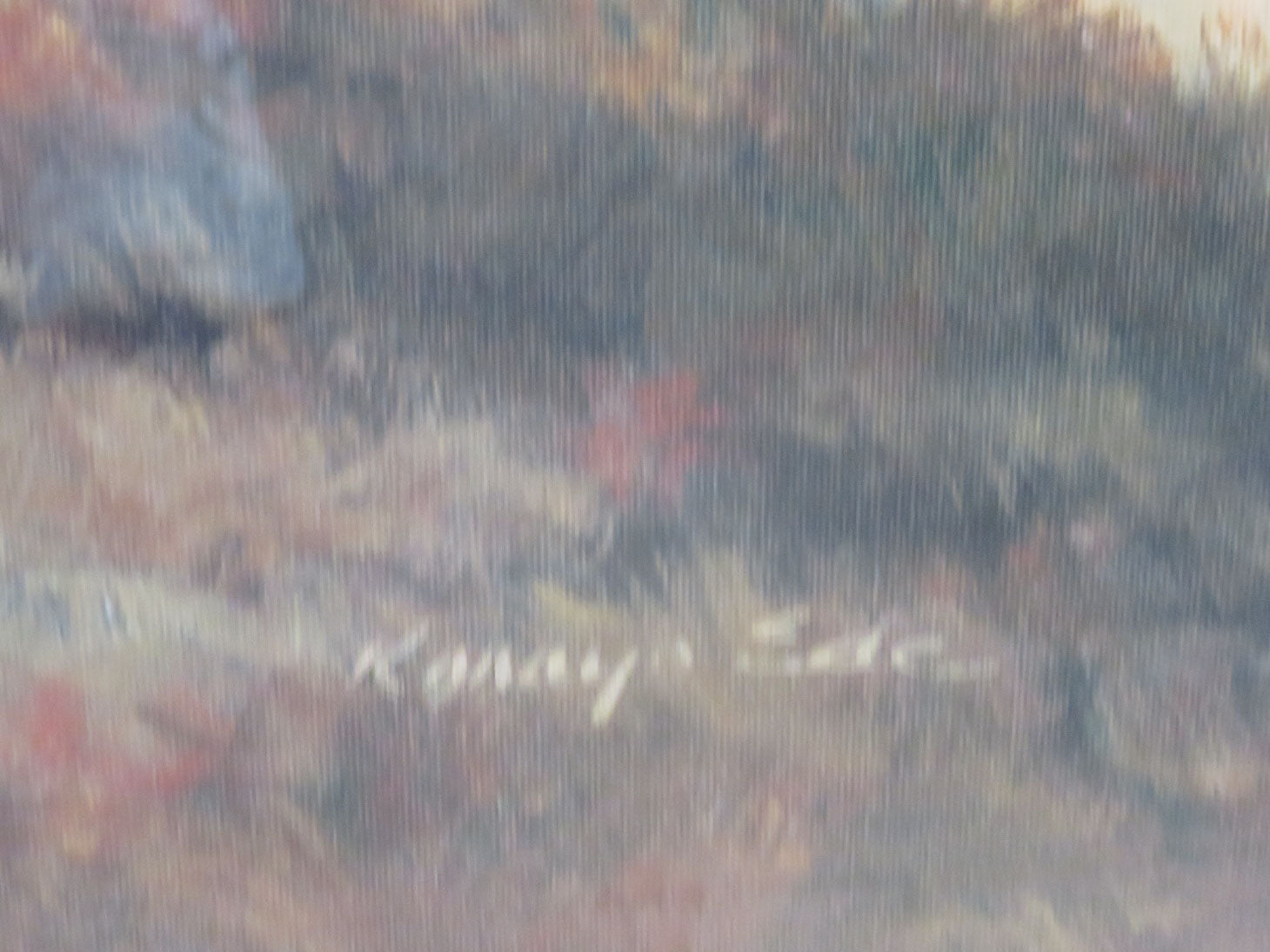 Tuscan cottage with fall colors on trees in gold frame, red tree on right