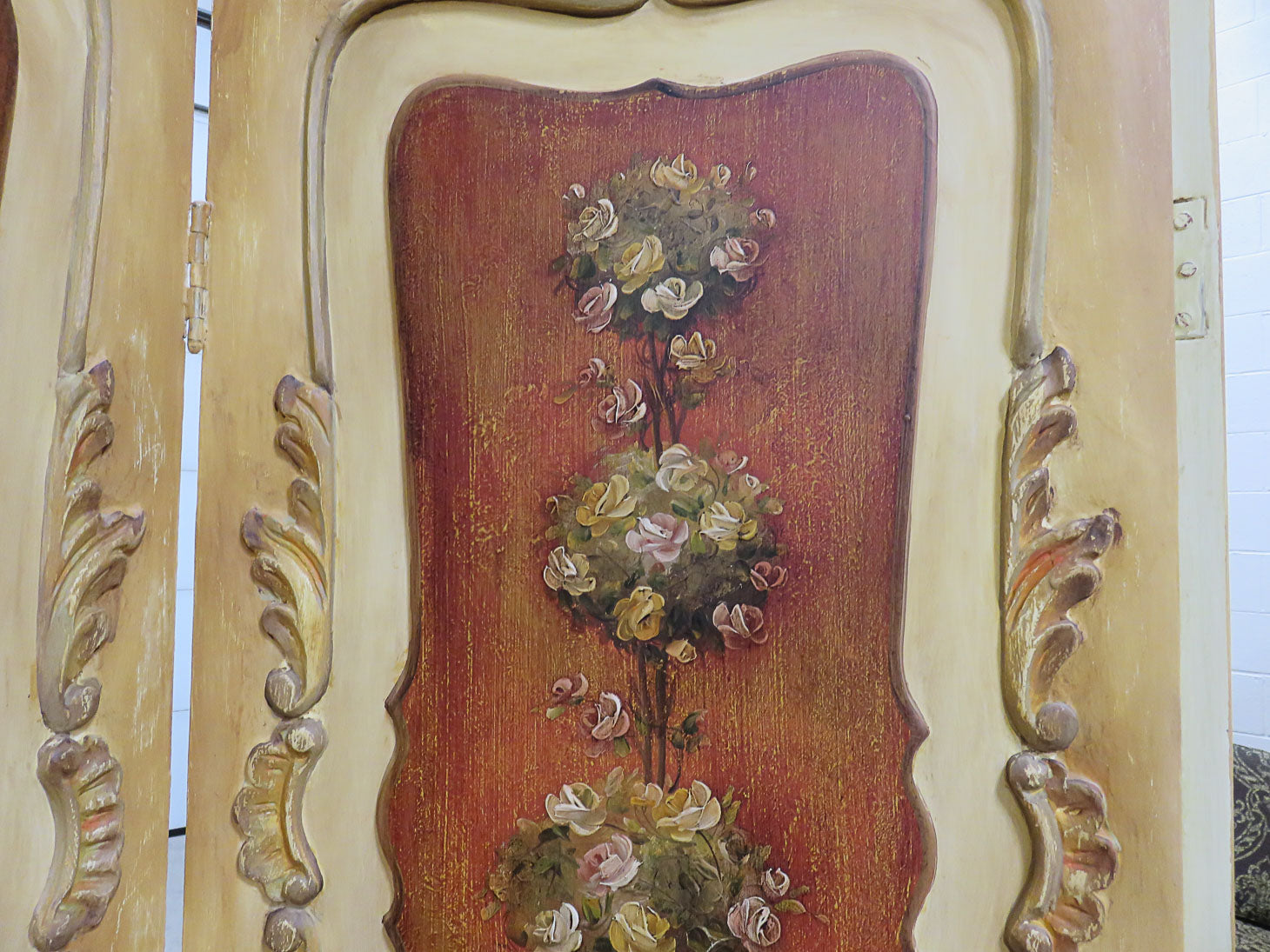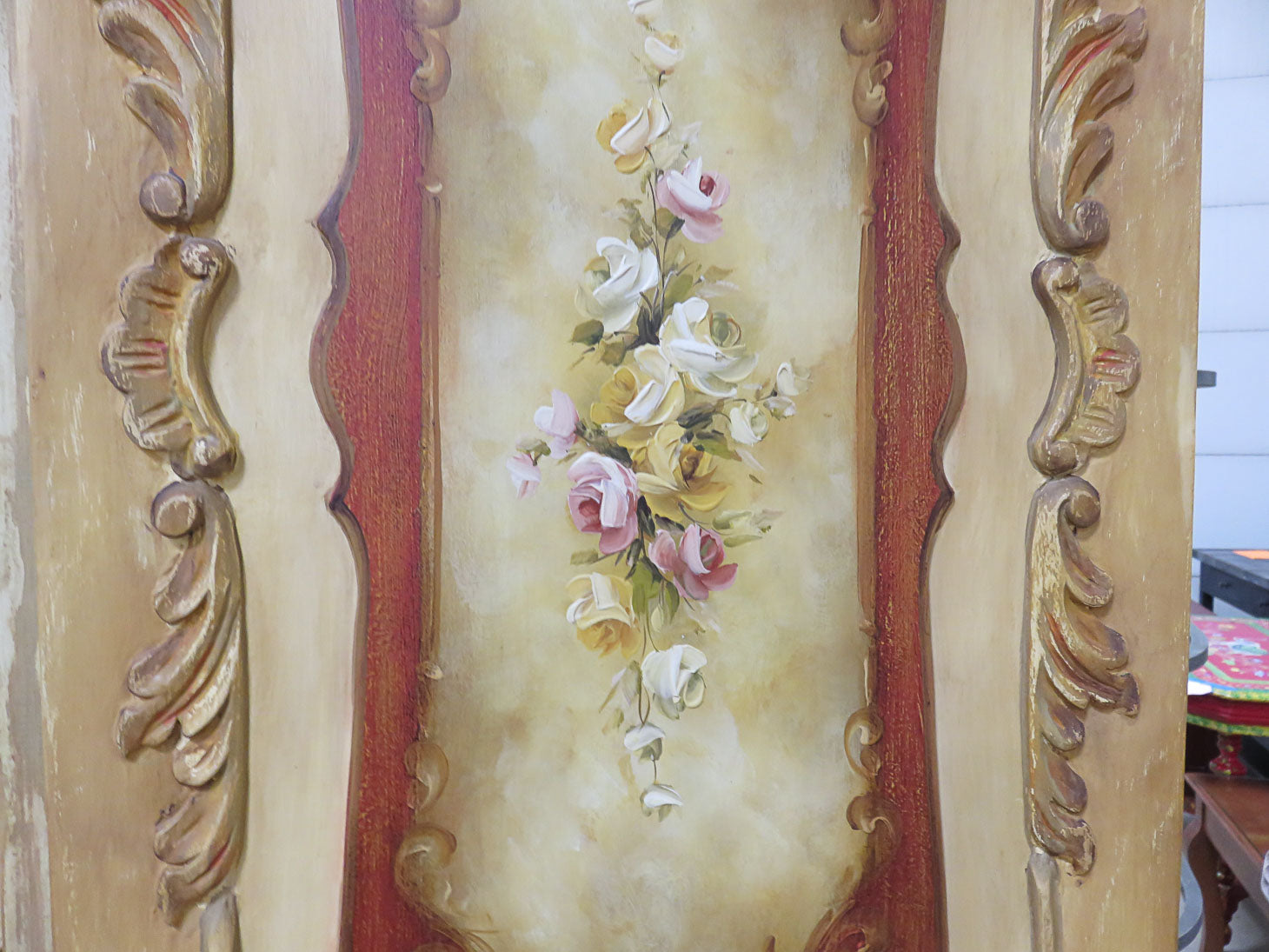 3 panels, one side cream with floral pattern, reverses to red & beige floral