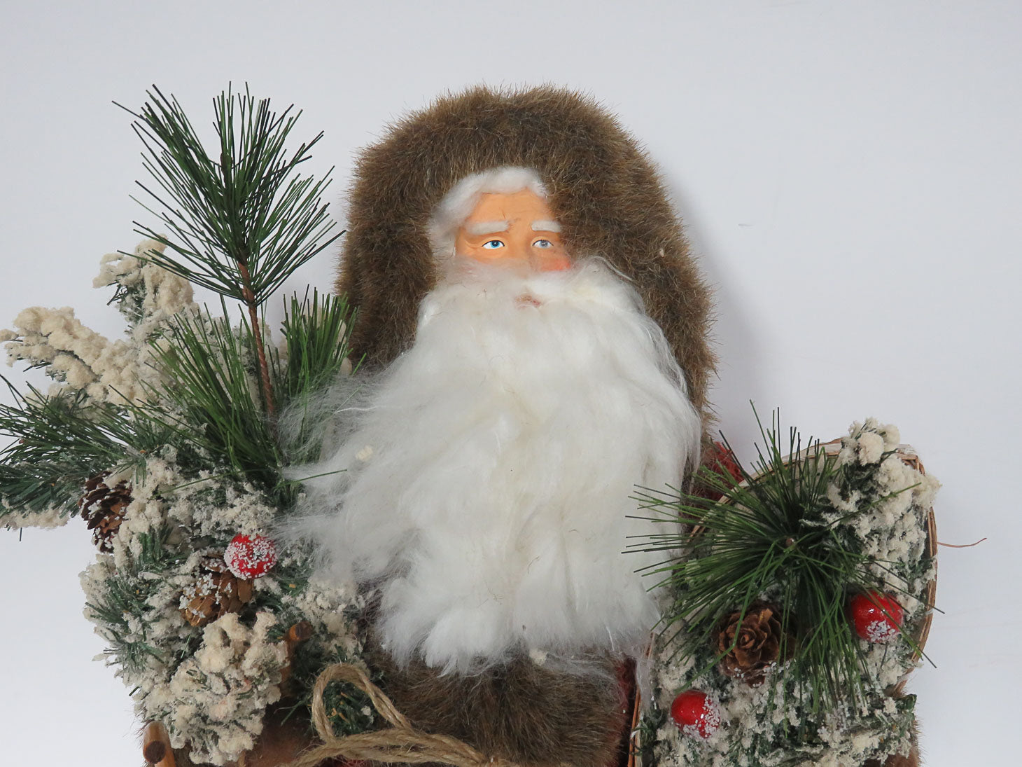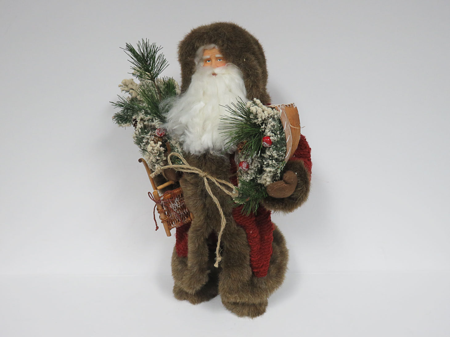 Santa with sled and birchbark canoe. Dressed in a textured red fur-lined coat.