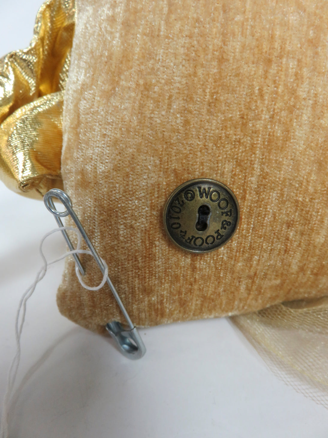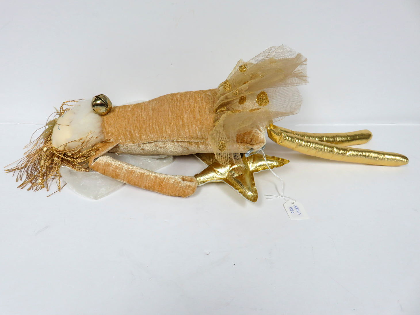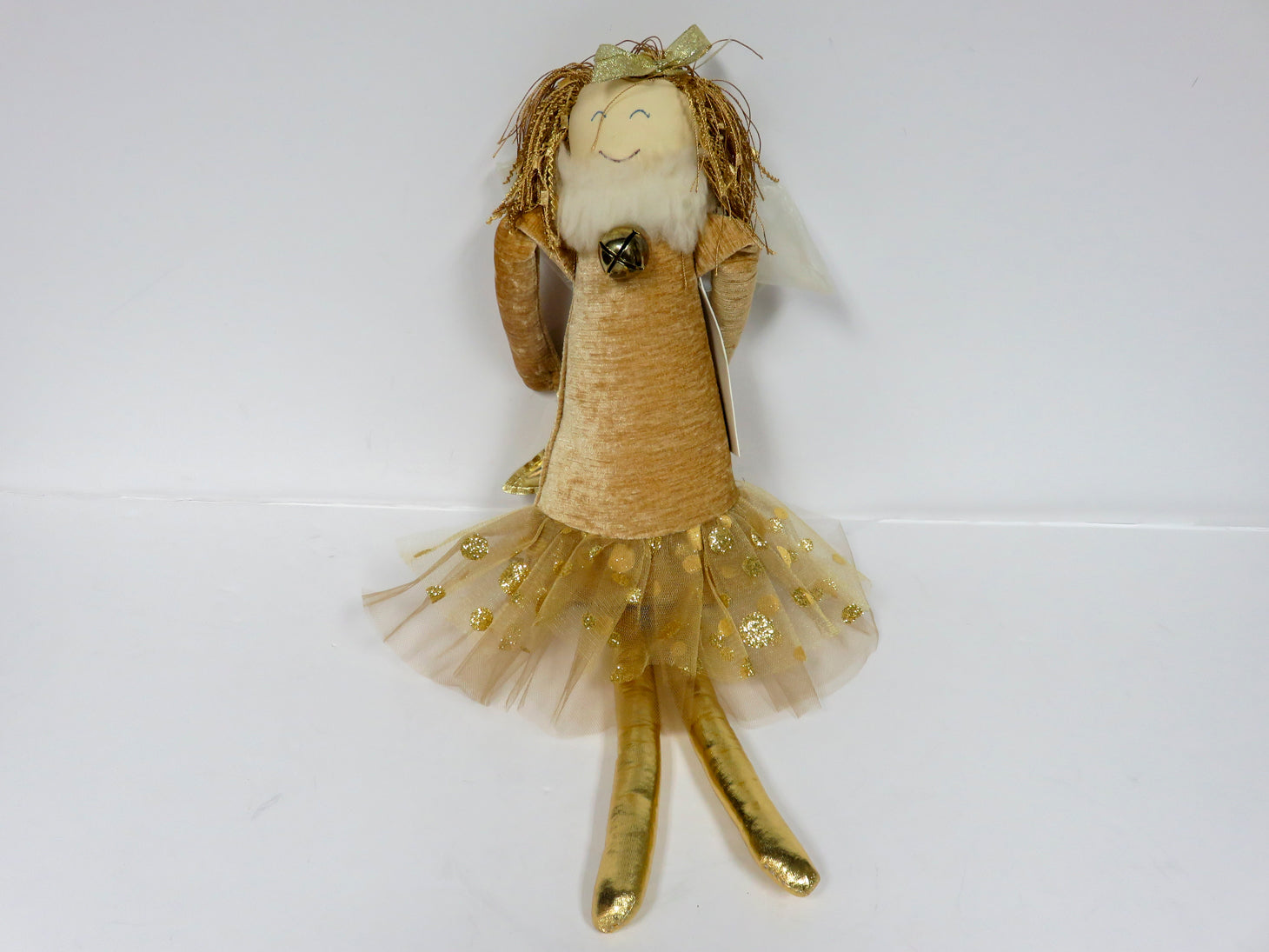 Woof & Poof stuffed door hanging angel, gold legs and skirt with glittery polka dots, holding a gold star