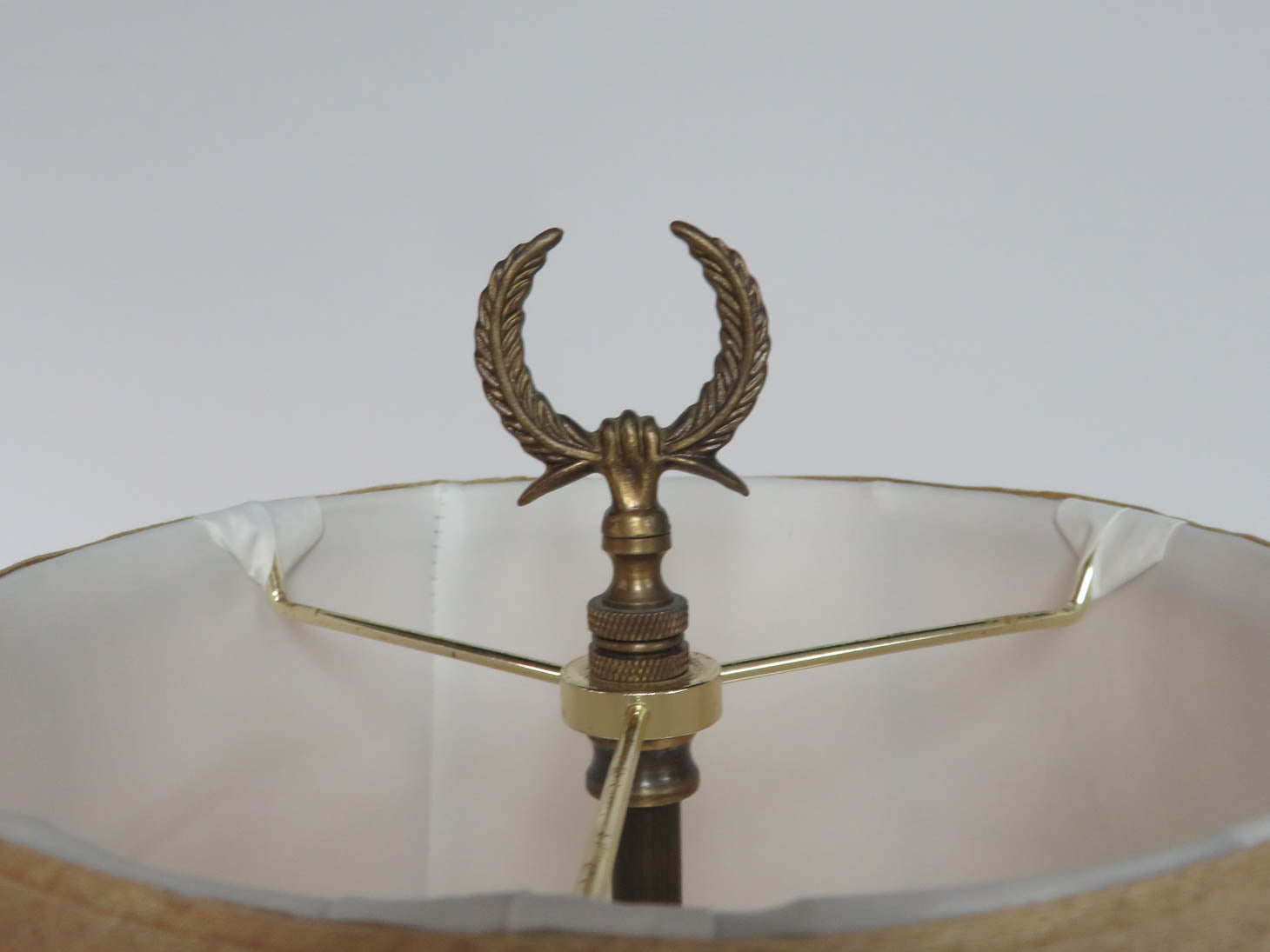 2 bulbs, 2 pull chains, square brass base, tan silk shade