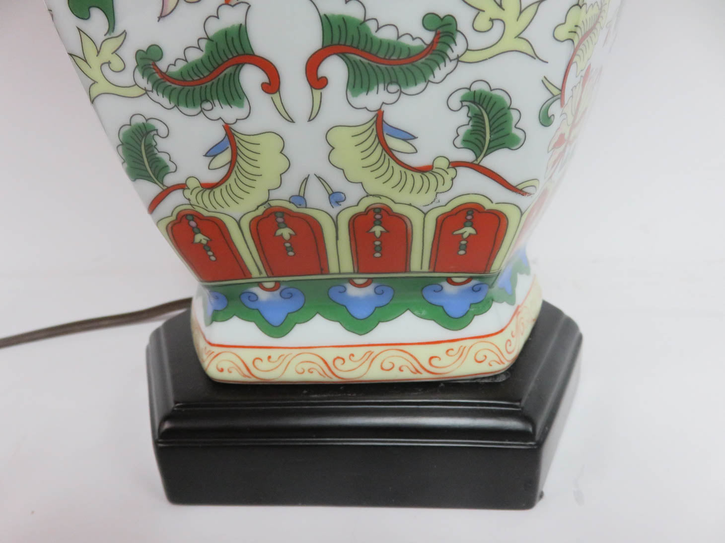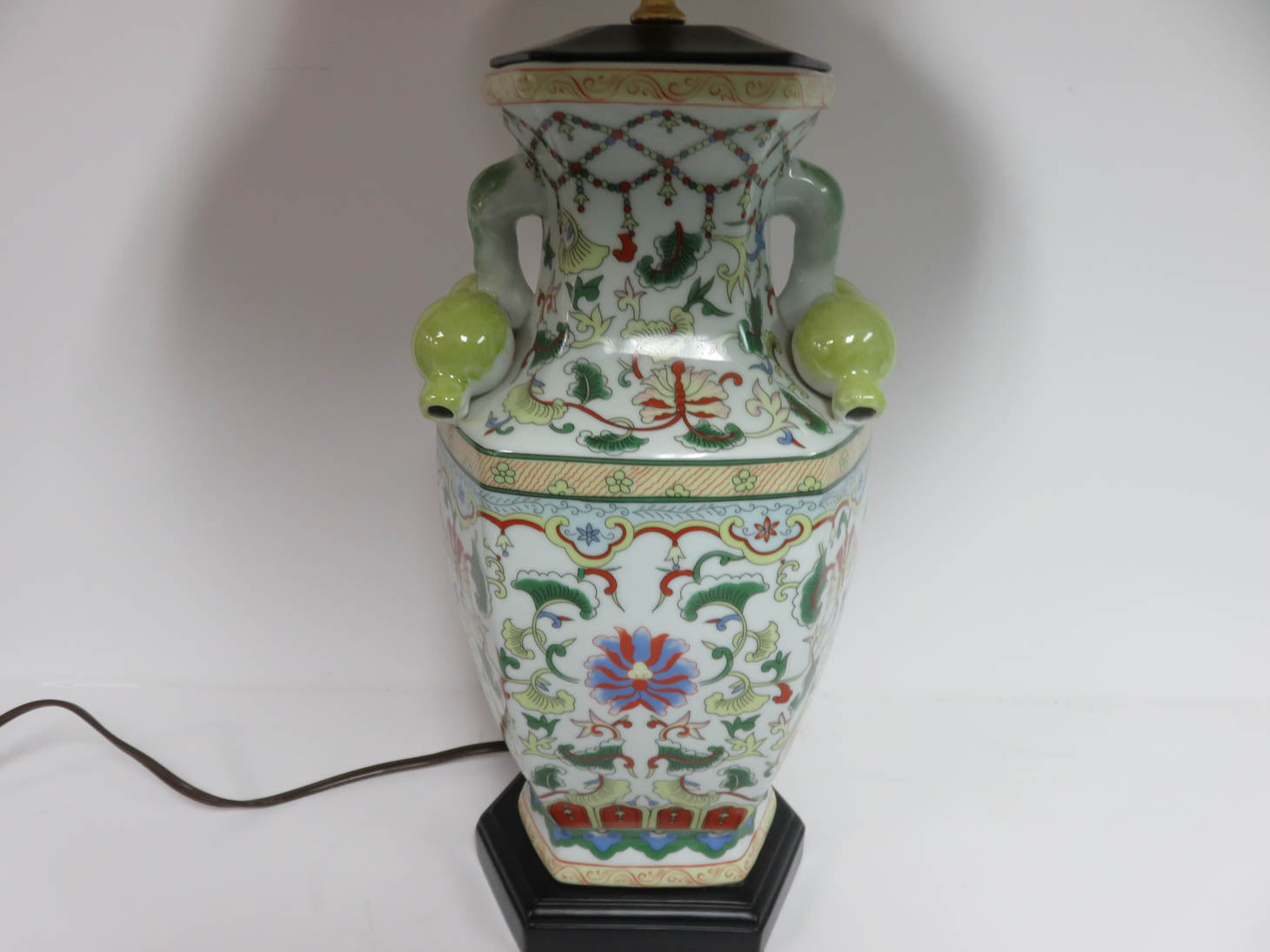Ceramic urn shape, floral pattern, pomegranate handles, wood base,silk shade, floral ceramic finial
