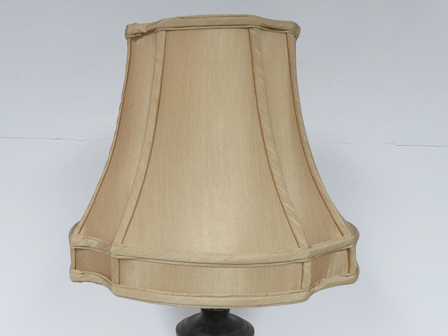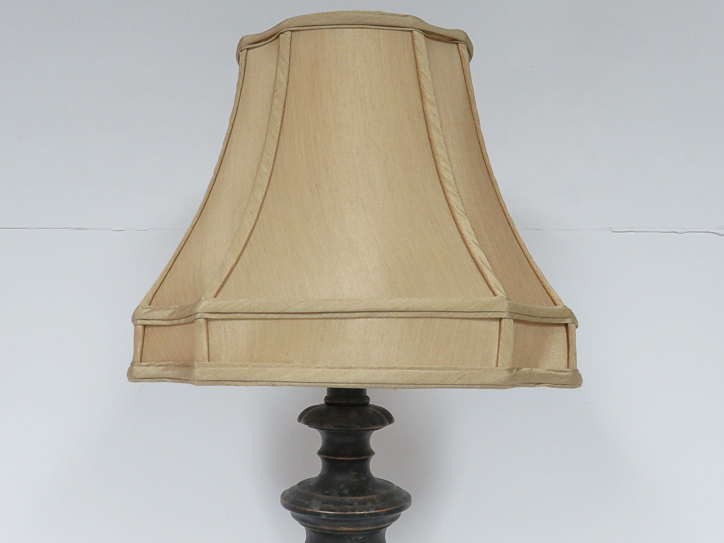 Oil rubbed bronze finish, camel colored bell shade, round footed base
