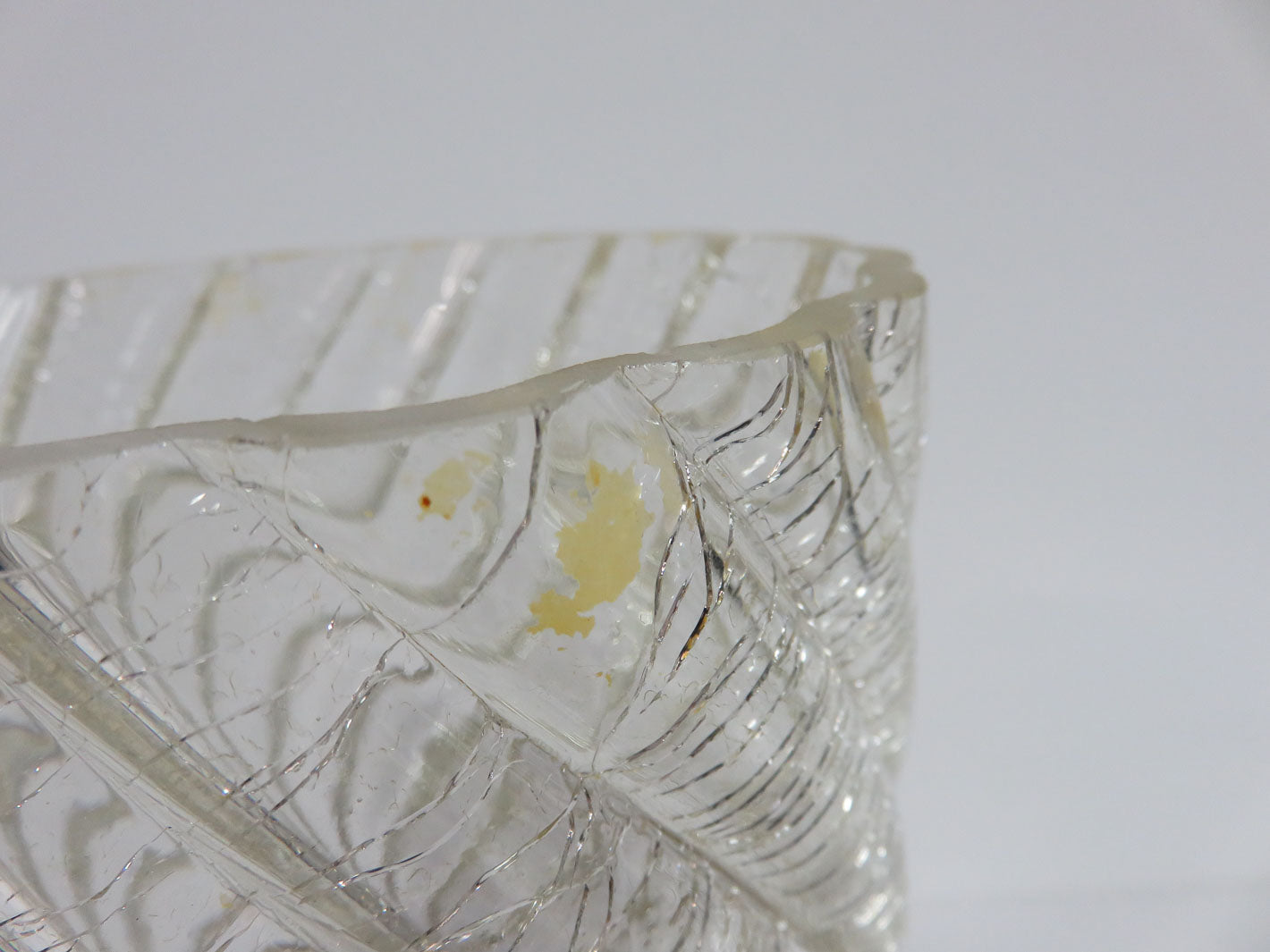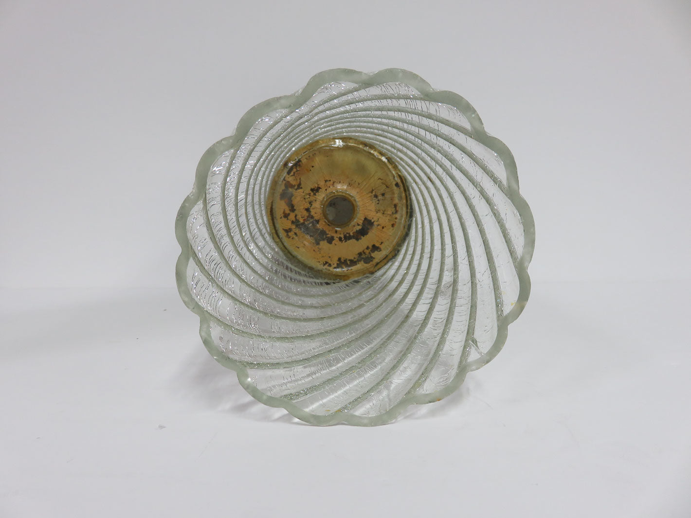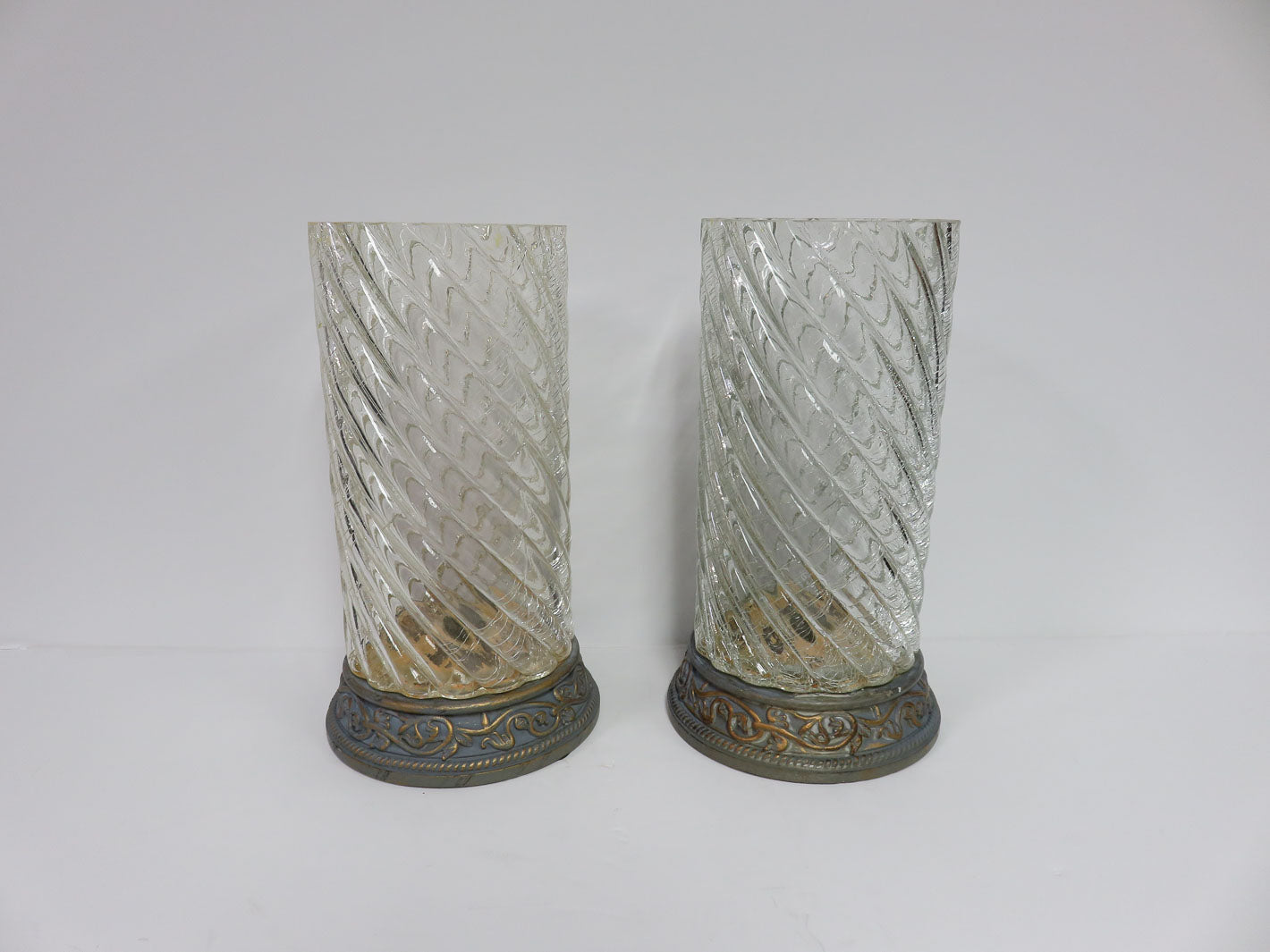 Set of 2, crackled spiral design, gold accented painted base. Interior surface wear and residue on glass. 10.5" H