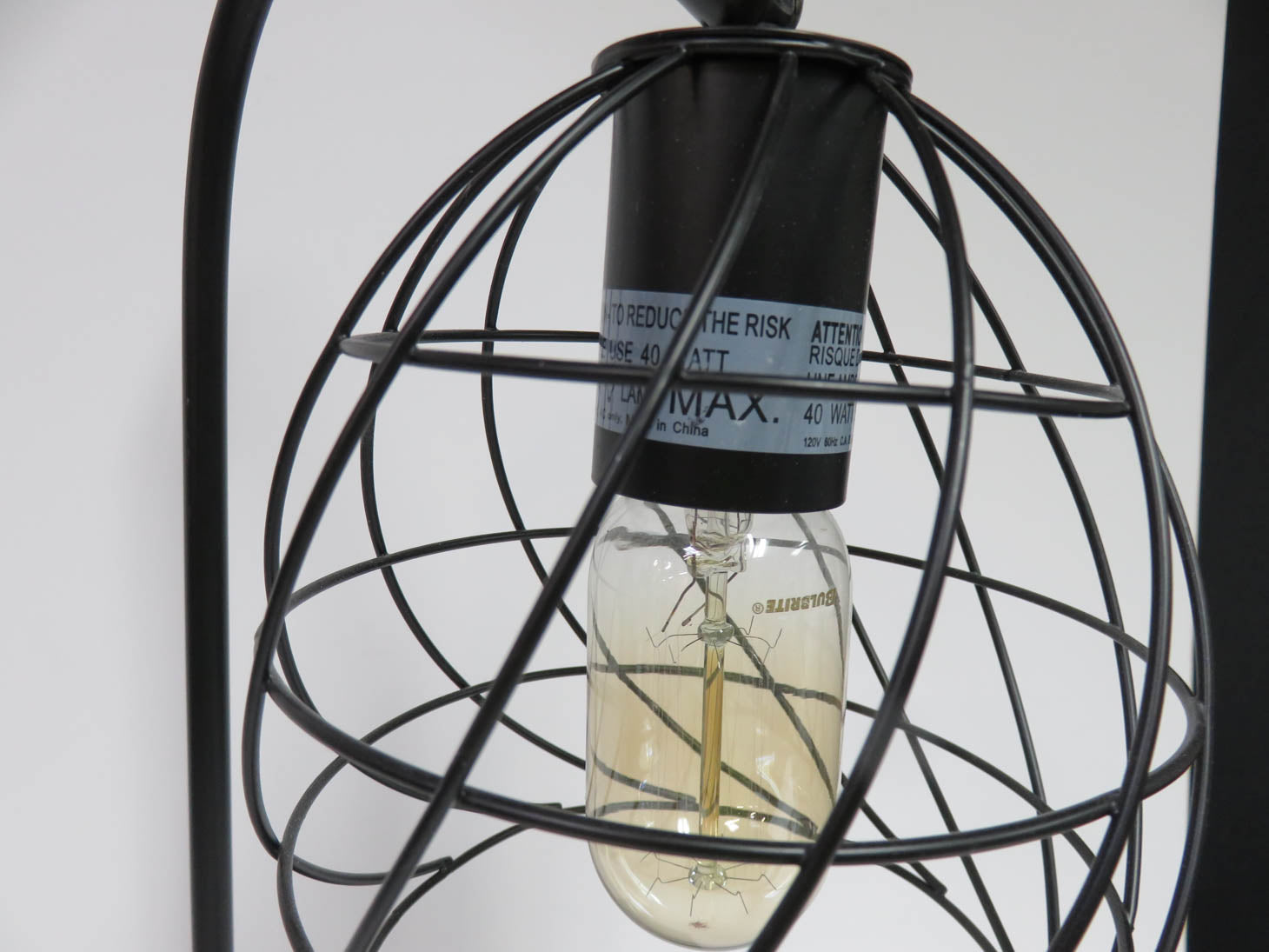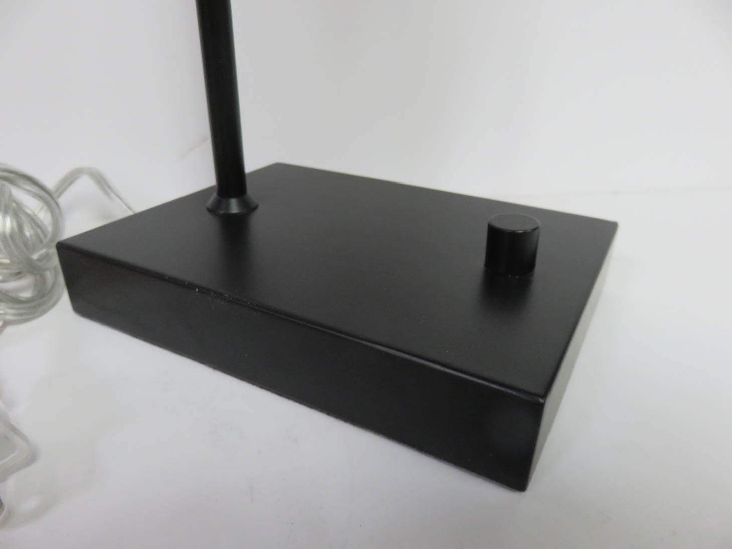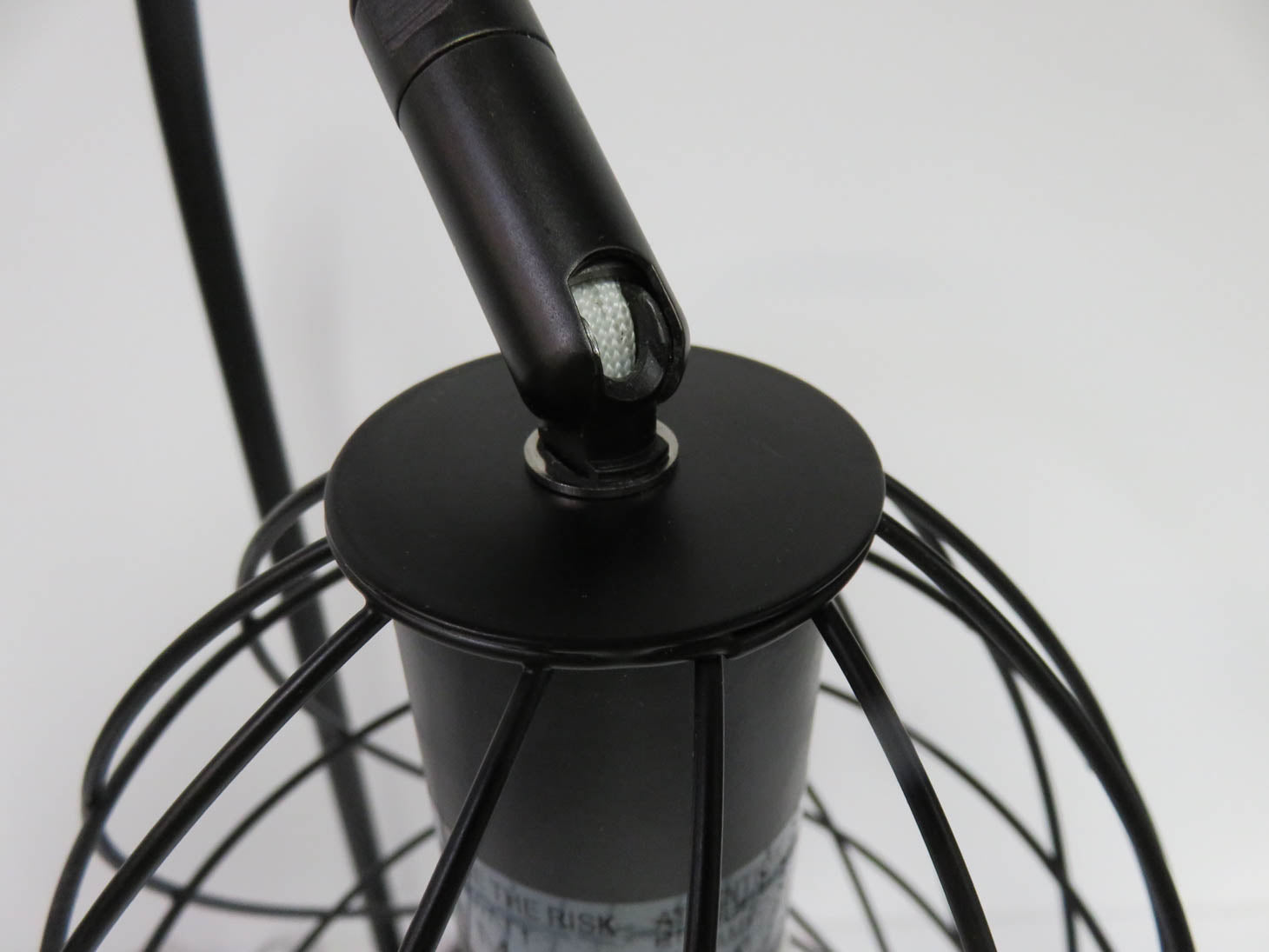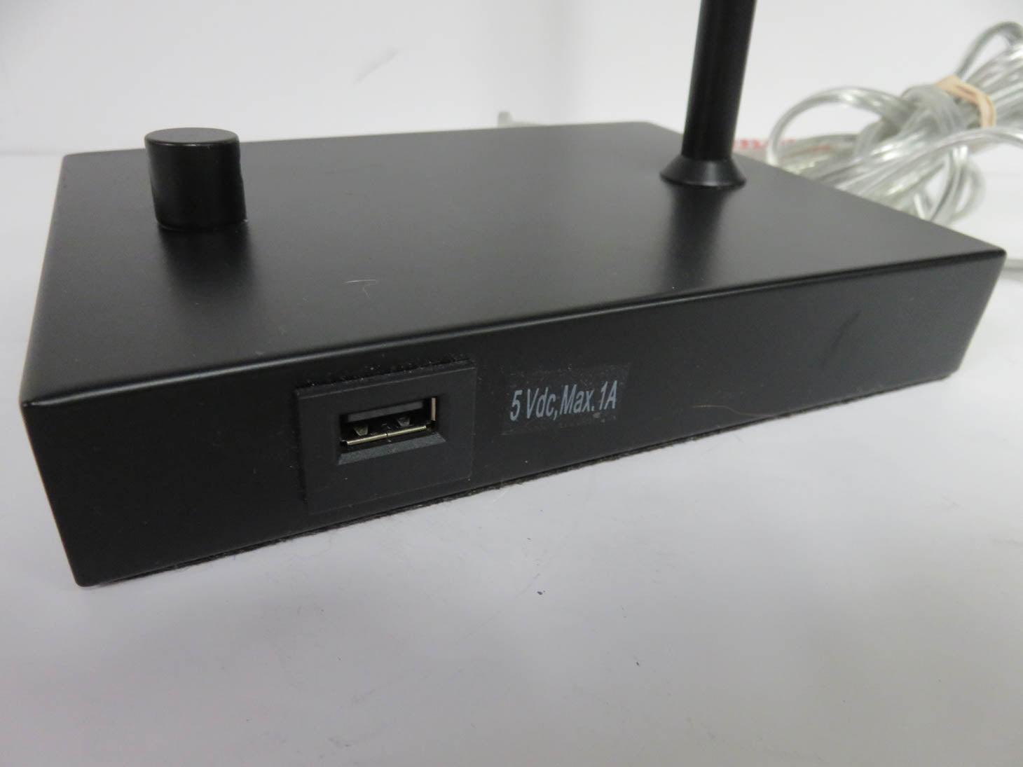 Dark brown metal arched stem, woven wire shade, rectangular base, has USB outlet