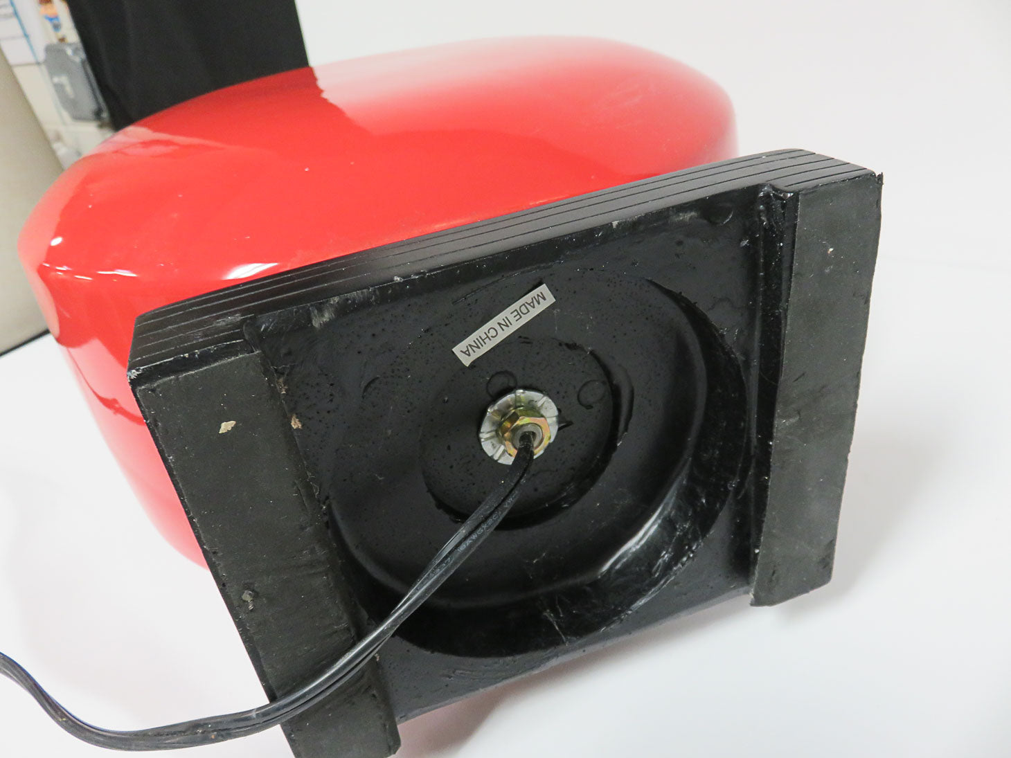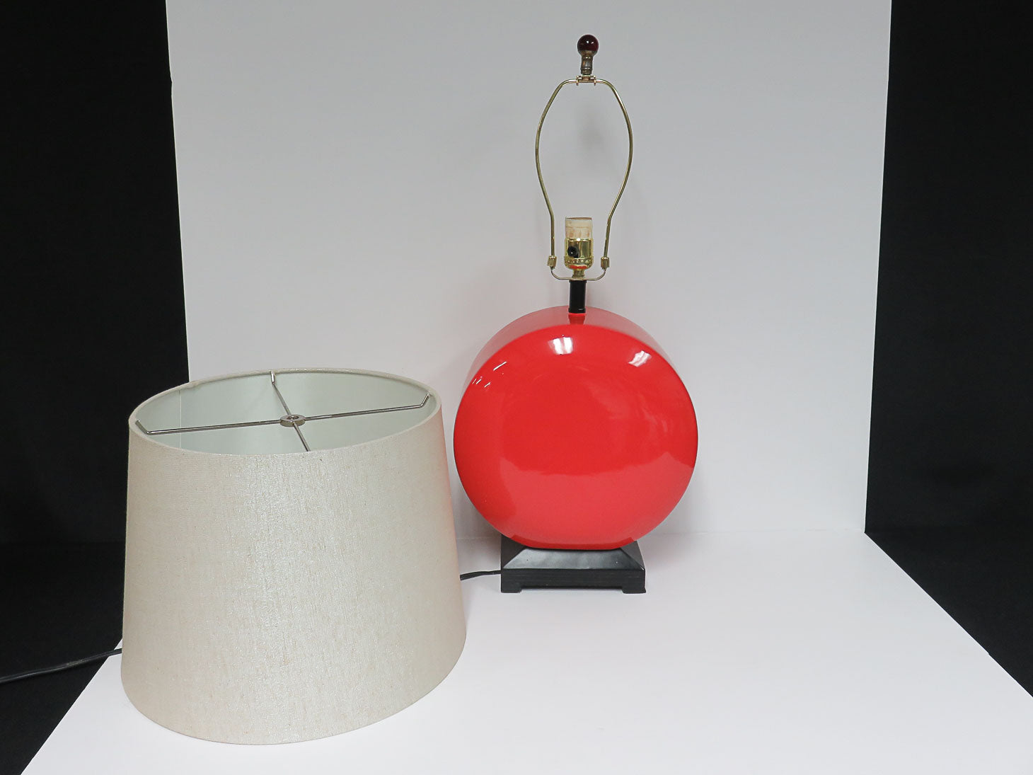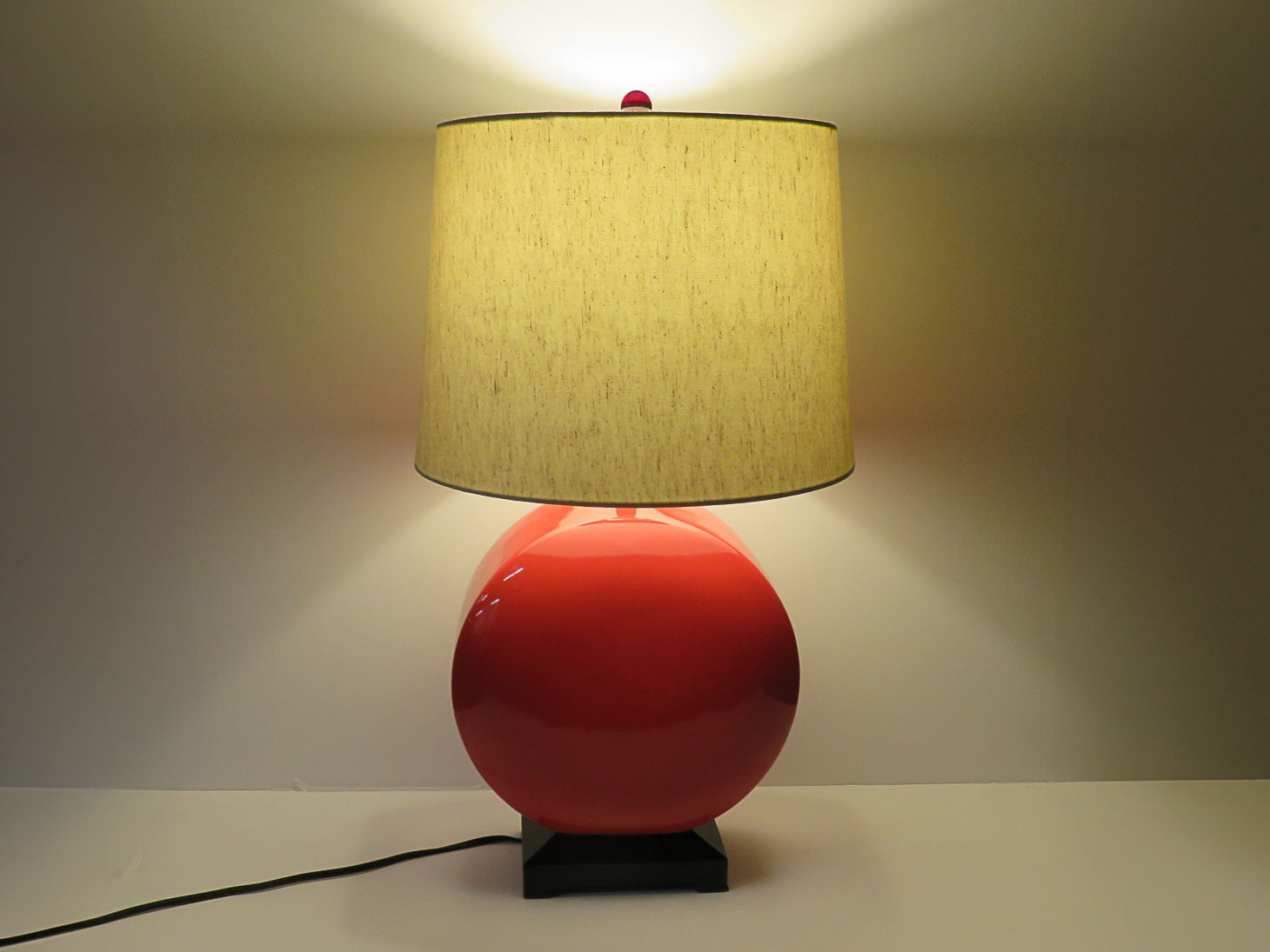 Red orange disc on black base with beige shade.