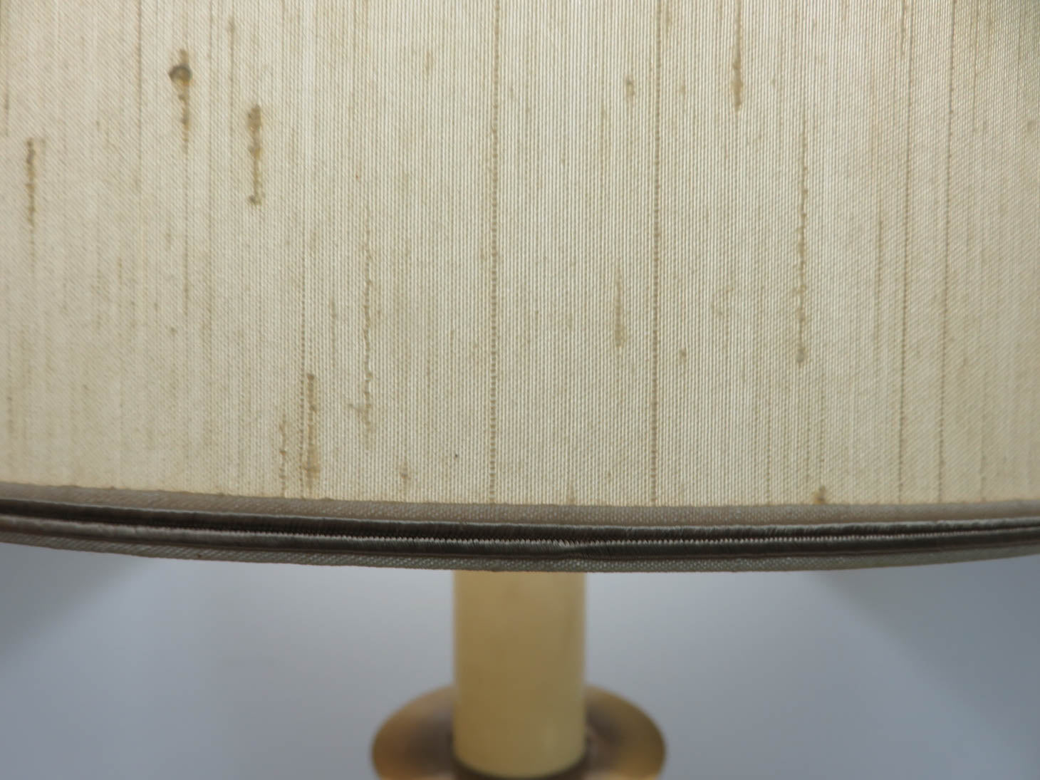 Antiqued brass color base, candlestick spindle design; shade is as found