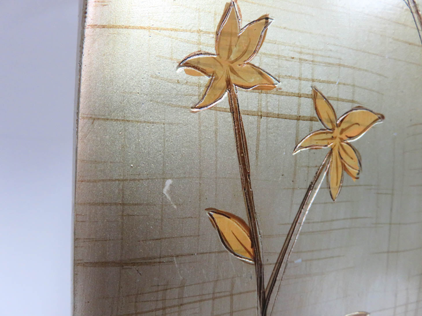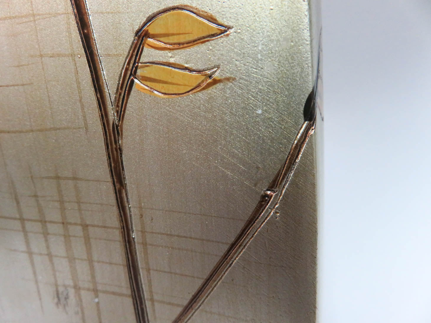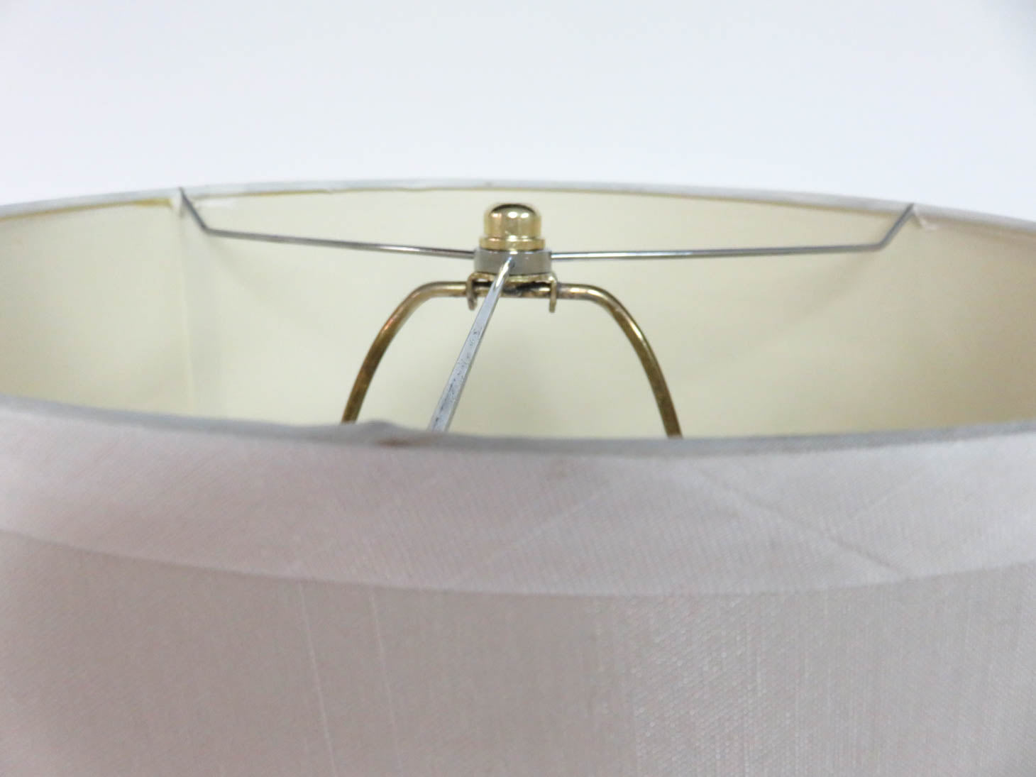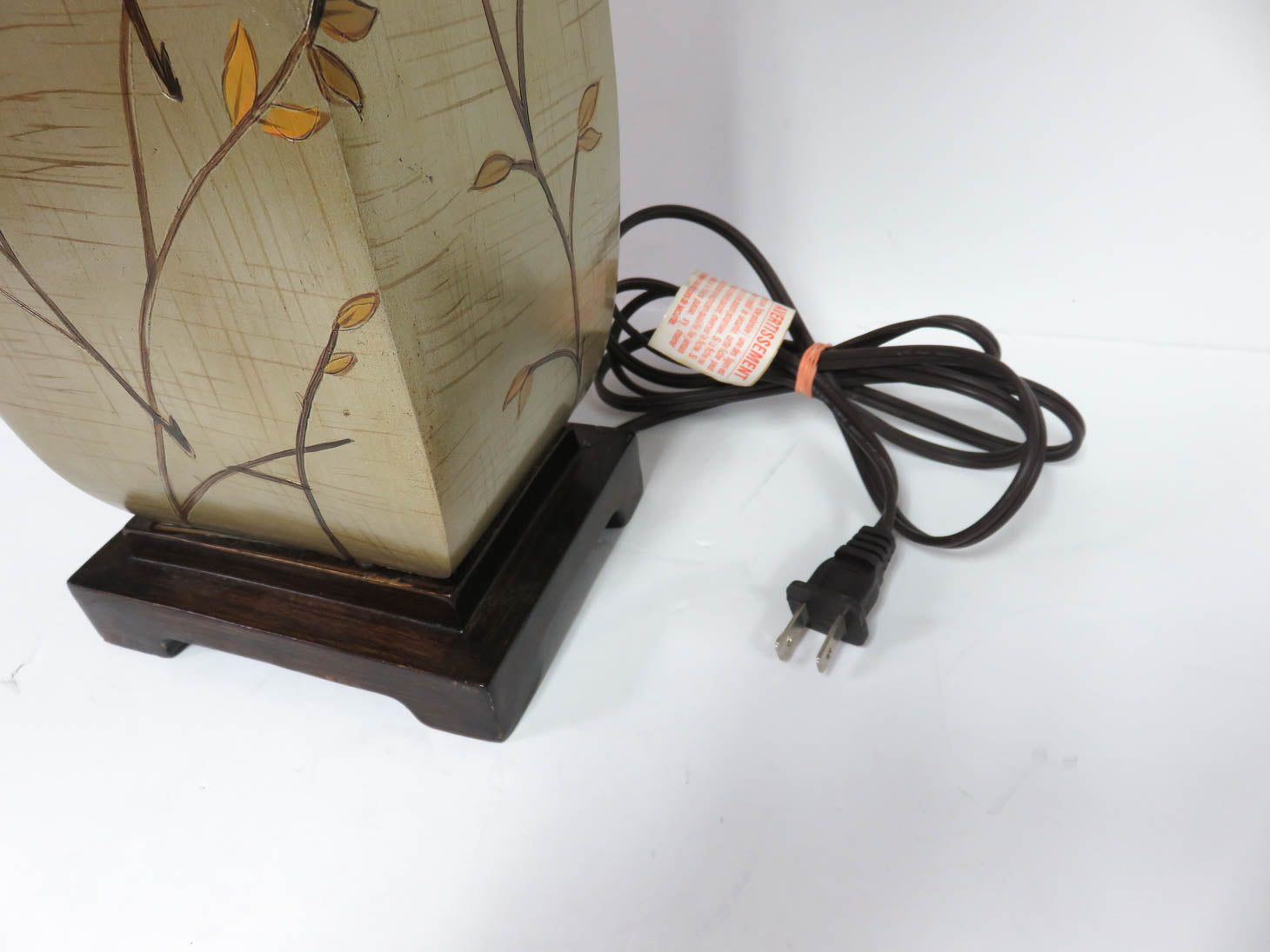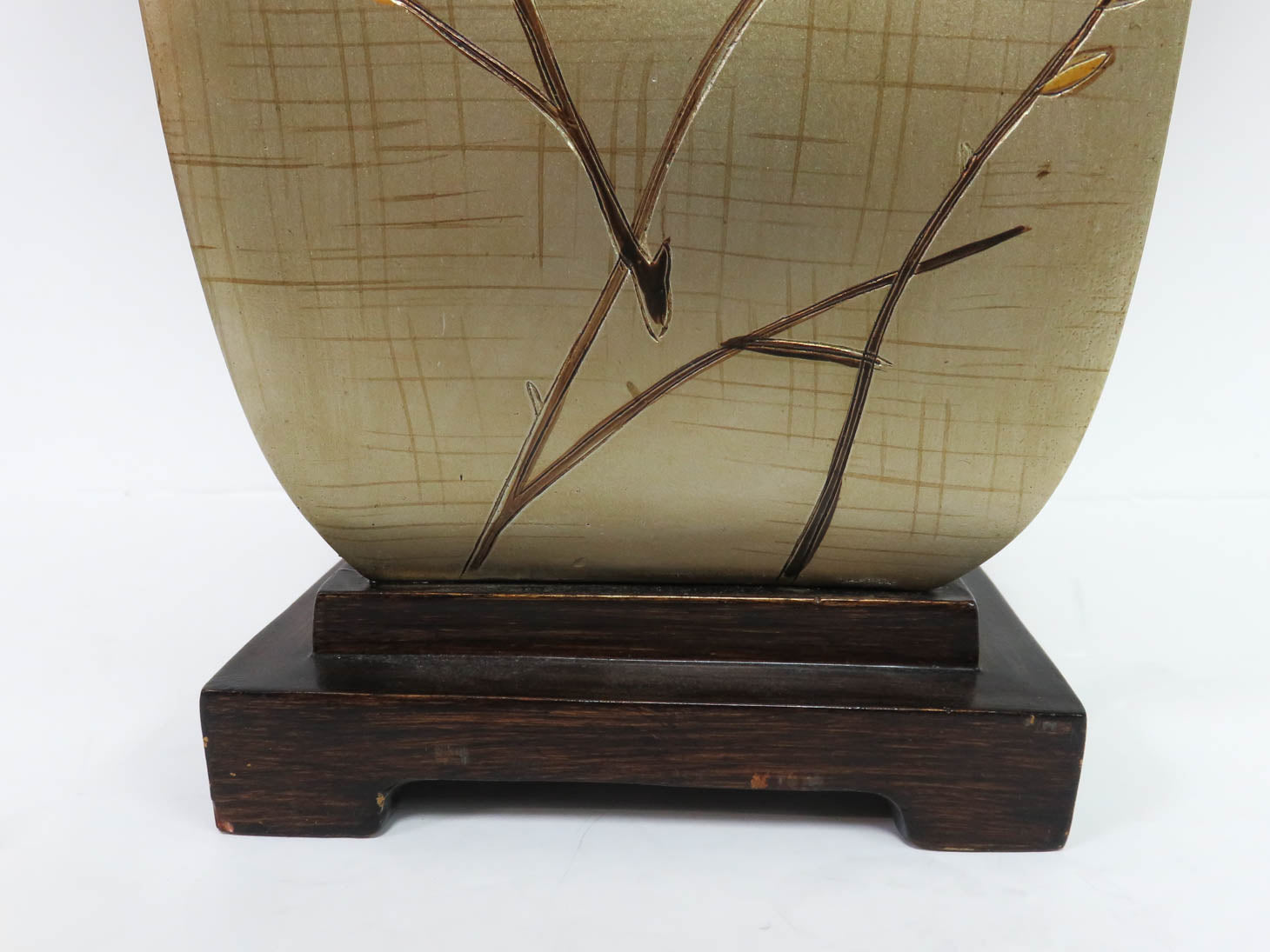 Brushed gold with leaf stem pattern on wood base, white shade with small dent. Two available, sold separately, #1835-1013.
