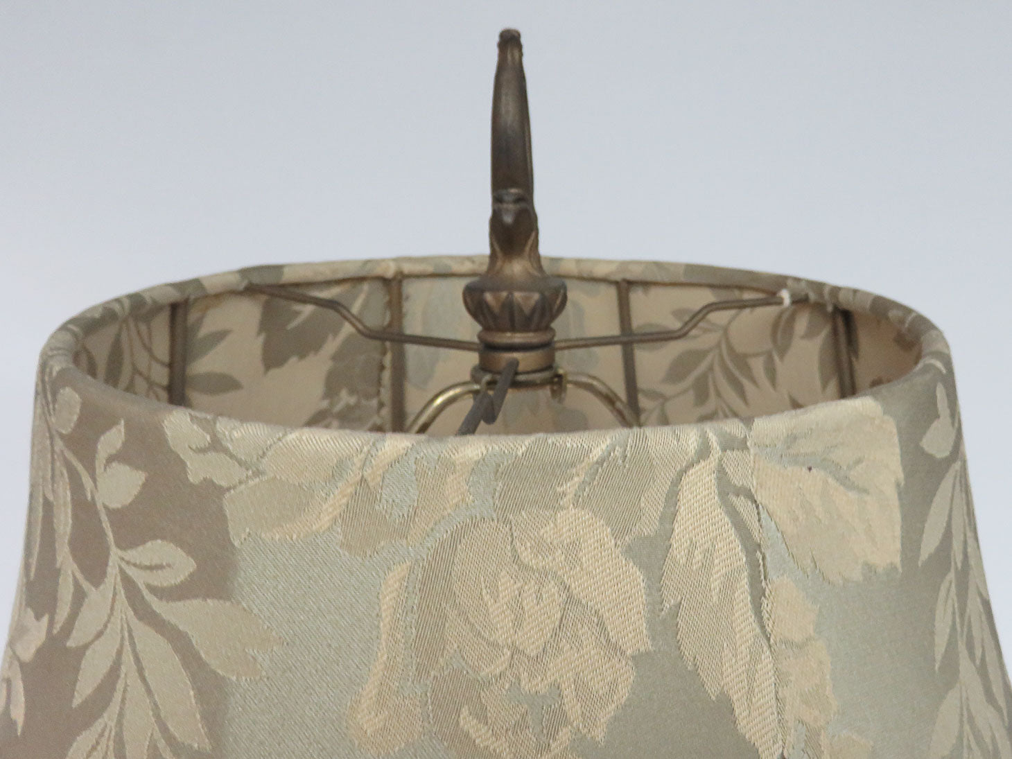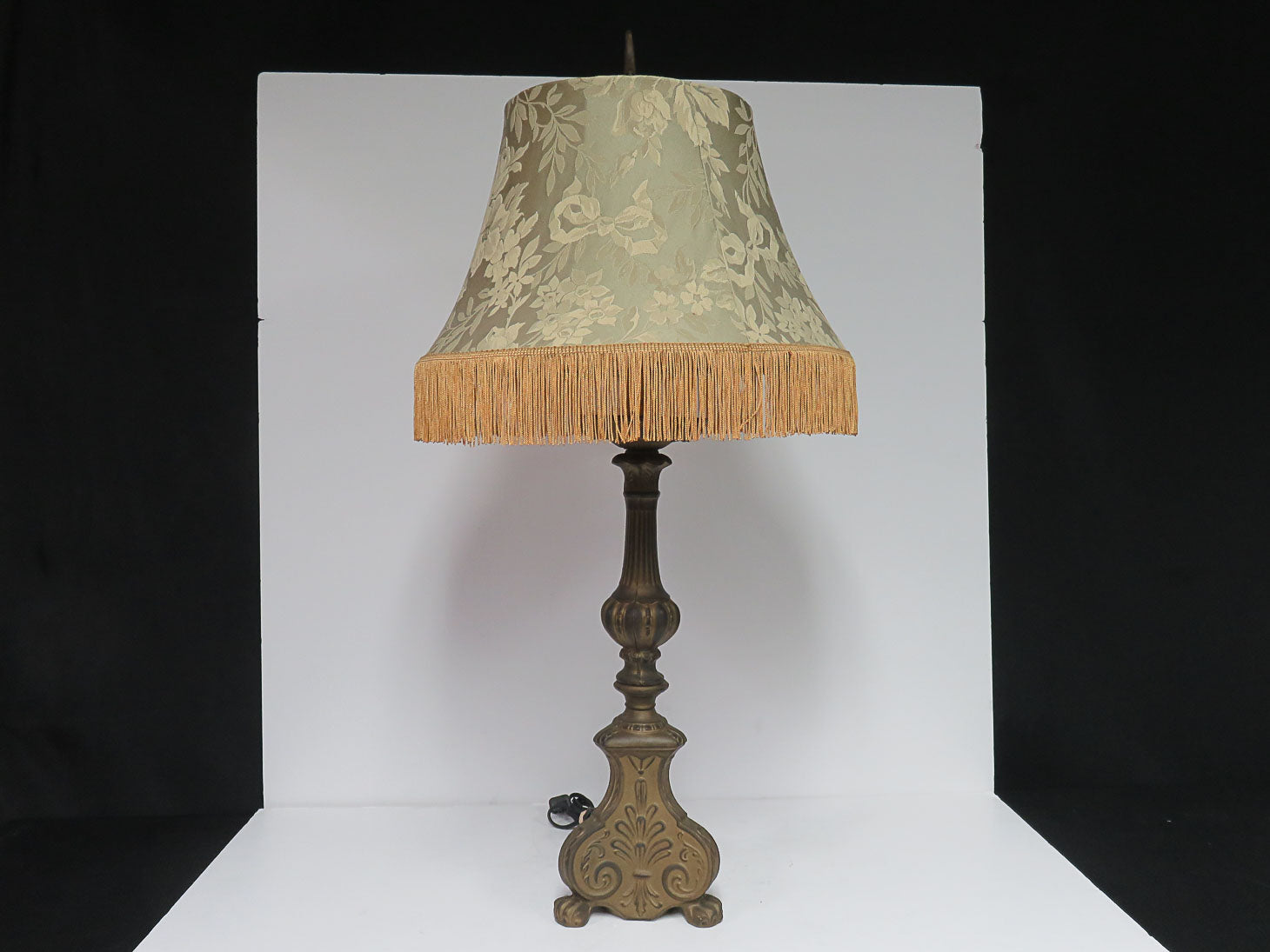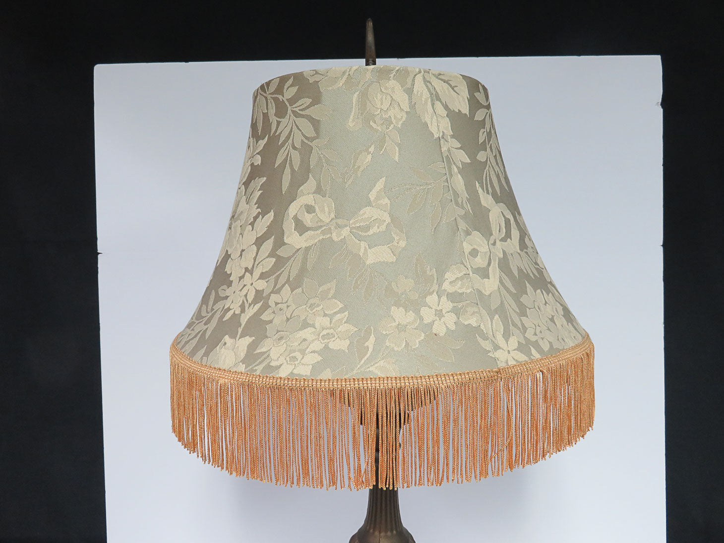 Tripod base, antique look, sage green brocade with fringe