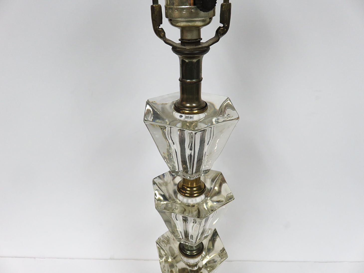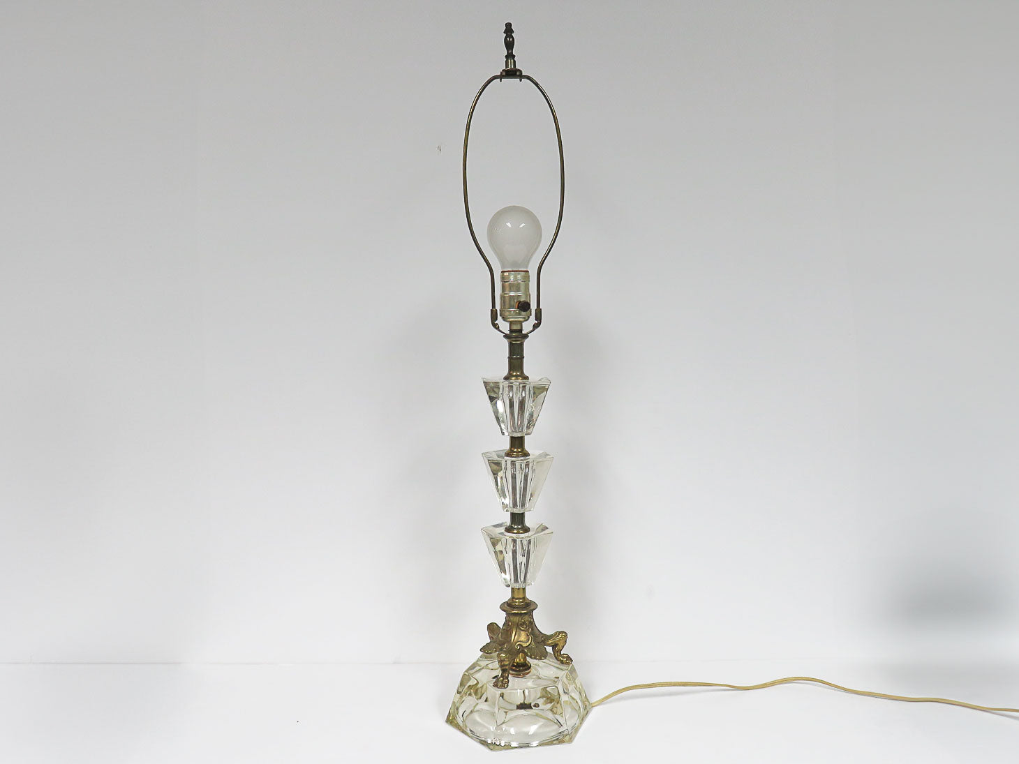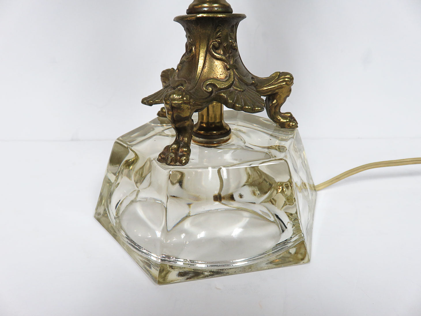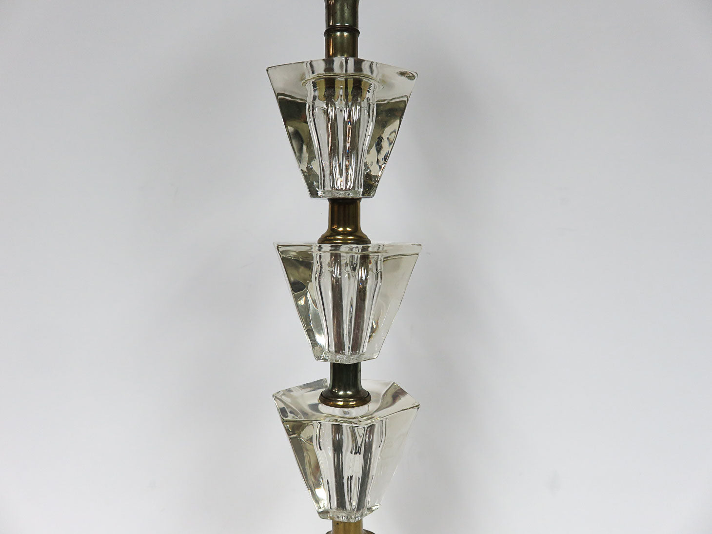 Three glass wedges with brass stem, decorative feet on clear base, no shade