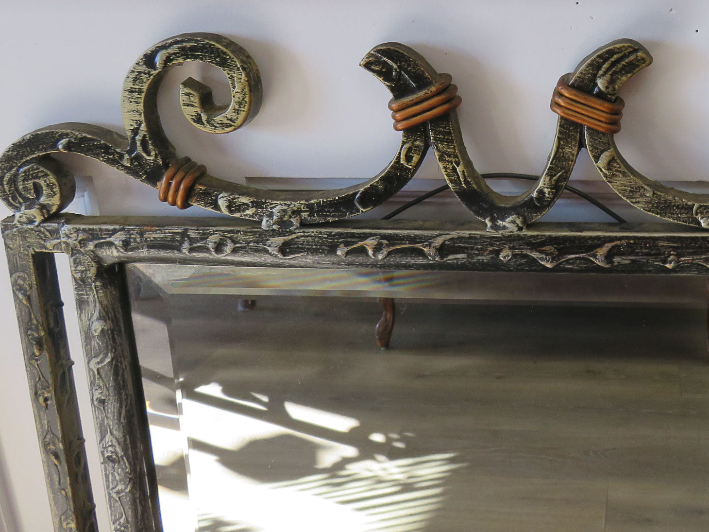 Vintage style wrought iron framed beveled mirror with distressed finish with copper toned accents