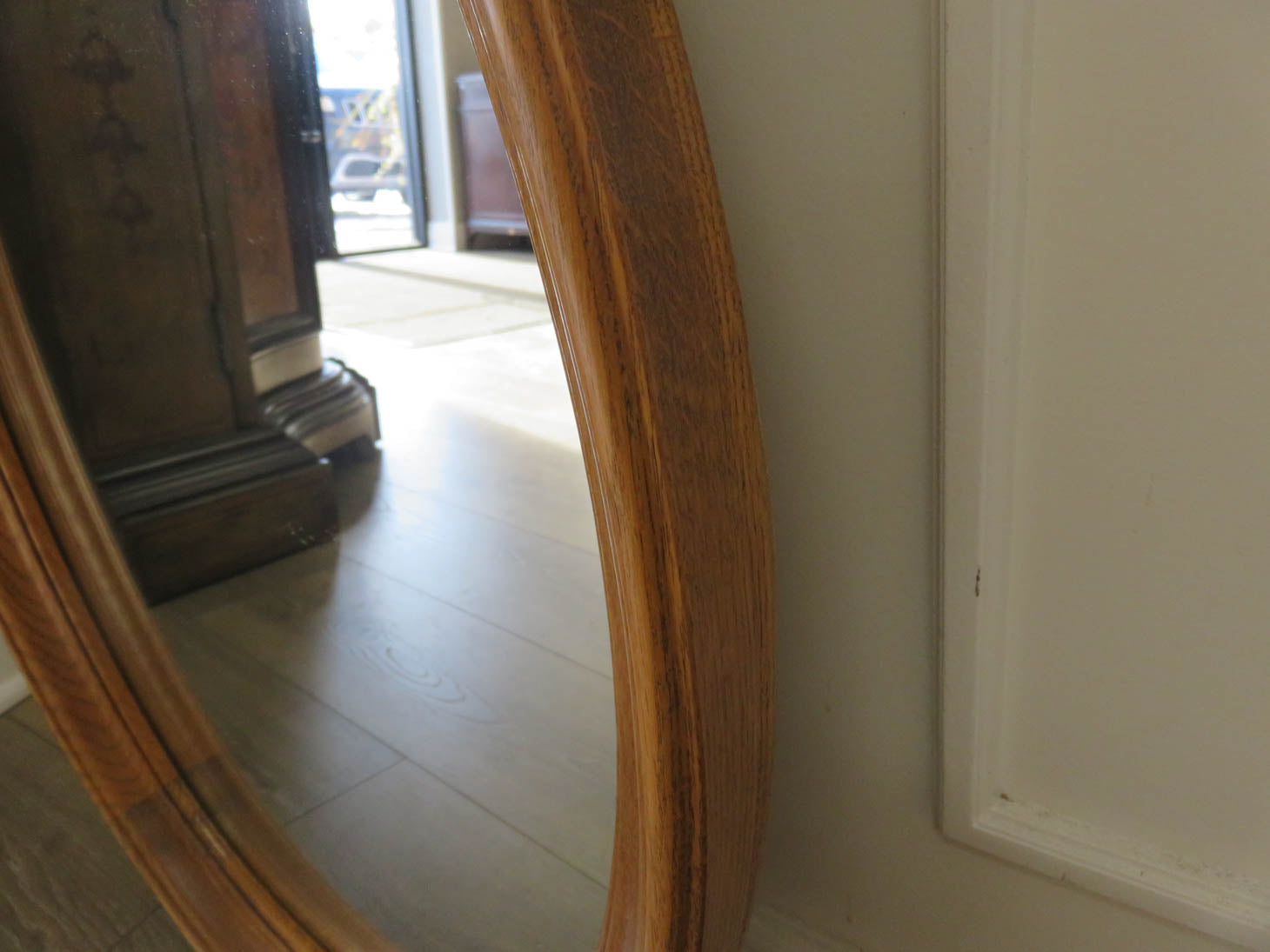Oval mirror in a medium brown frame. Wired to hang vertically