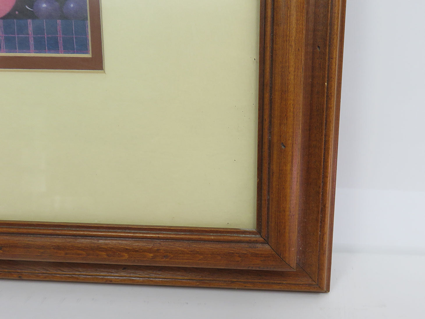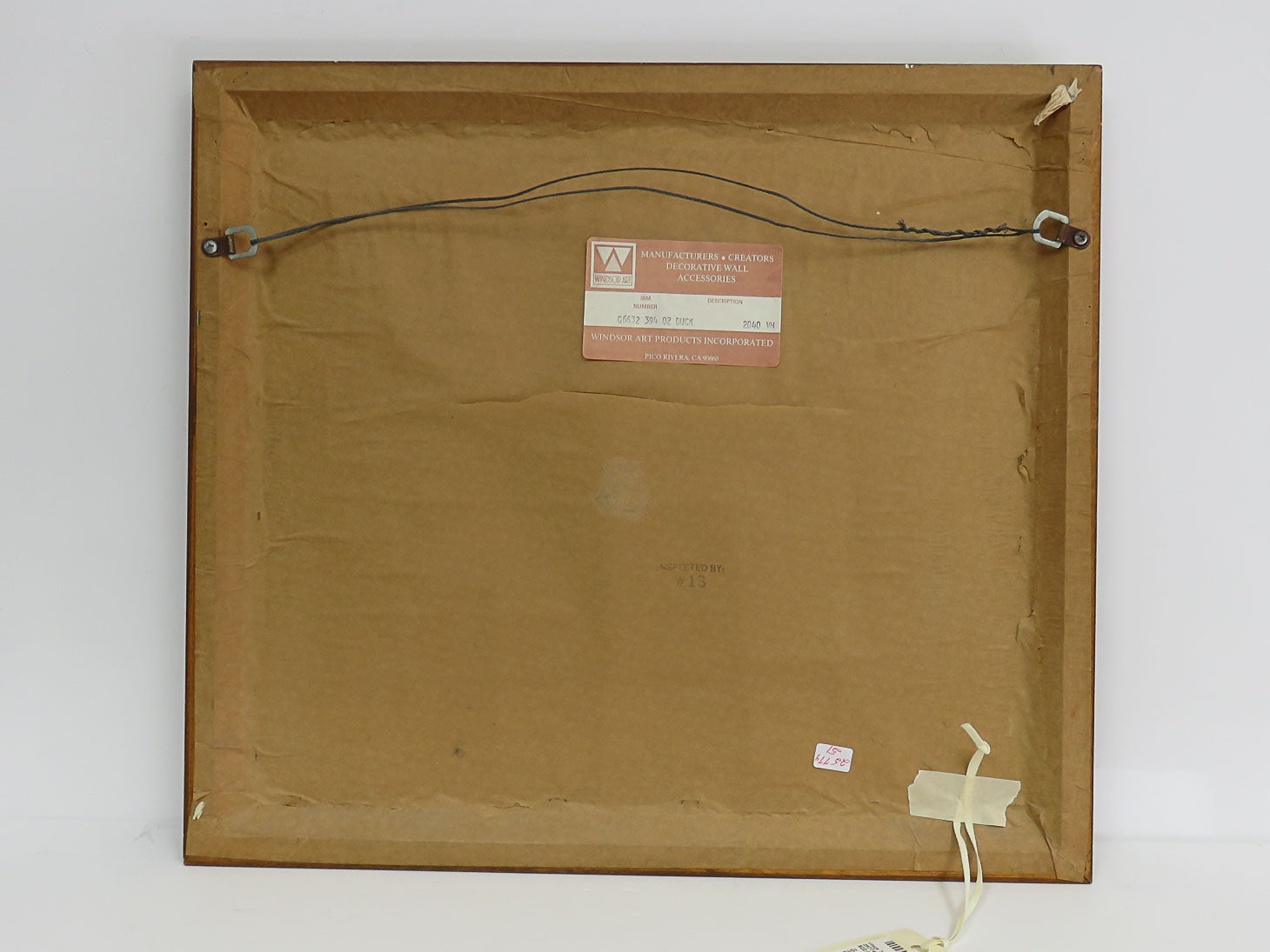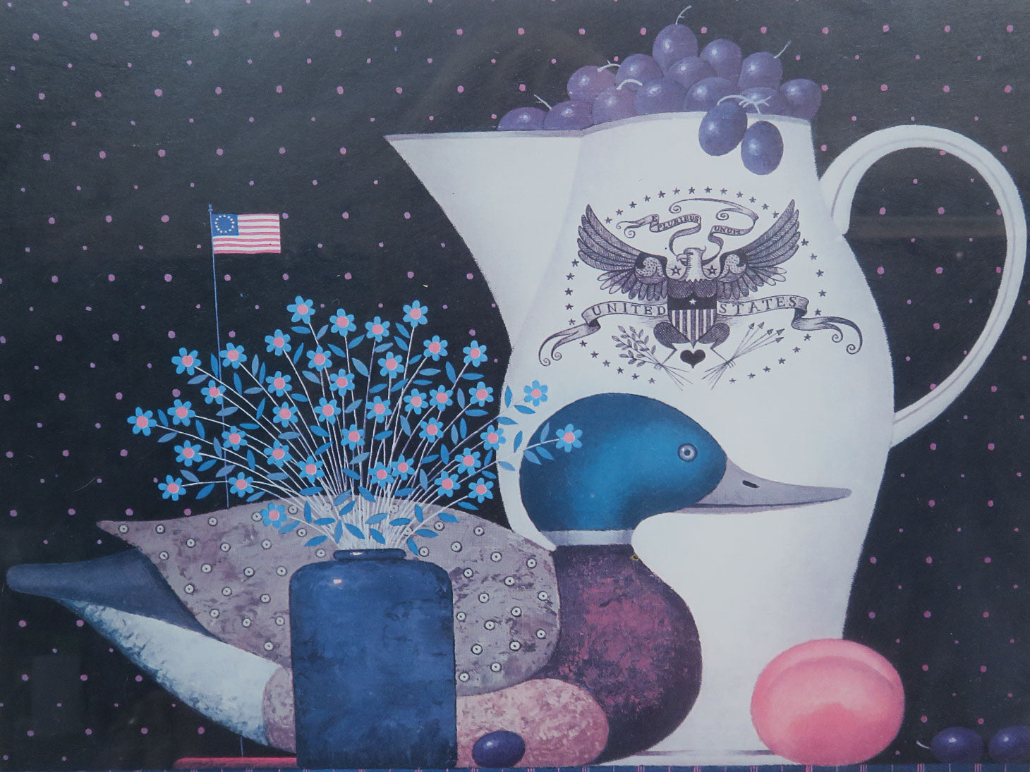 Still life with duck decoy, with vase of flowers and a pitcher with grapes in a brown wood frame.