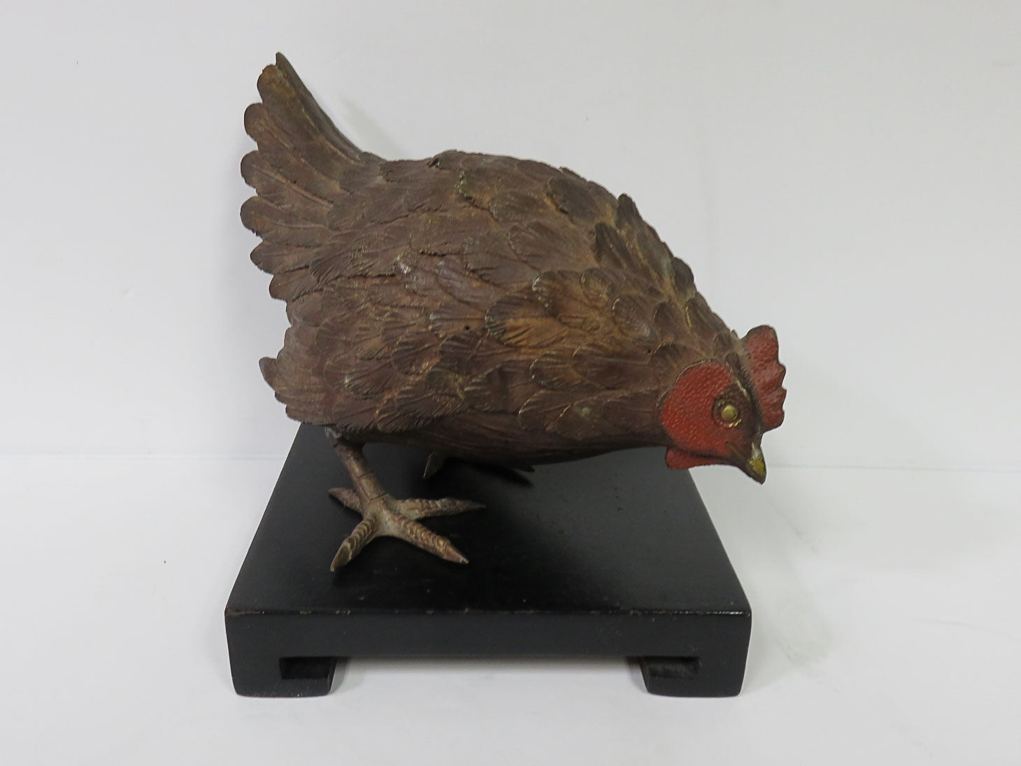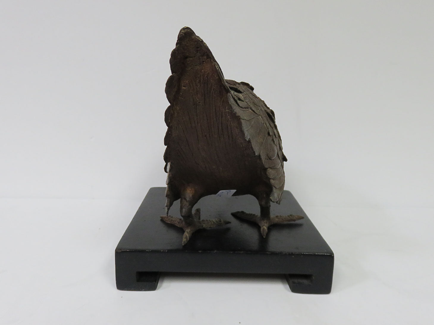 Standing, detailed feathers, upright tail, red comb on 6" x 6" square wood base 2pc