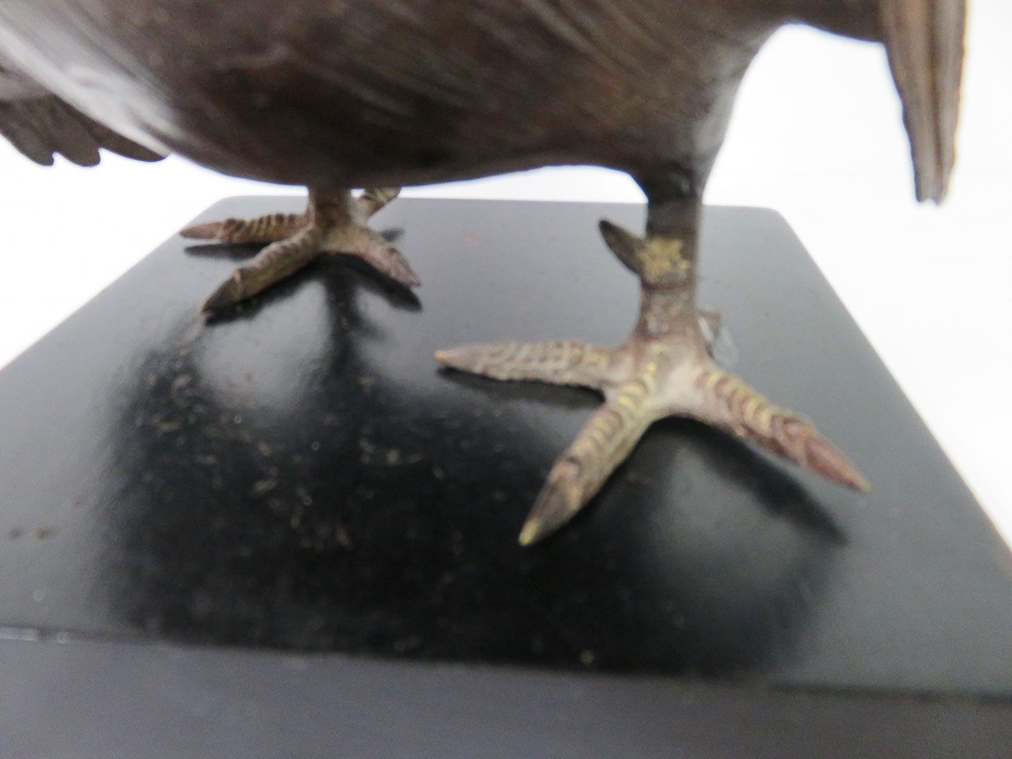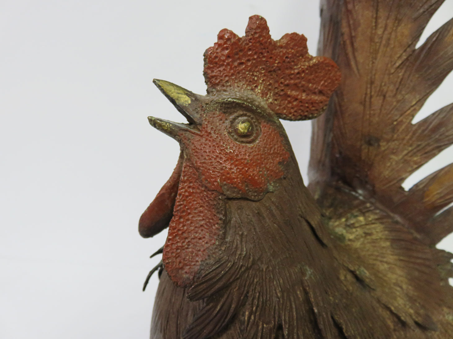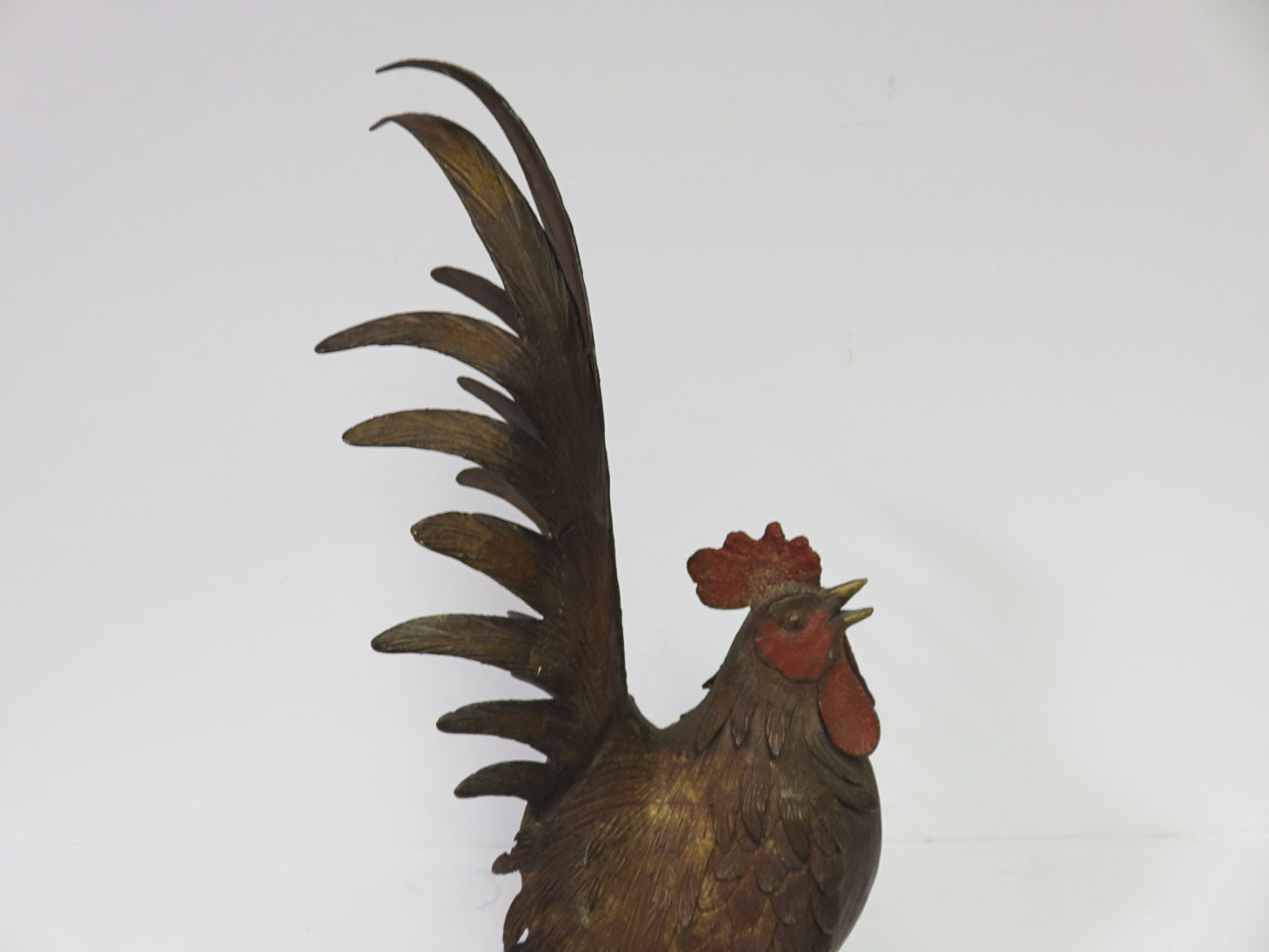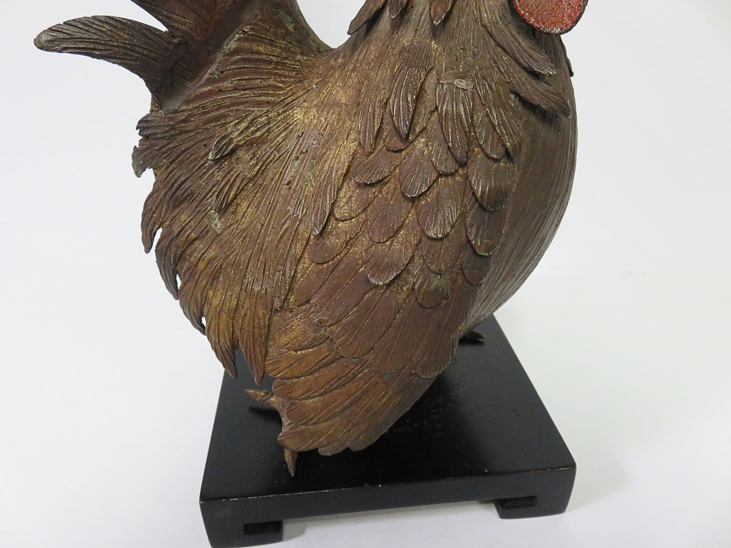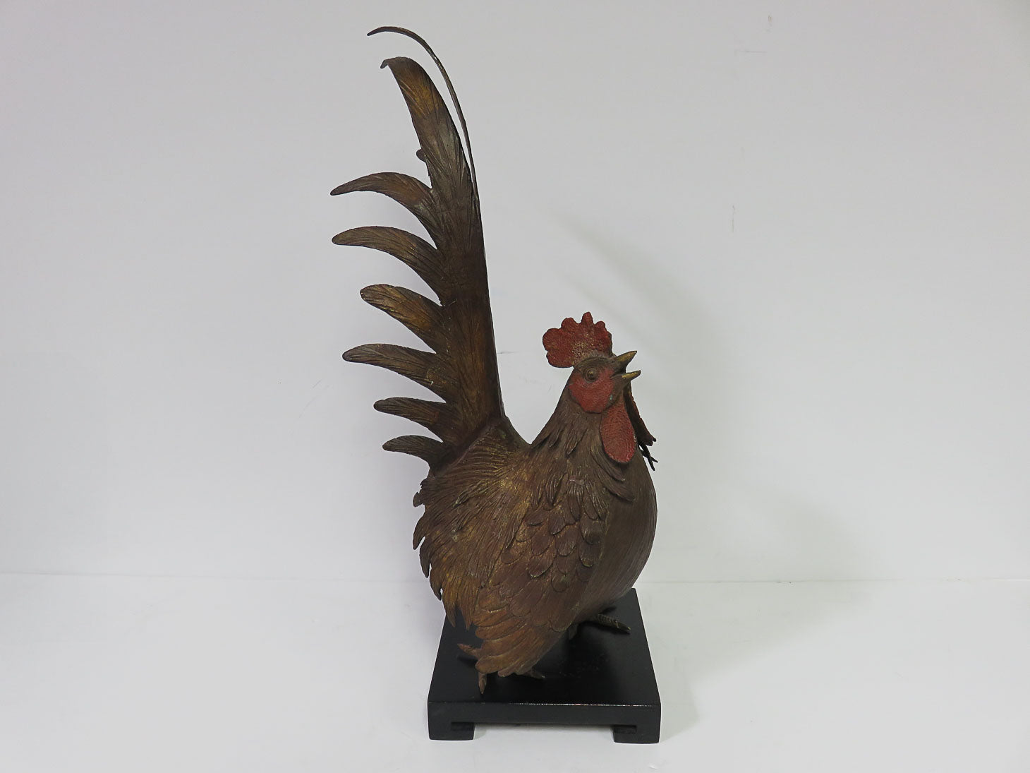 Item Number: 29141-7 Detailed feathers, rooster facing down, small red comb on 6" x 6" square wood base, 2pc 5.5" H (off stand)