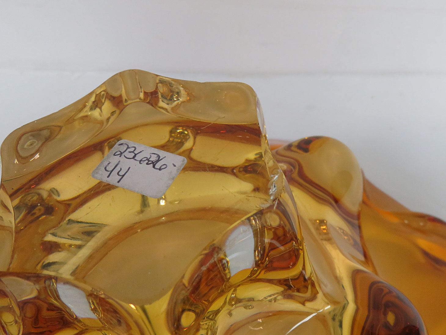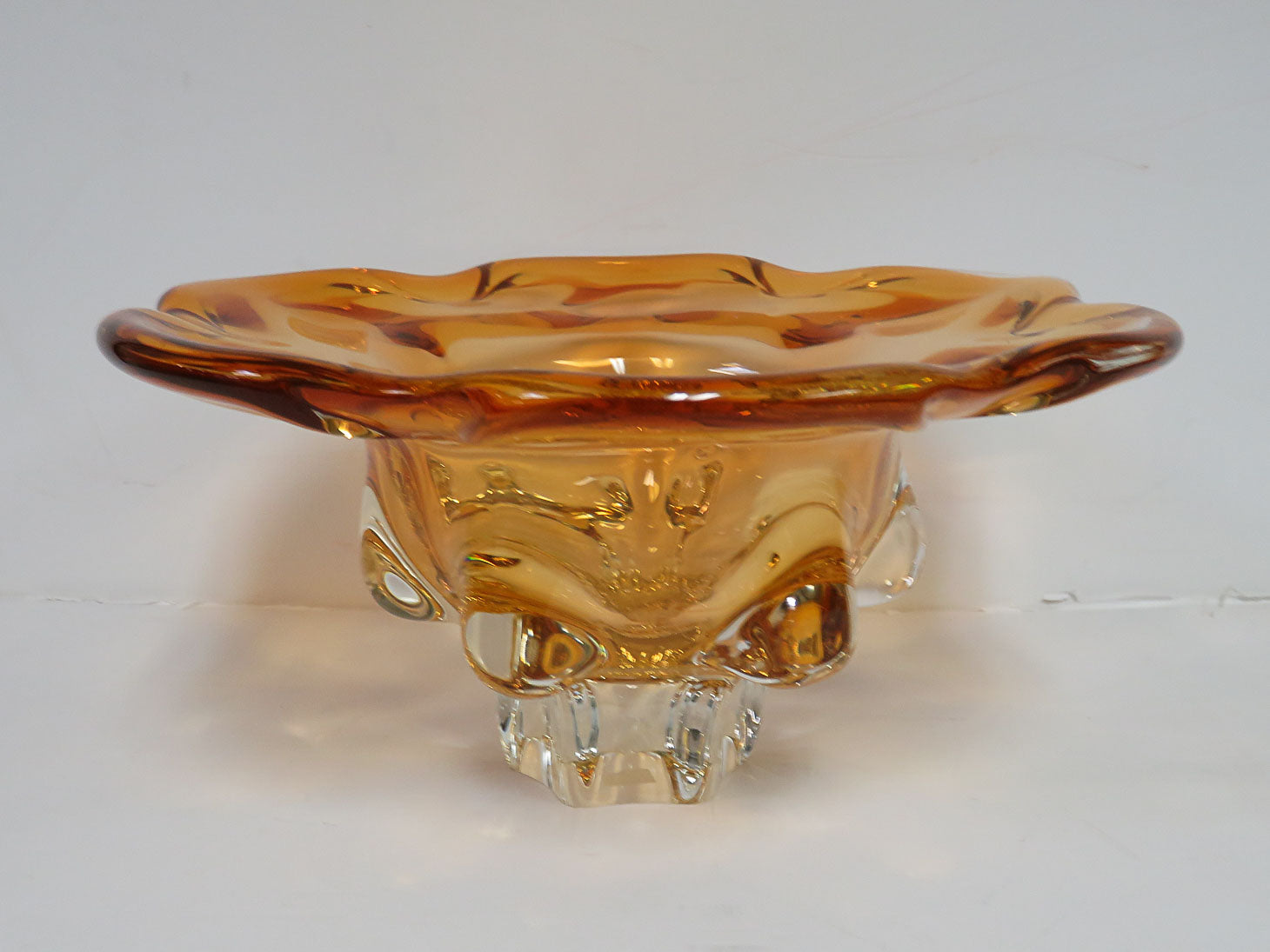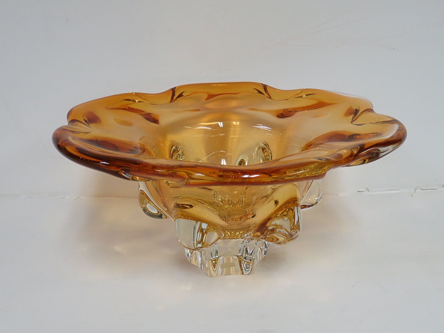 Amber, scalloped edge, raised flares on side. small chip on bottom