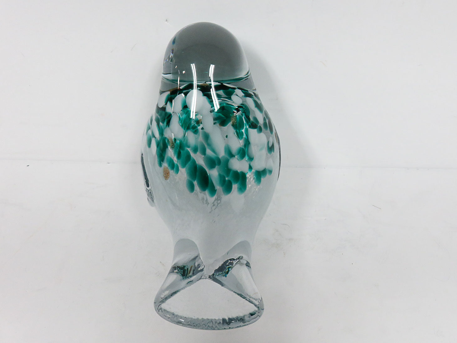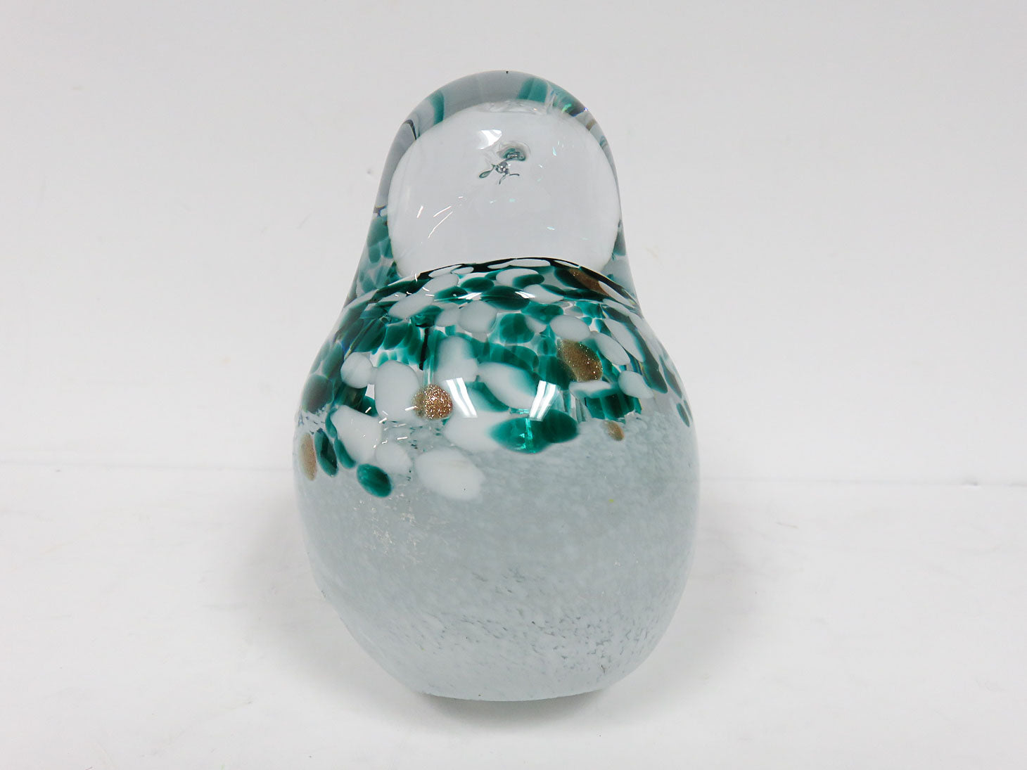 Clear mouthblown art glass with green and gold speckles and white flocking