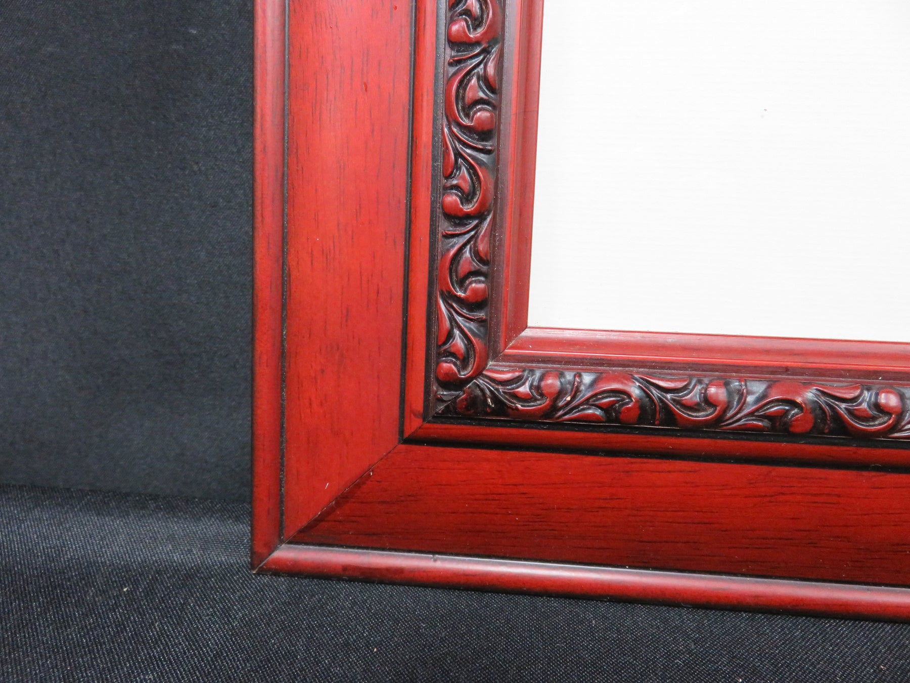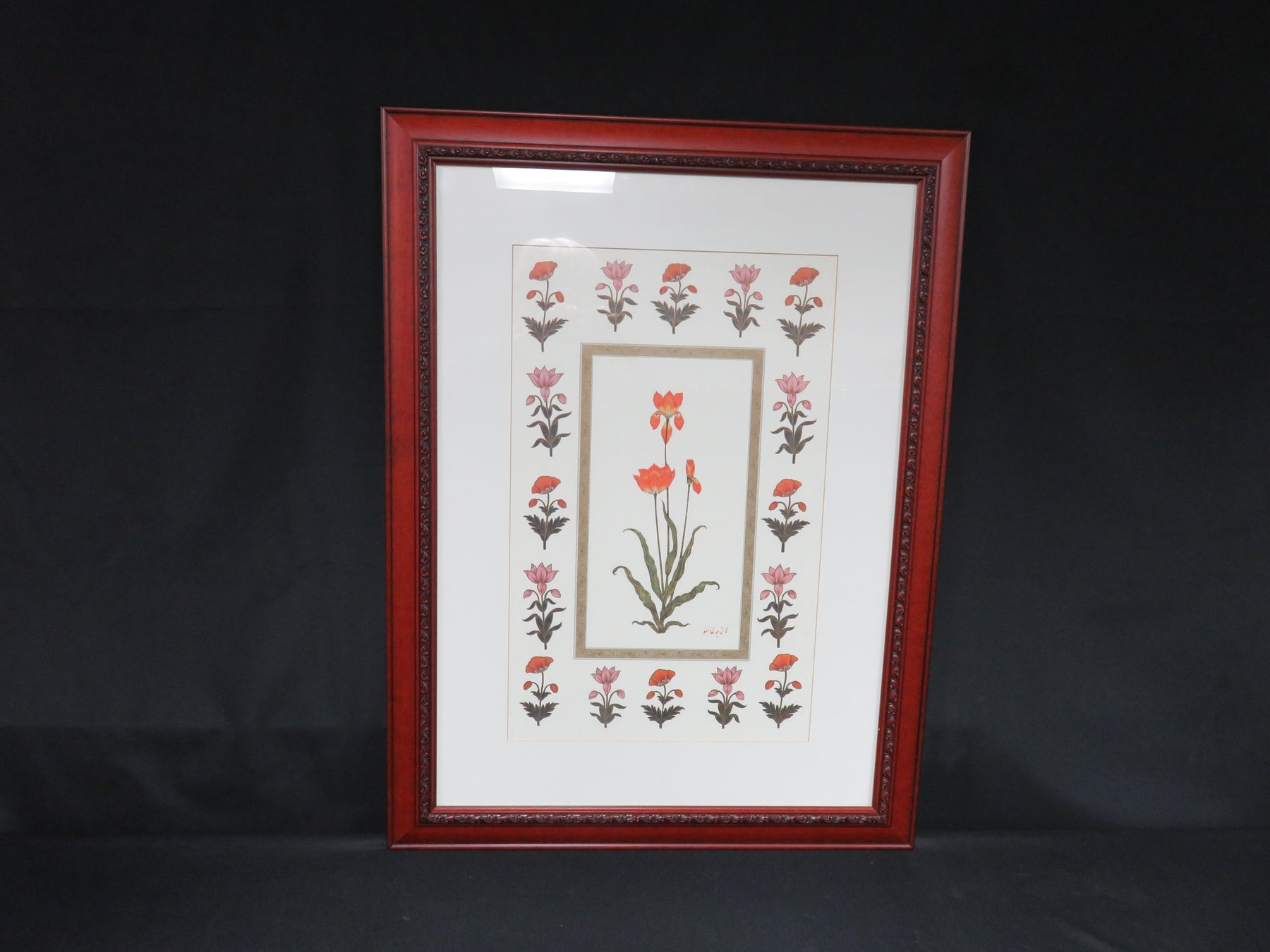 Botanical with orange center flower and border of orange and pink flowers, cherry frame