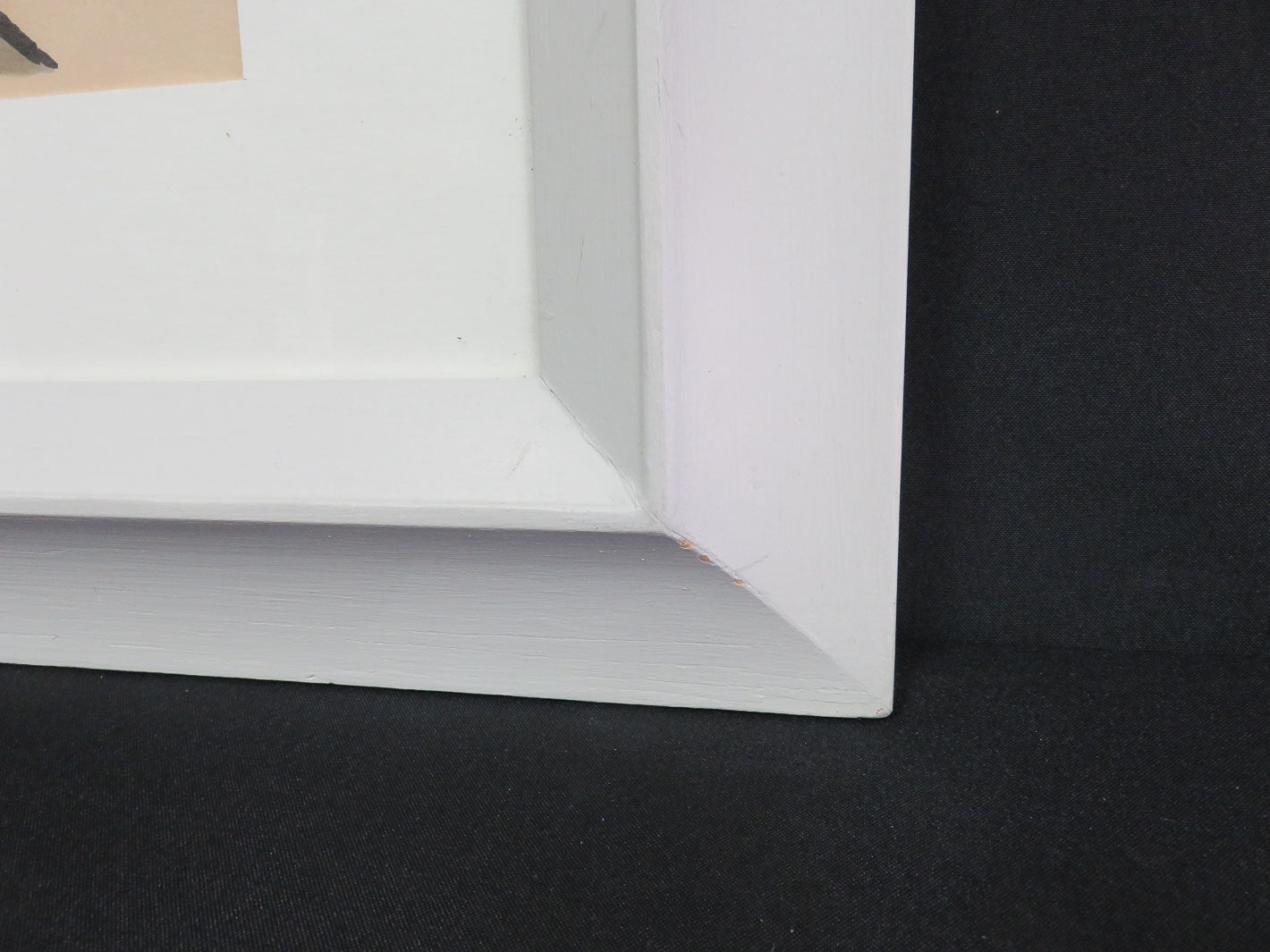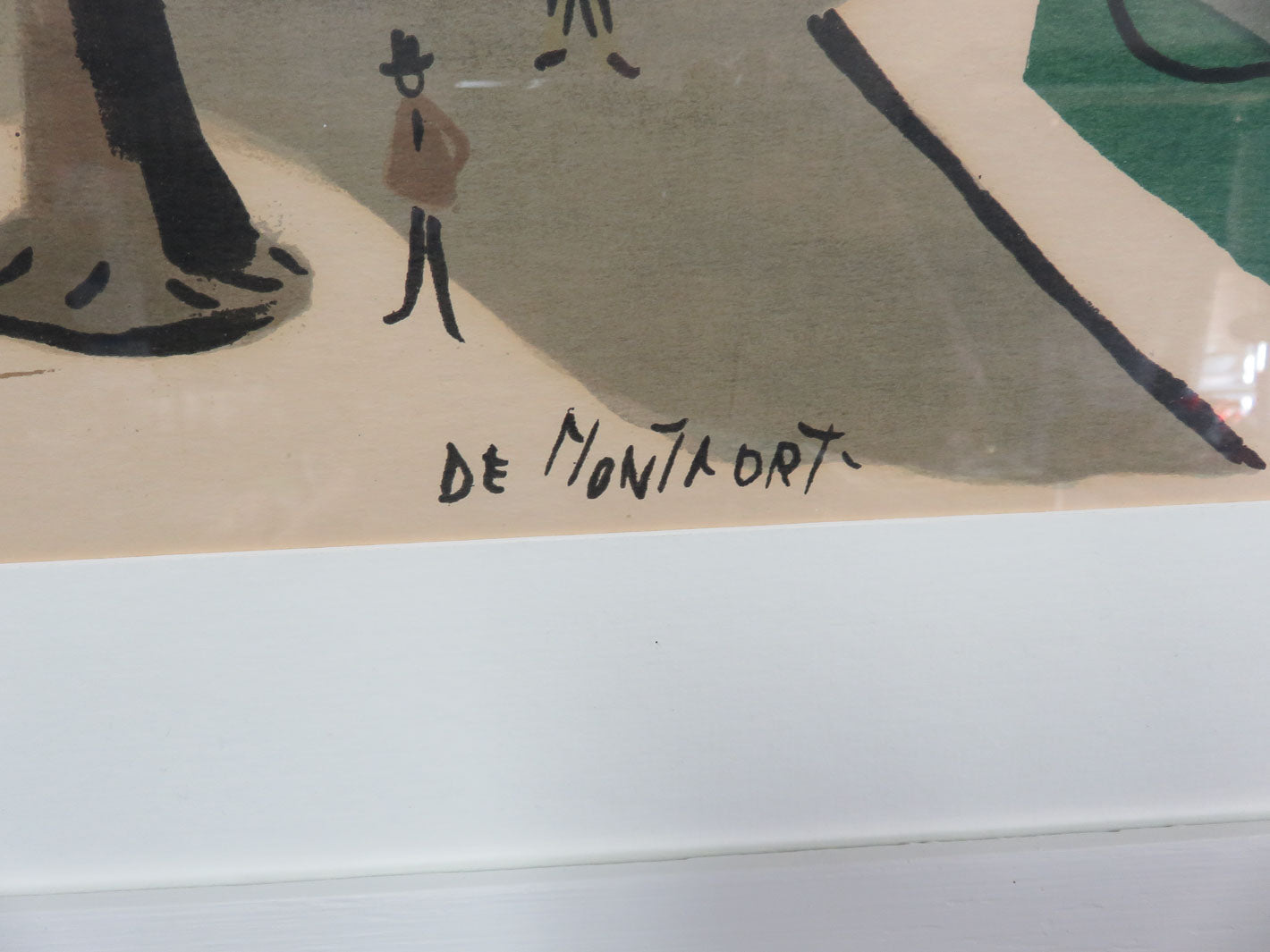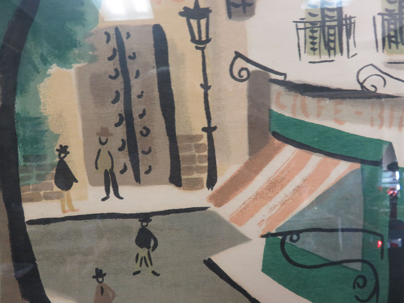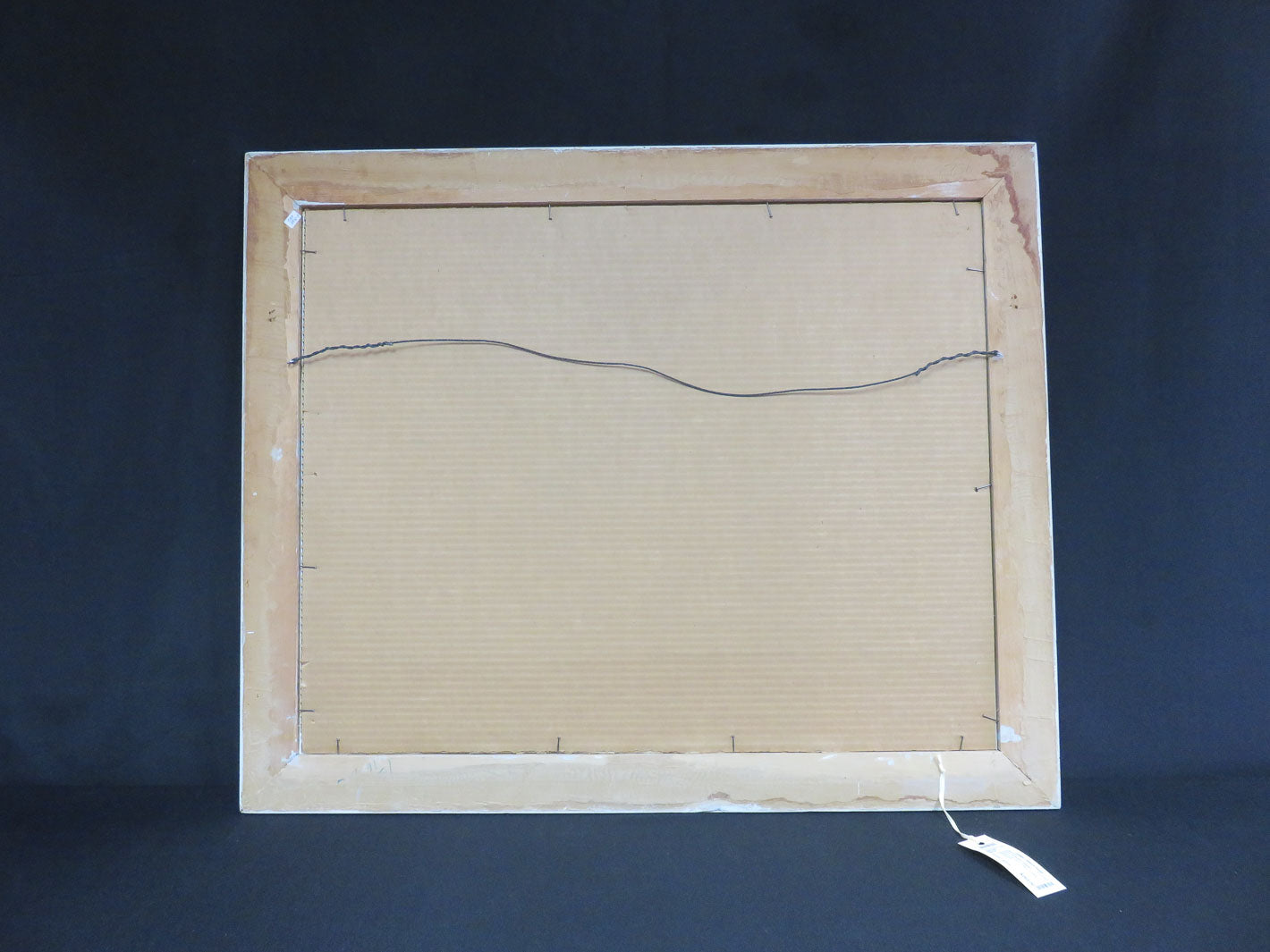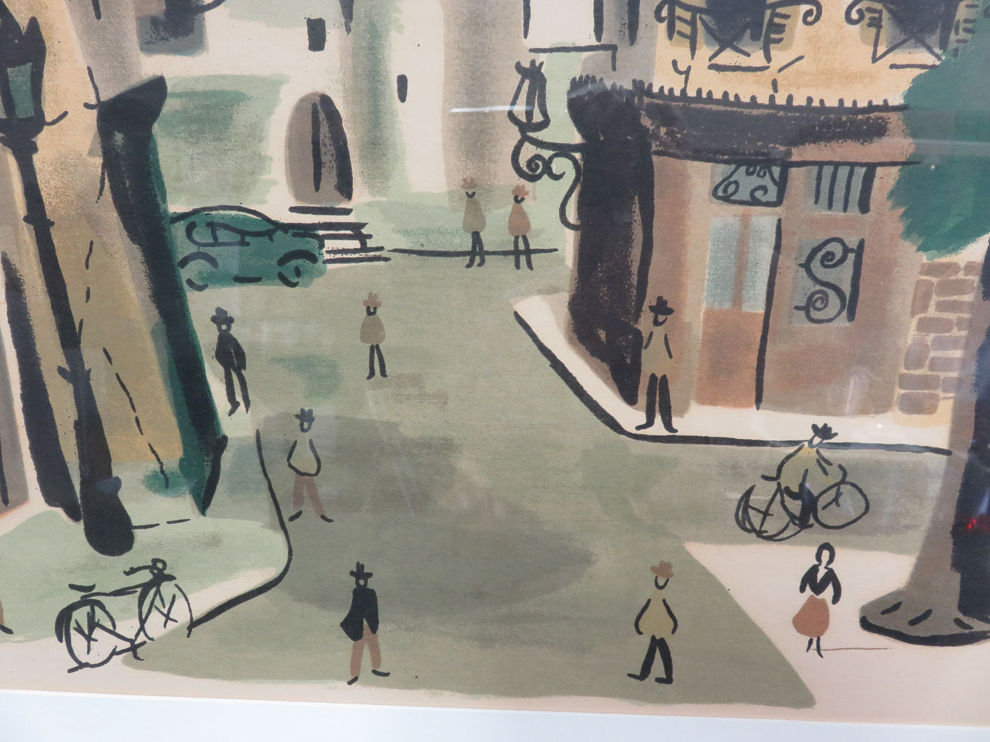 Item Number: 6360-446 "Street with Clock Tower" in white wood frame. French artist (1910-?) 37" x 31"