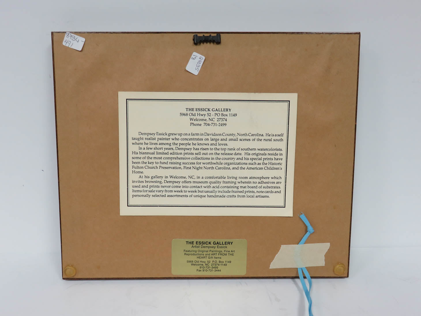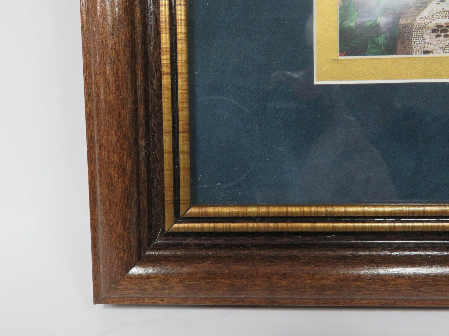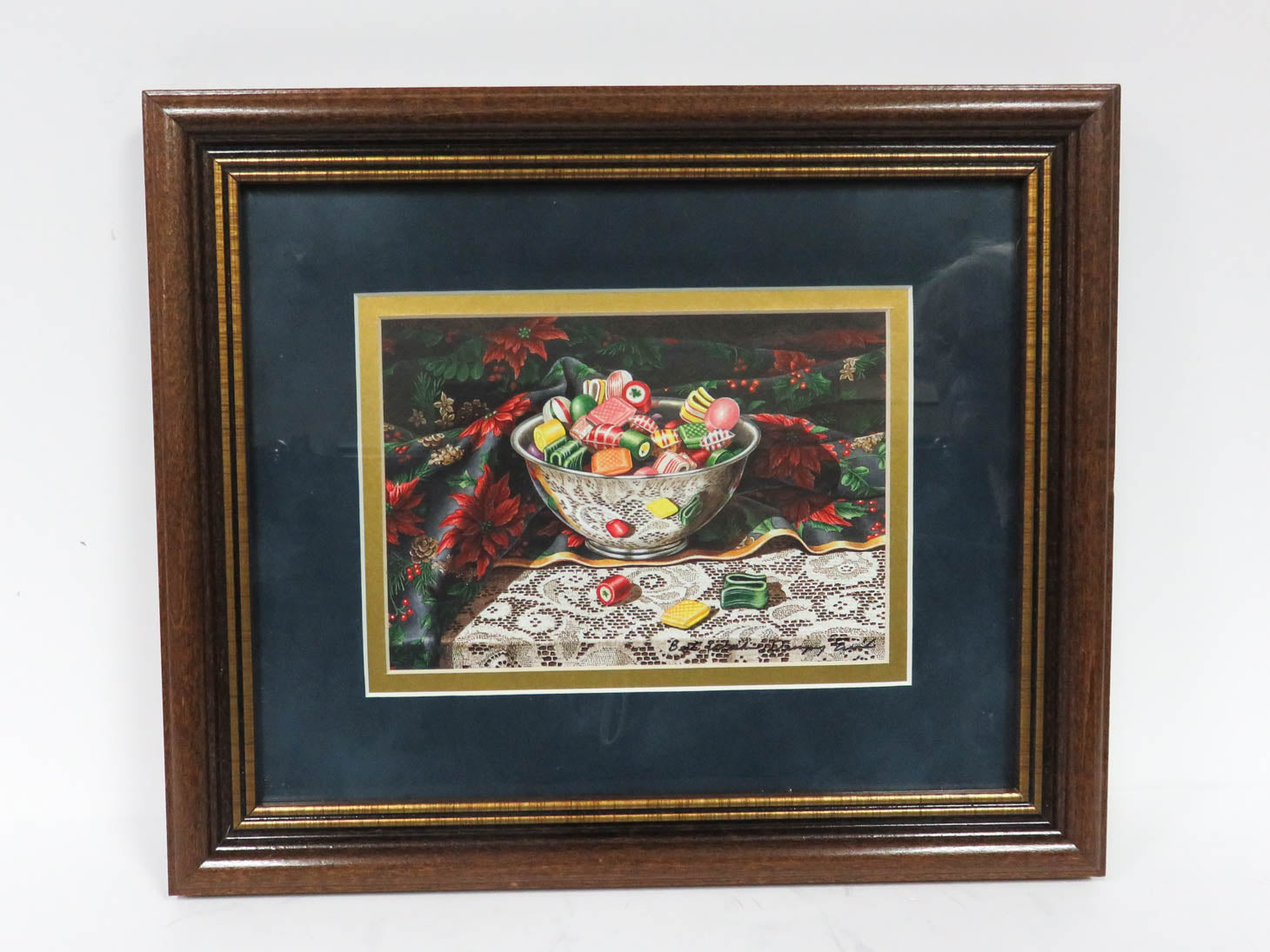 Colorful candies in a silver bowl on a table with with lace and poinsettia fabric in a wood frame. Signed Dempsey Essick