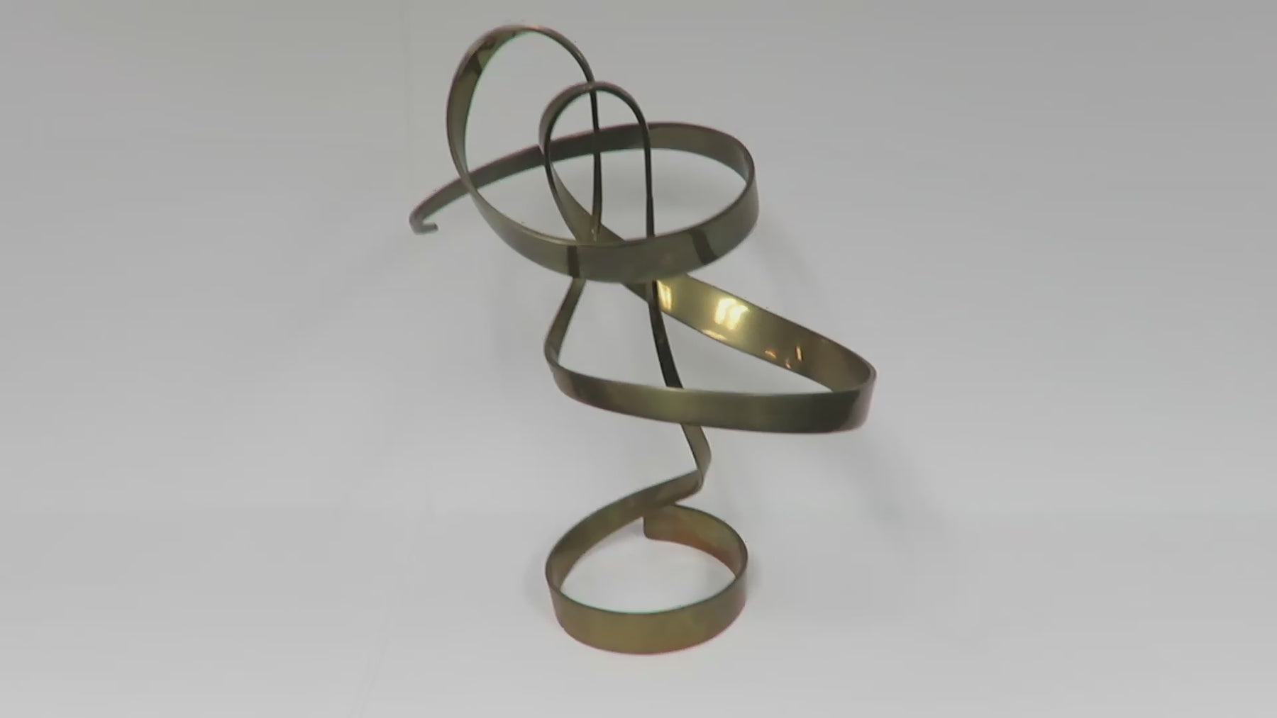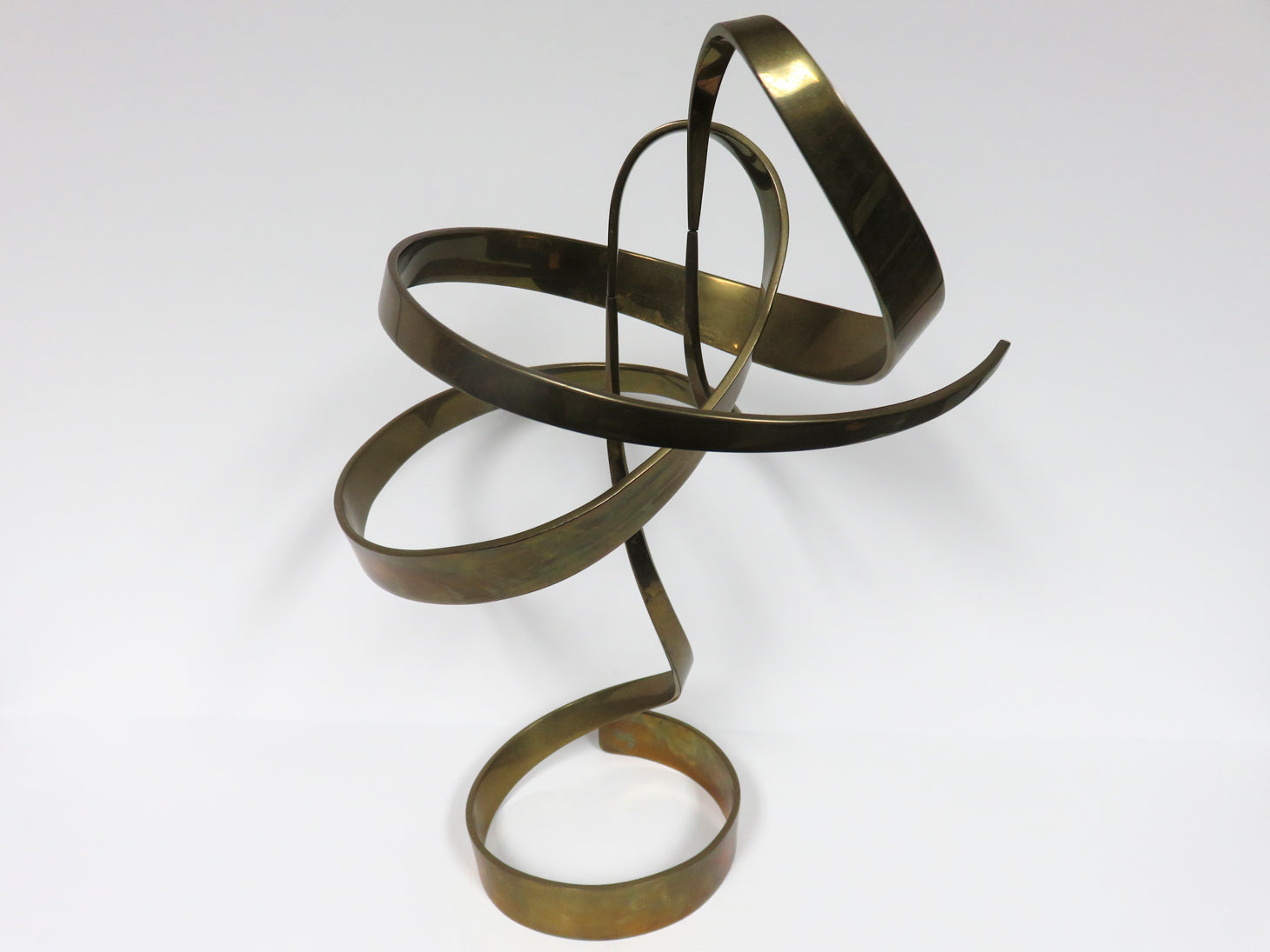 Item Number: 3517-4 Vintage 1990 3-piece brass kinetic ribbon sculpture, mid-century modern, pieces balance and spin. 13"W x 11"D x 17.5"H