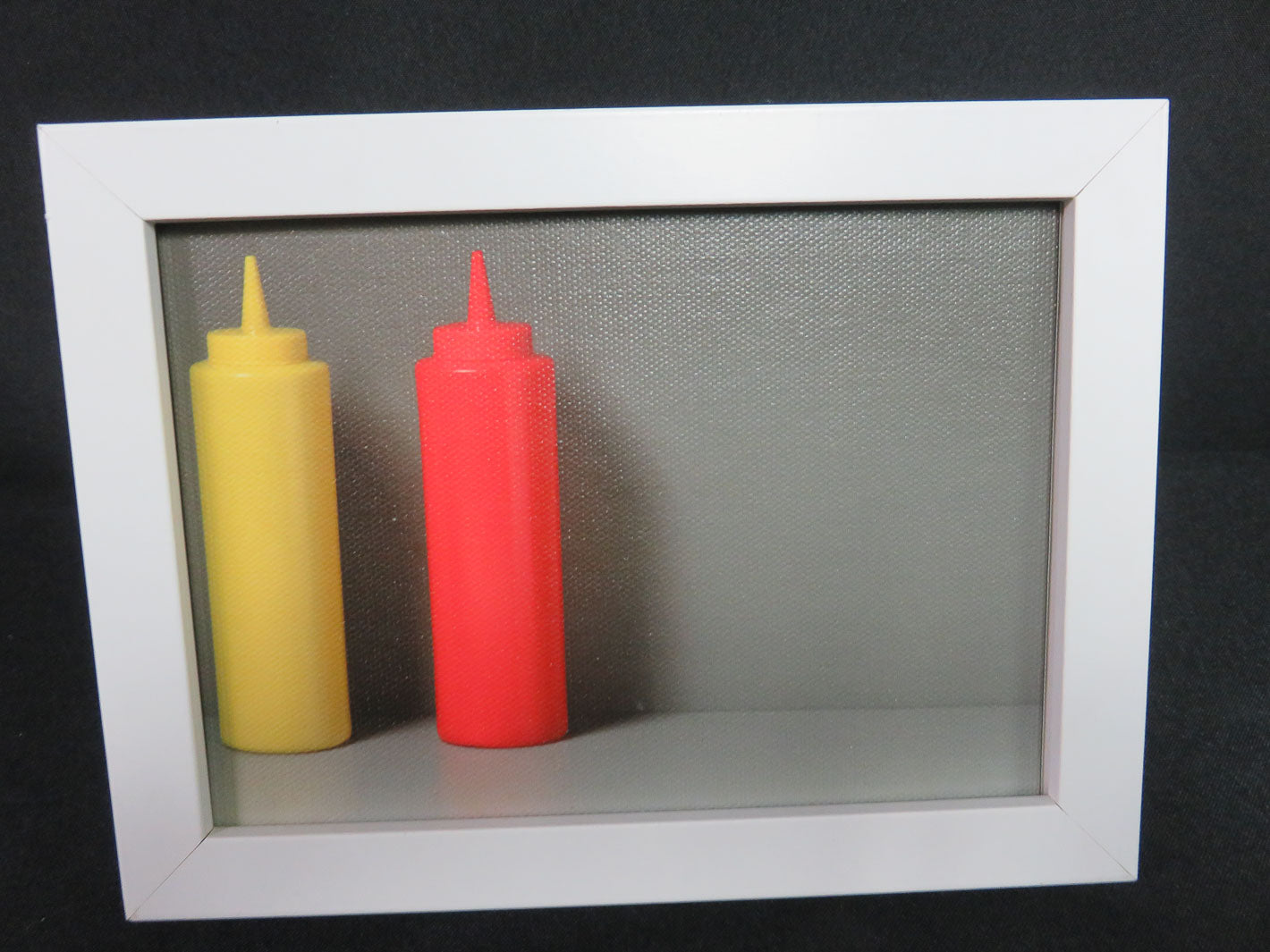 Red Ketchup and Yellow Mustard squeeze dispensers in white frame